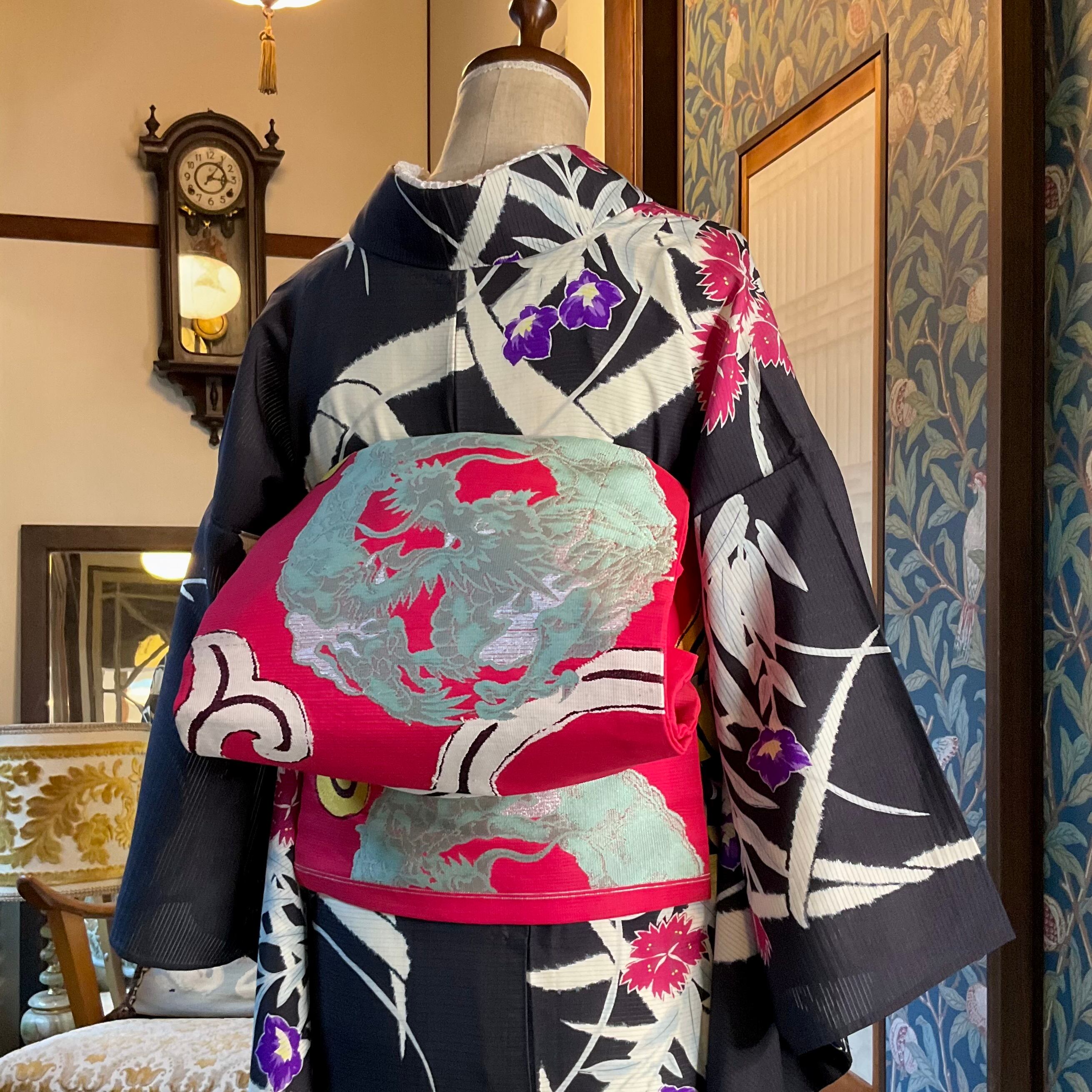 真夏は爽やかな白系の帯で、晩夏や秋口は落ち着いた色やこっくりとした色の帯を合わせてるのもオススメです