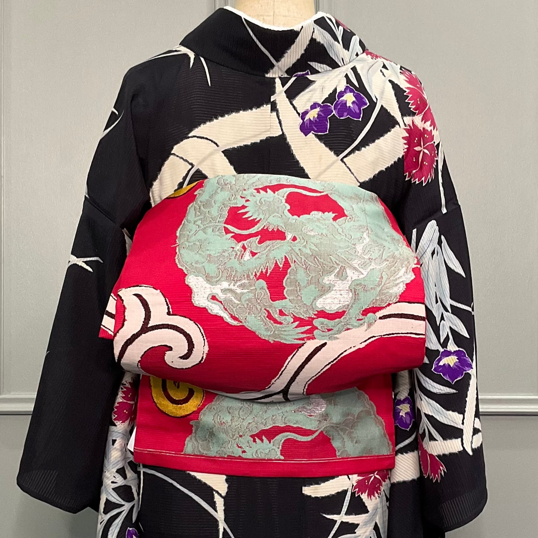 アンティークらしい綺麗な赤に、涼やかな龍の丸紋、黄色と白の唐草の差し色もパキッと目を惹くデザイン*