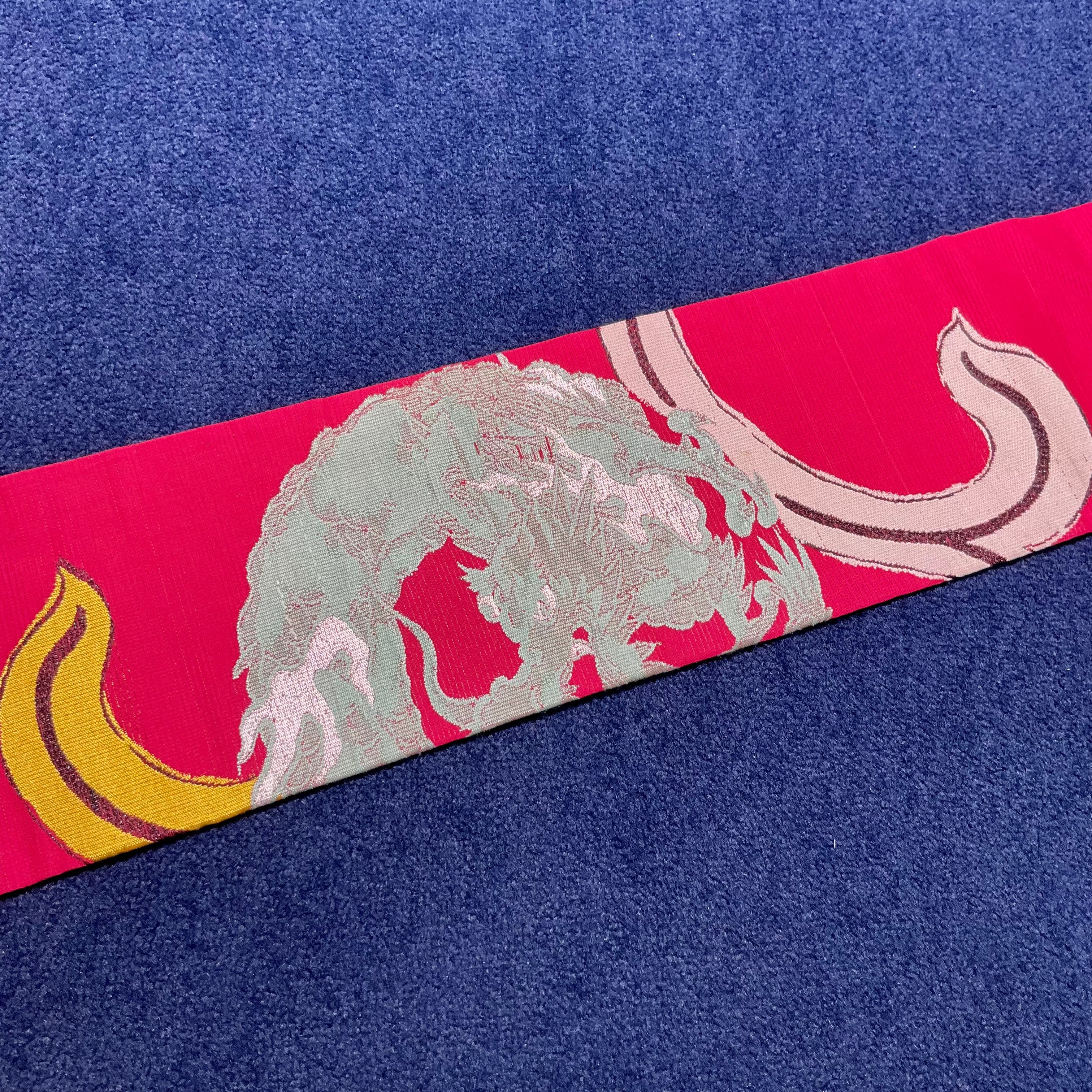 鮮やかな赤い絽の生地に、薄浅葱色の大きな龍紋の織り模様が美しい夏のアンティーク名古屋帯です