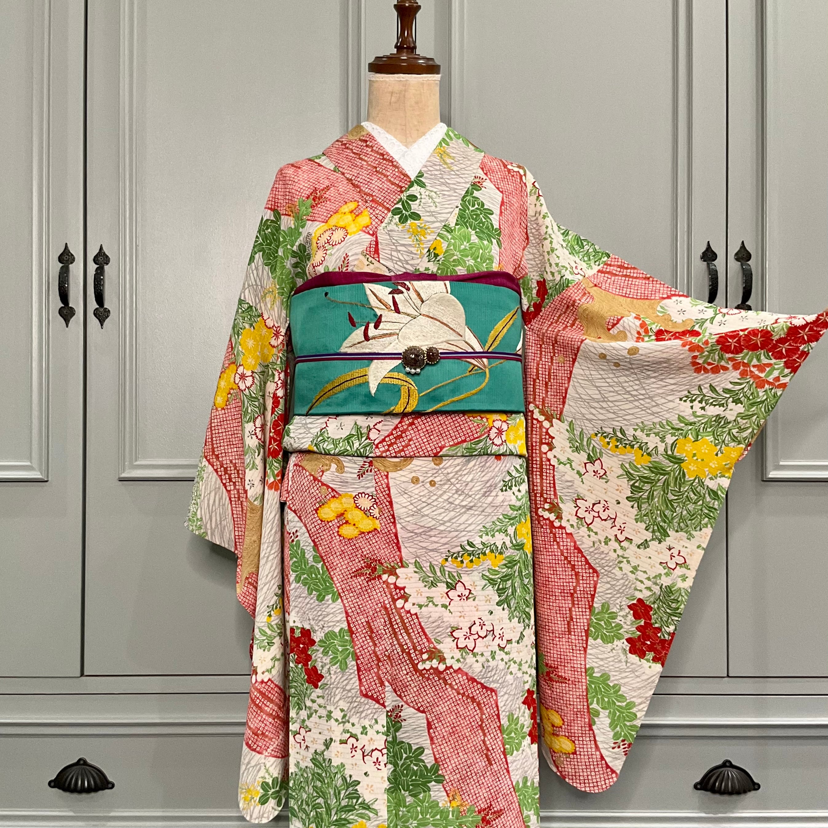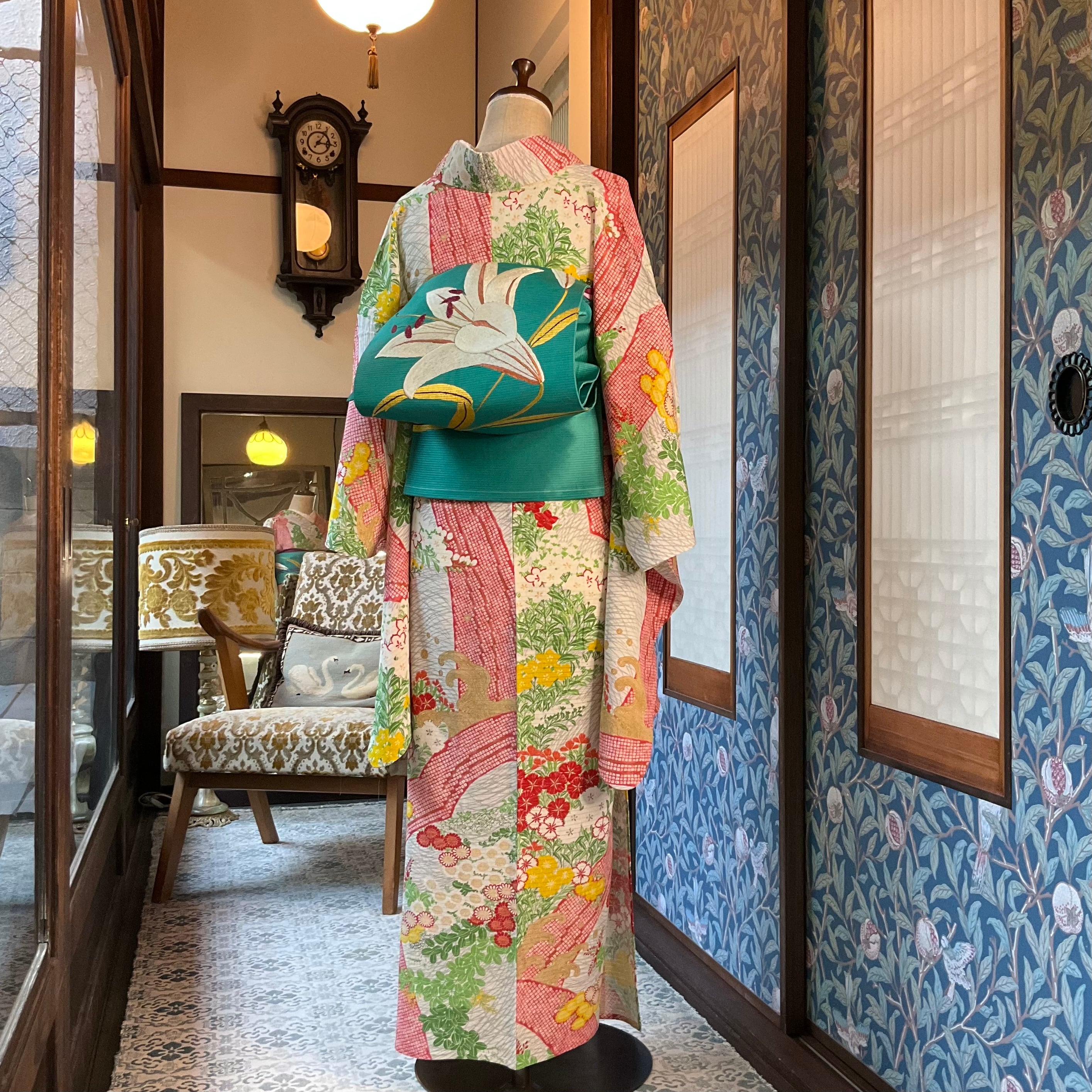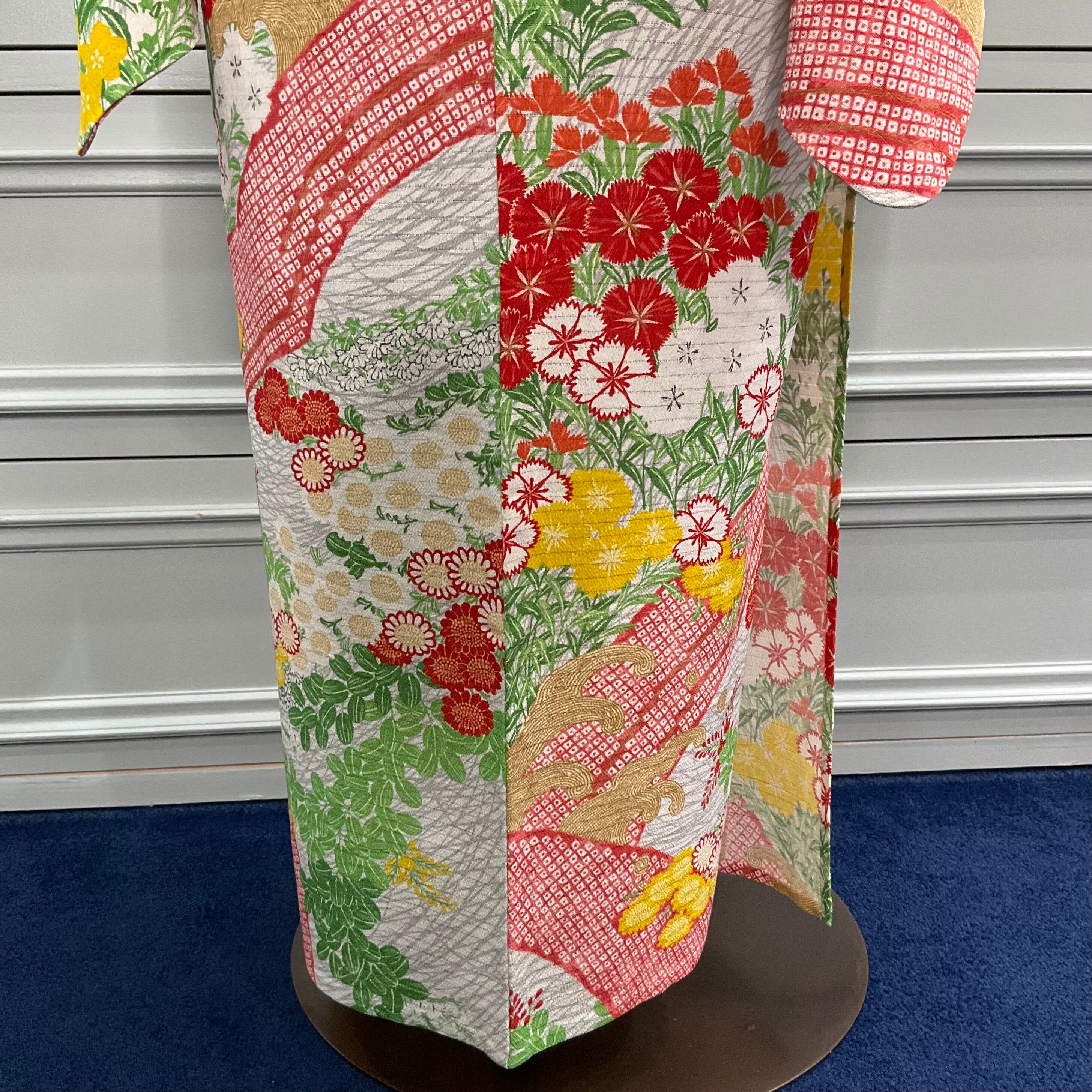 白地の絽縮緬の生地に、撫子や萩、菊の色とりどりの秋草模様が美しいアンティークの夏着物です