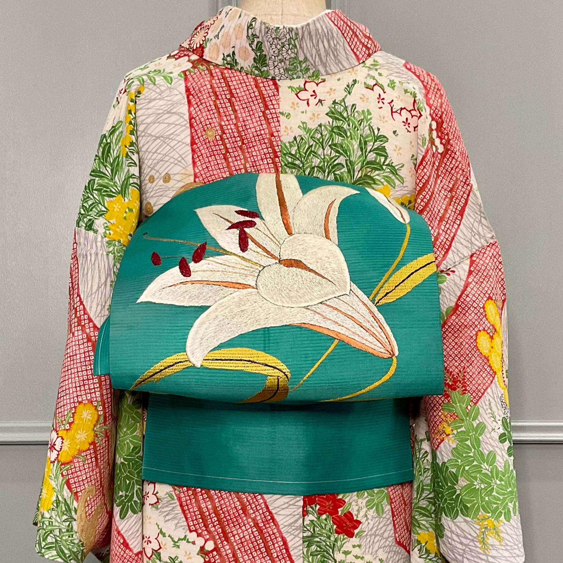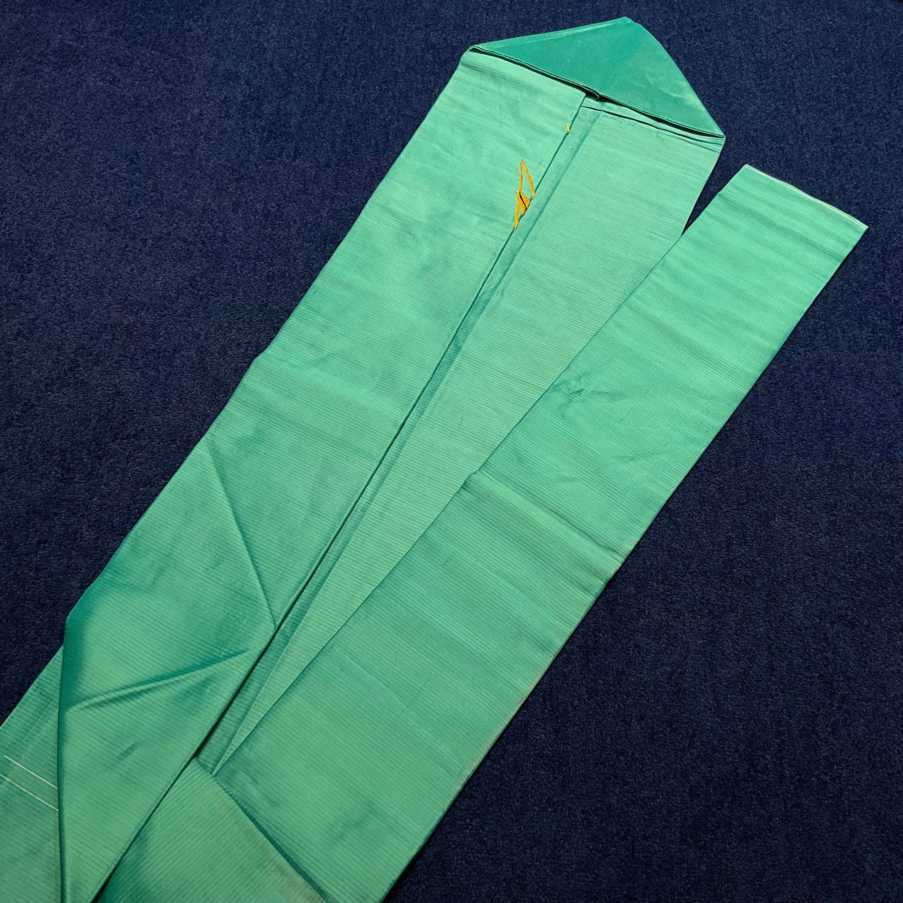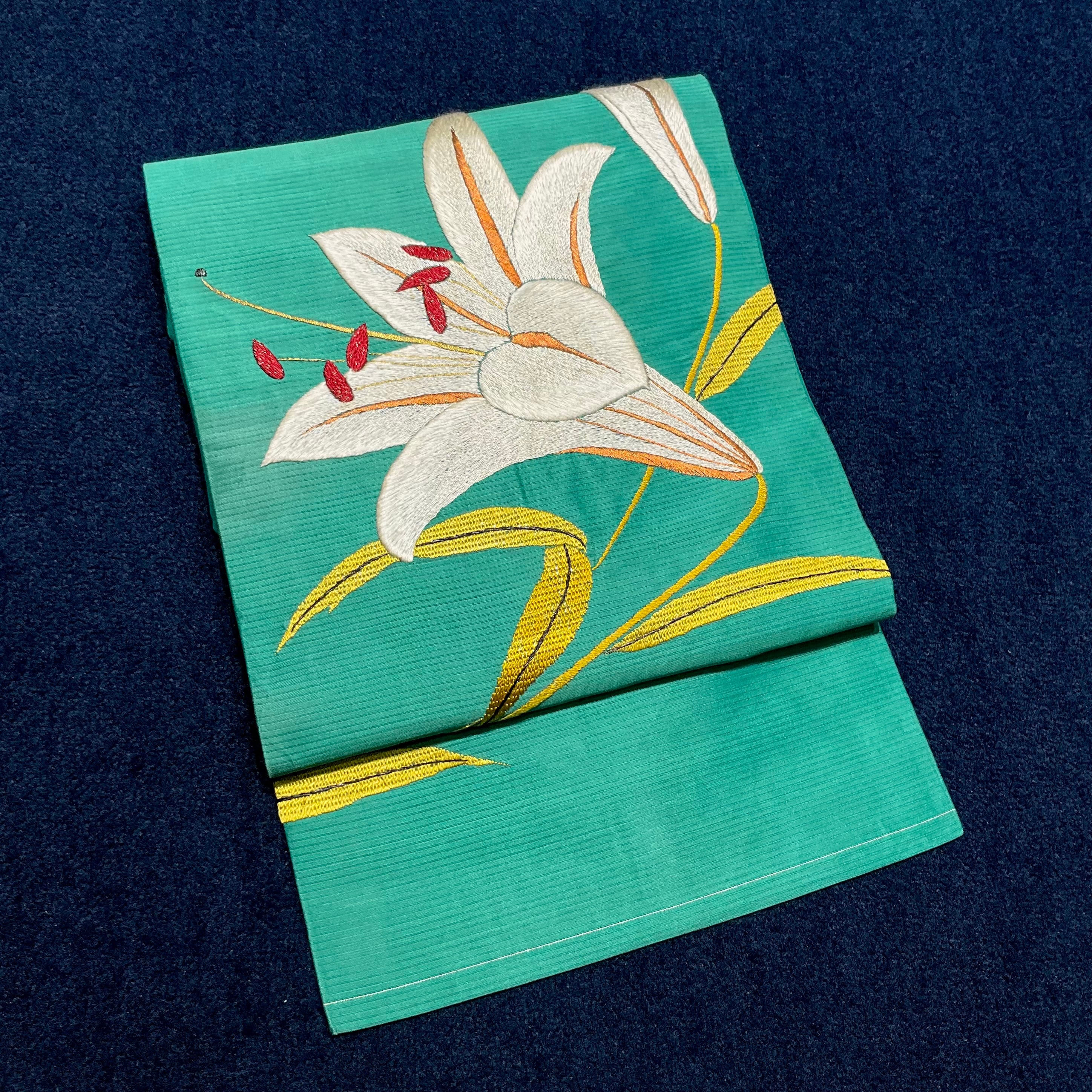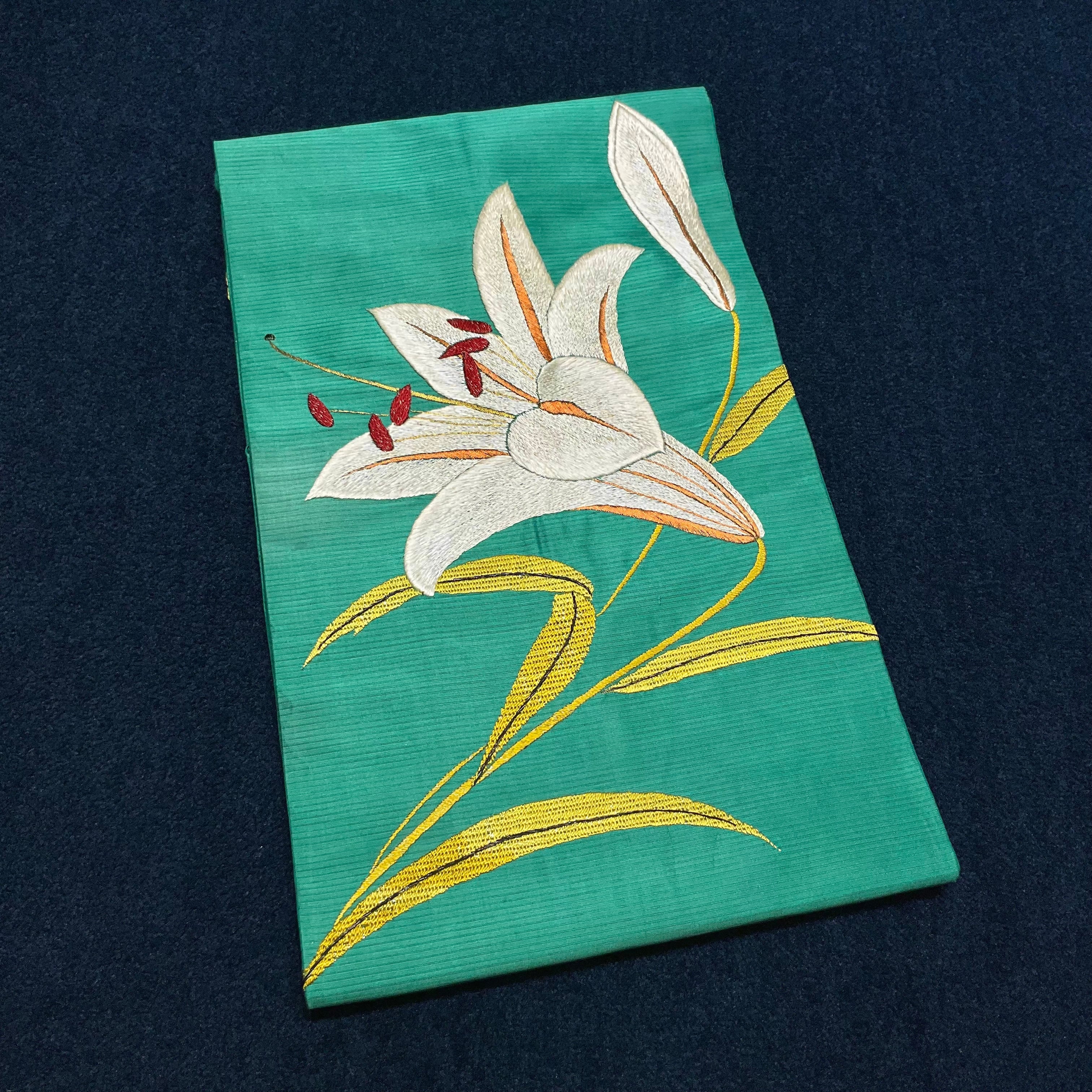 グリーンの絽の生地に、白い百合の刺繍が美しい夏のアンティーク名古屋帯です