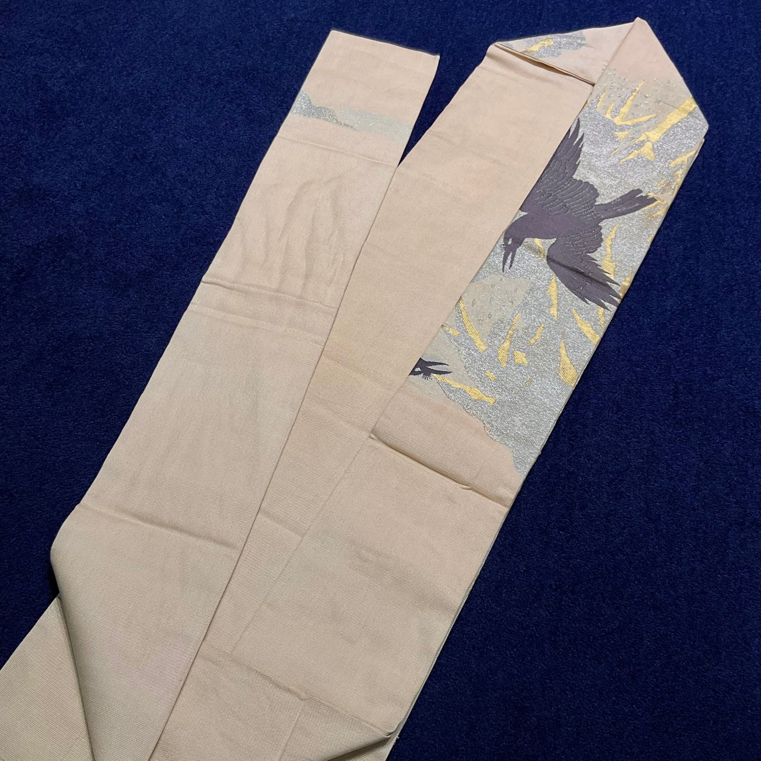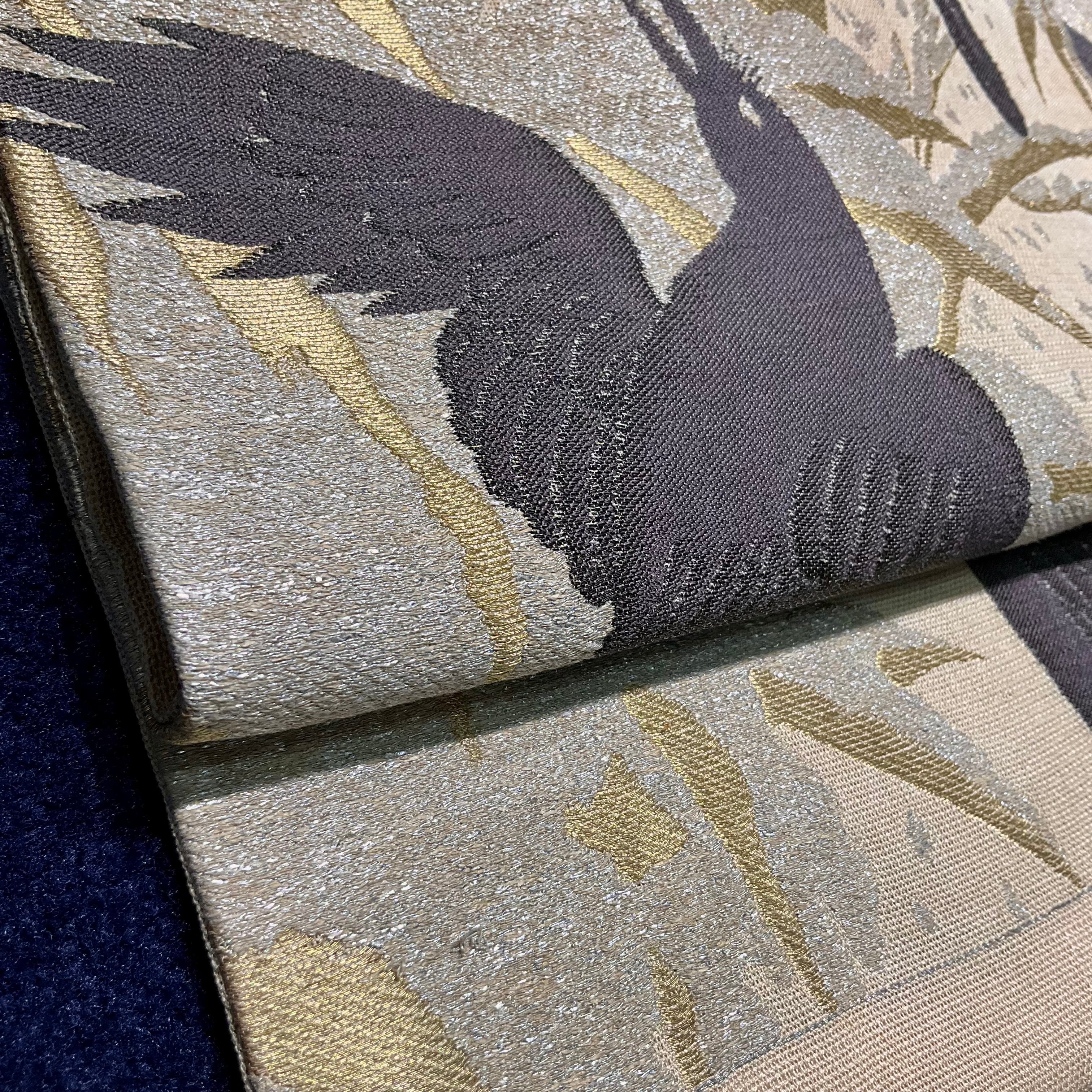 サンドベージュ色の紗の生地に、カラスと雪持ち笹の織り模様がクールな夏のアンティーク名古屋帯です