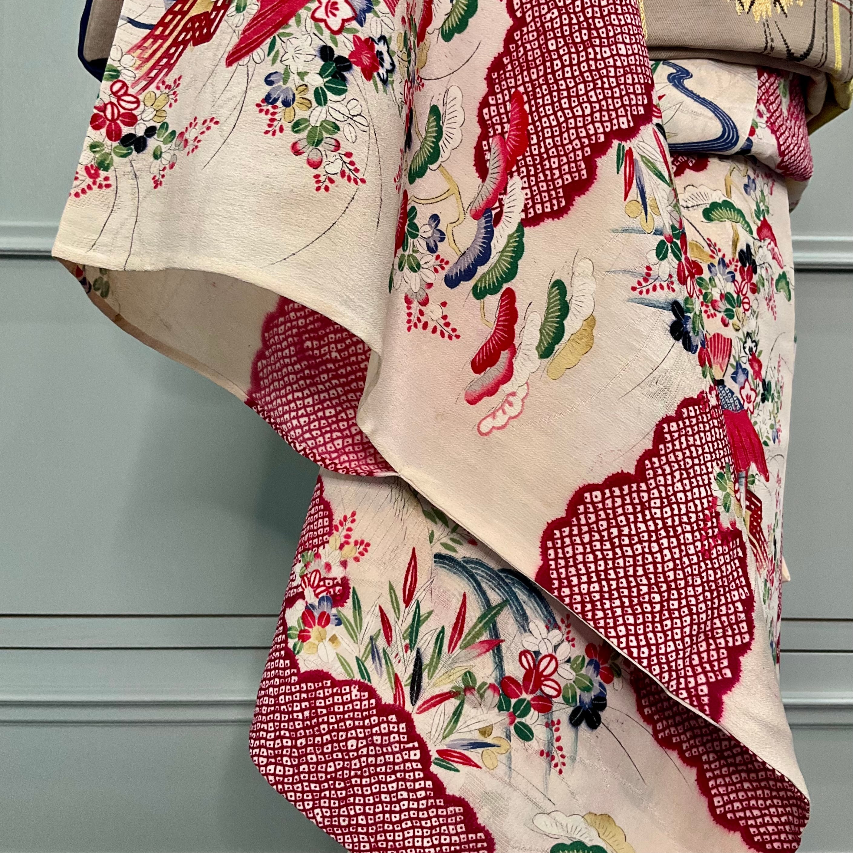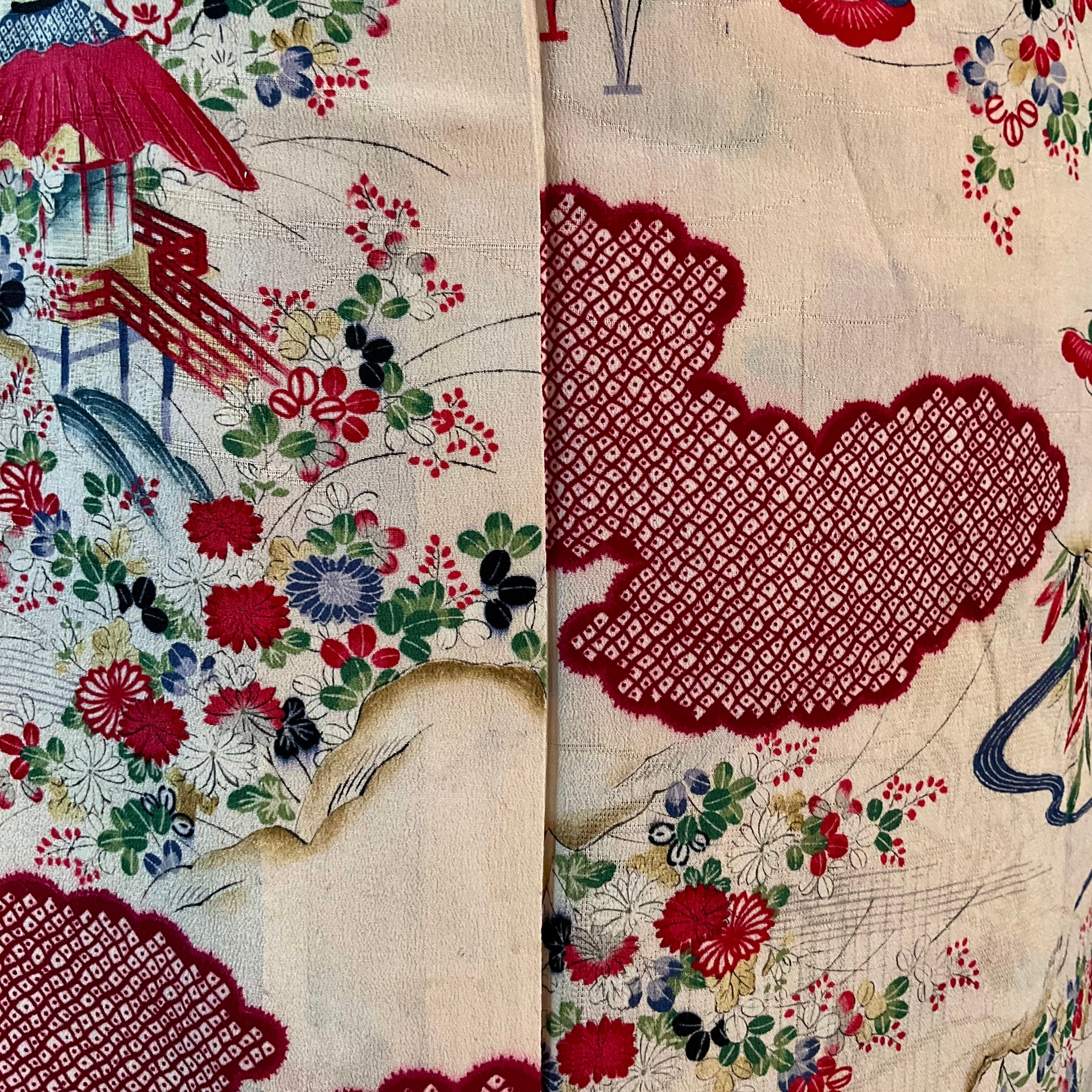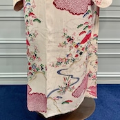 生成り色の地にが紅い雲取り模様、秋の草花が描かれた単衣仕立てのアンティーク小紋着物です