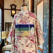 ○合わせたアンティーク昼夜帯、オリジナル帯揚げラベンダー、オリジナル三分紐ピンストライプ ライムグリーン×白もwebshop掲載品です♪
