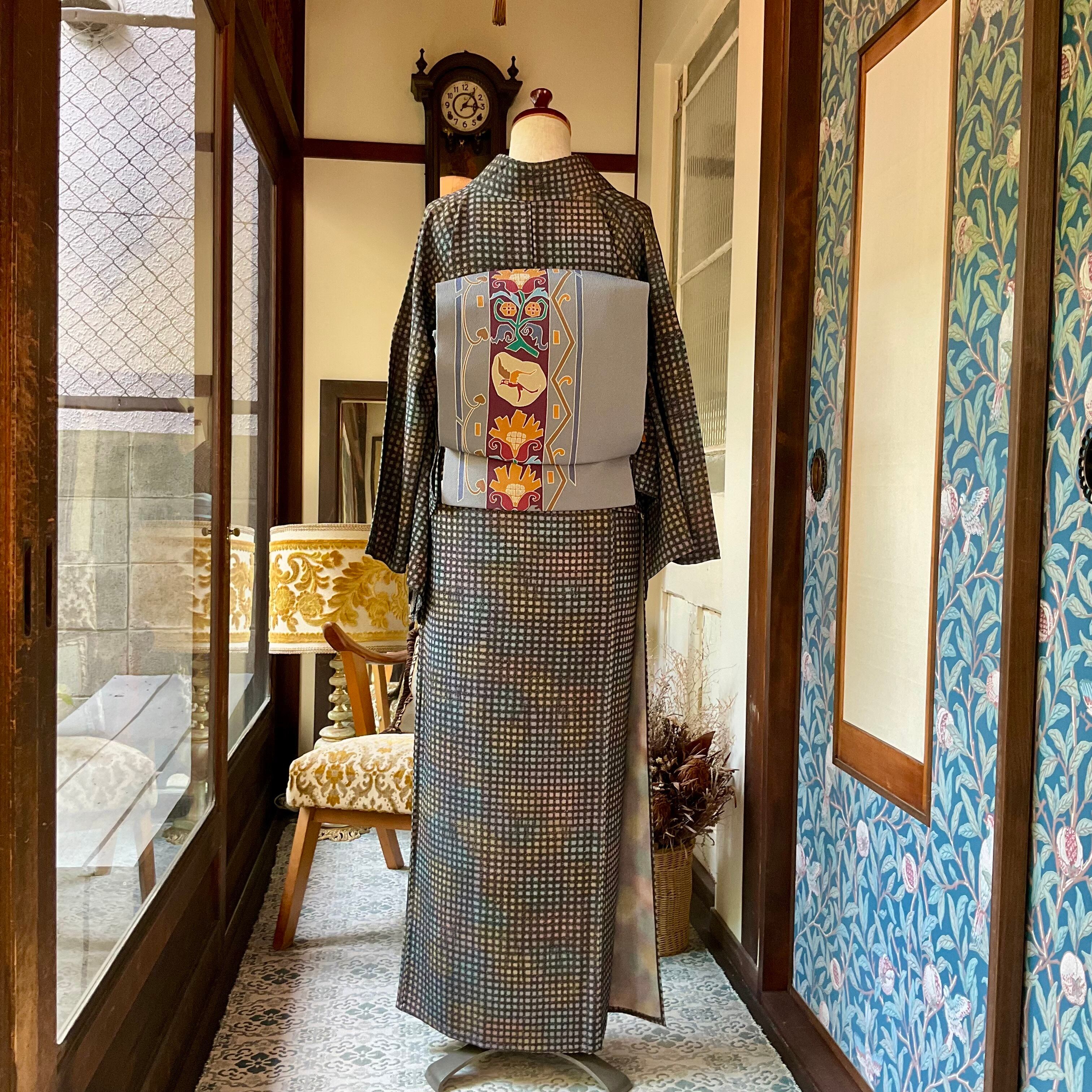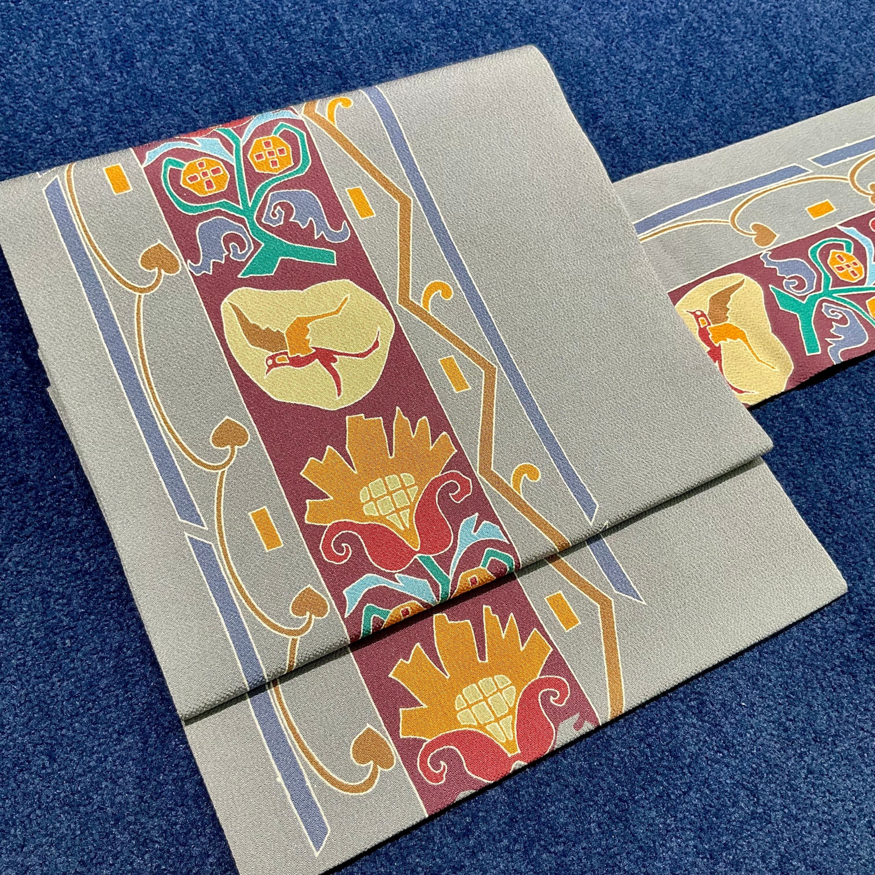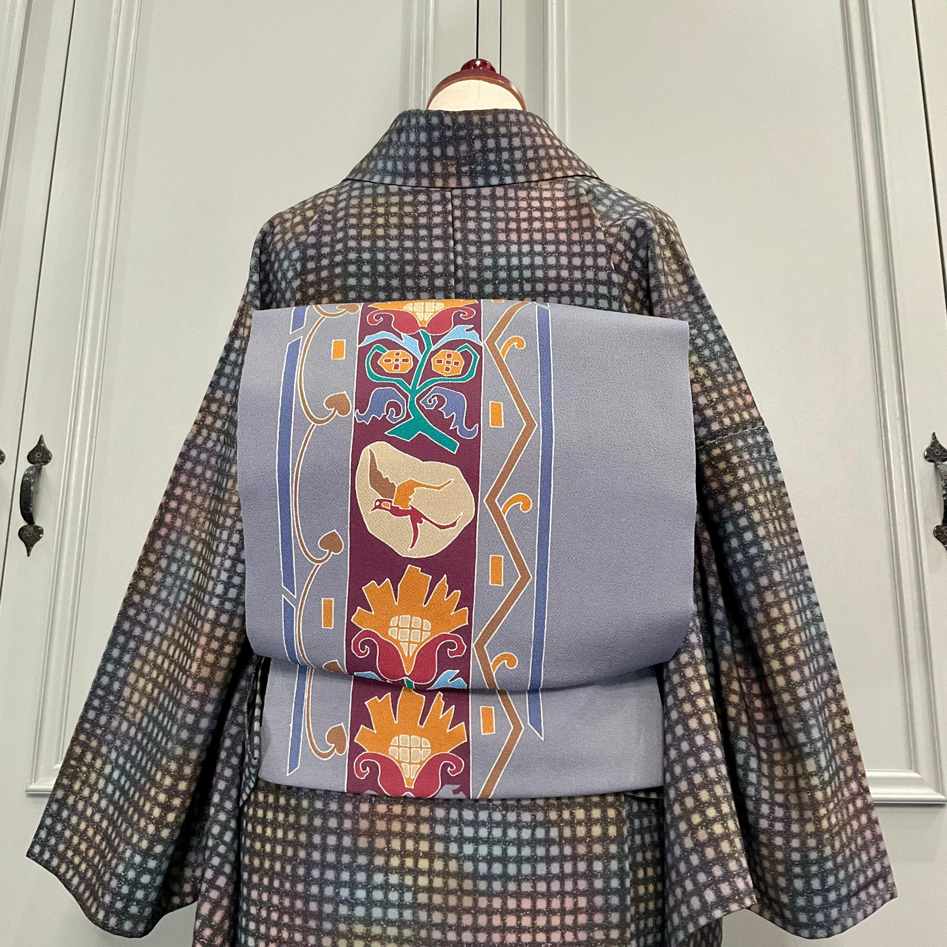 ブルーグレーの地色に幾何学模様や花や鳥が描かれたちょっぴり異国情緒溢れる、ちりめん地の名古屋帯です