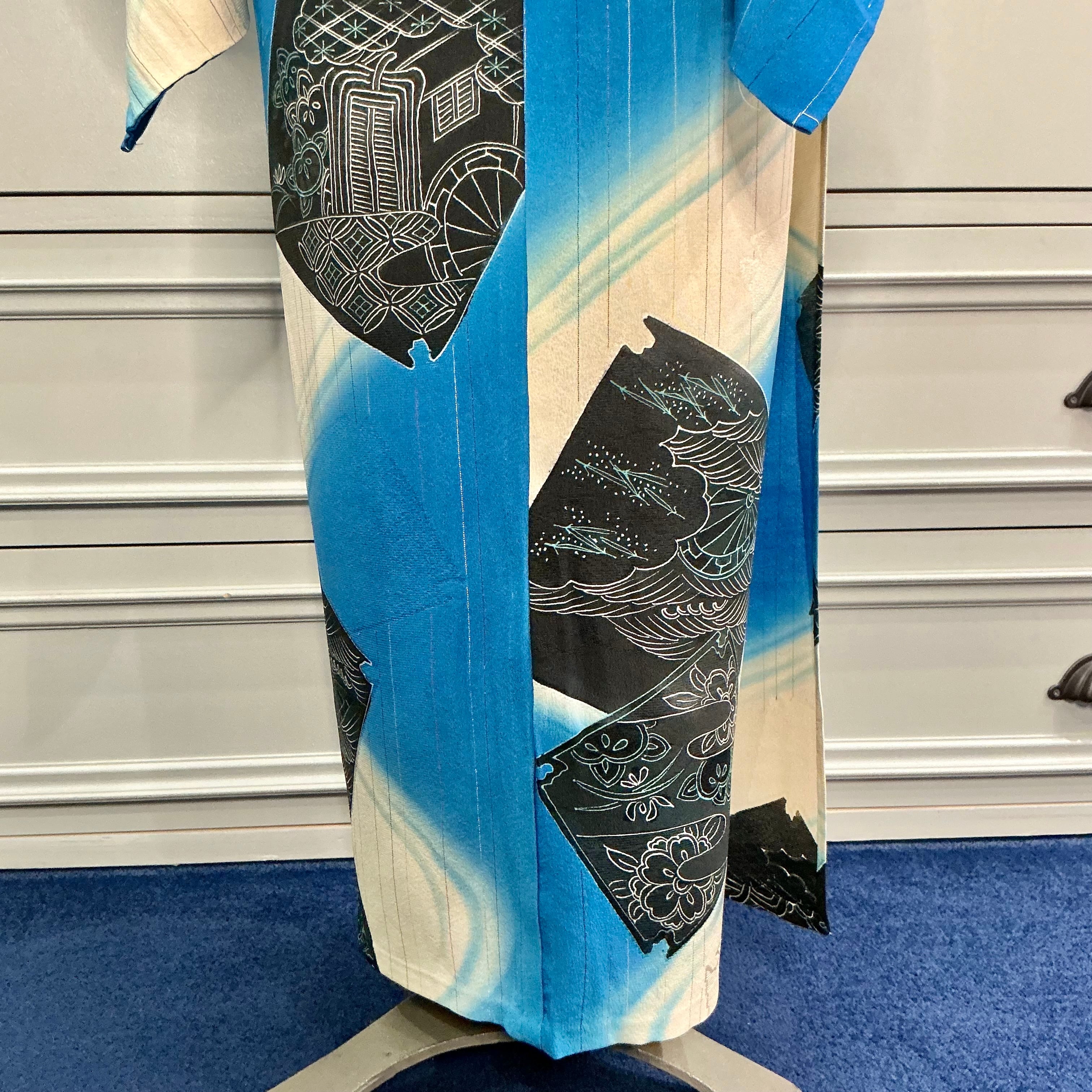 水面に舞う色紙*単衣 ブルー 水色 墨黒 色紙 銀通し 御所車 アンティーク小紋着物 B242