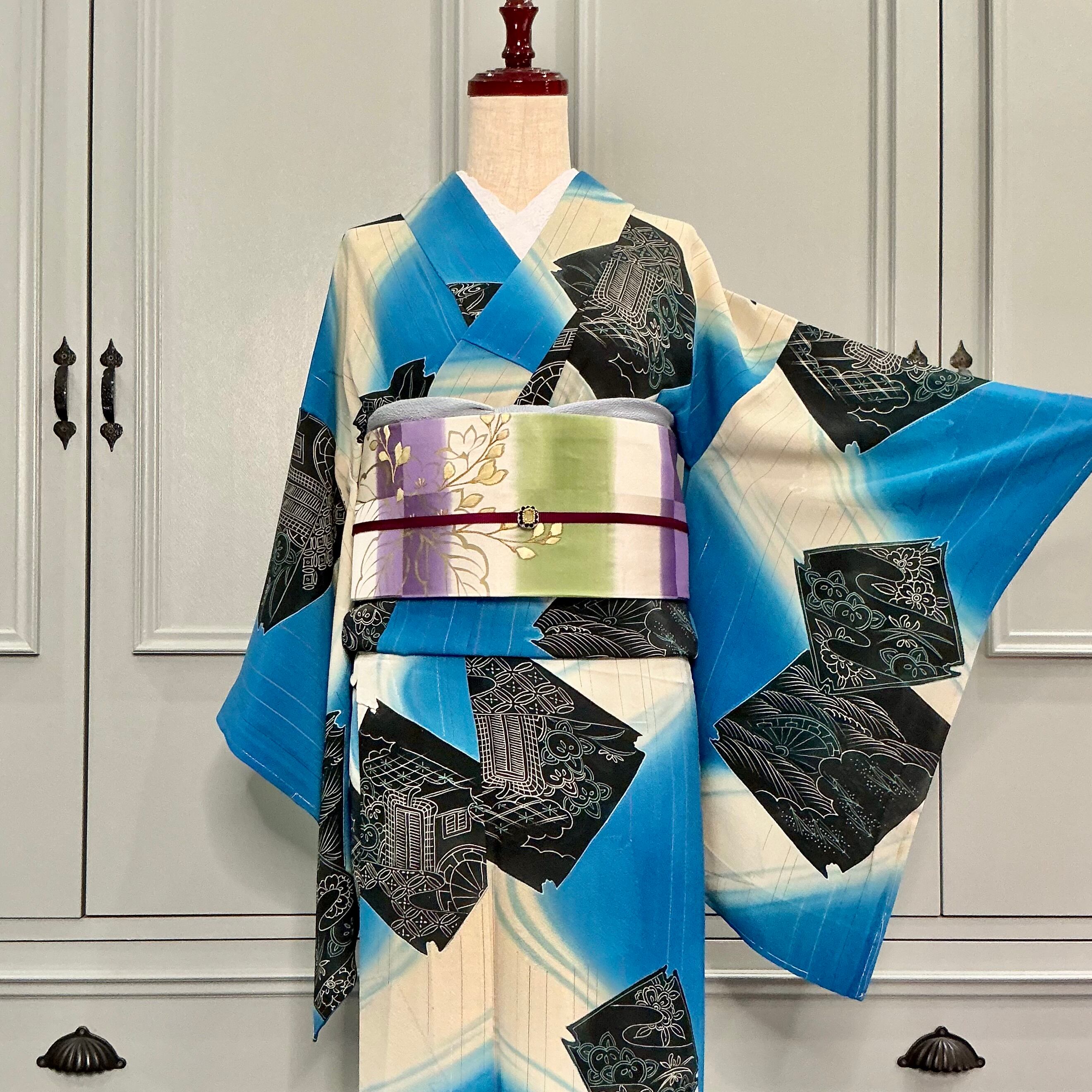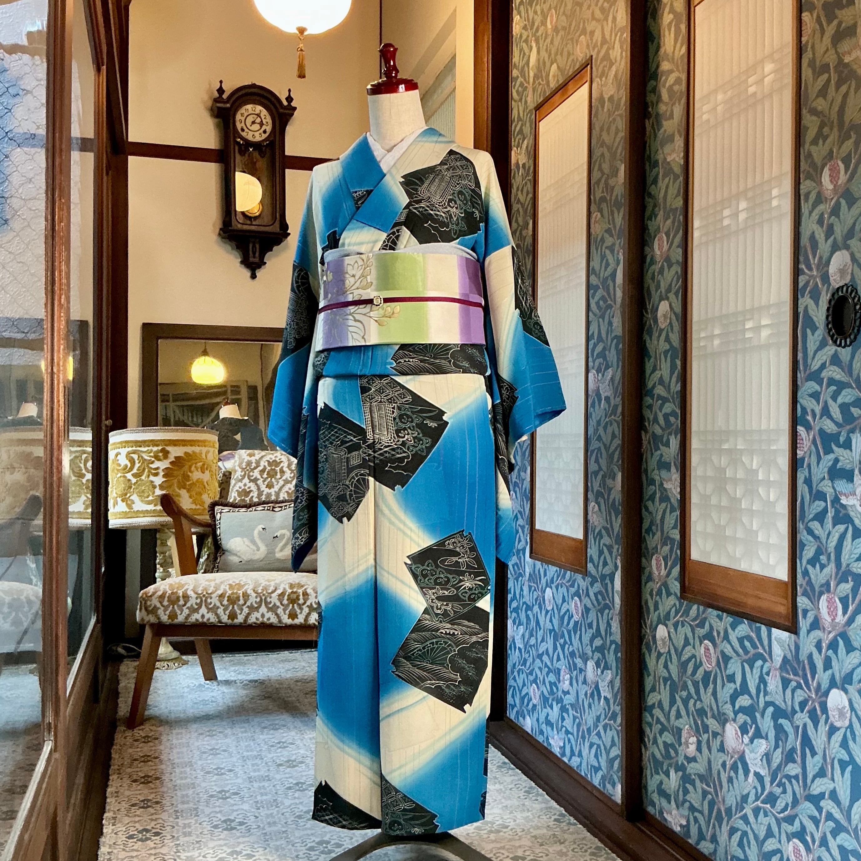 ブルー×アイボリー地に、墨黒の色紙模様がおしゃれな単衣のアンティーク小紋着物です