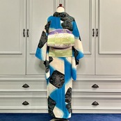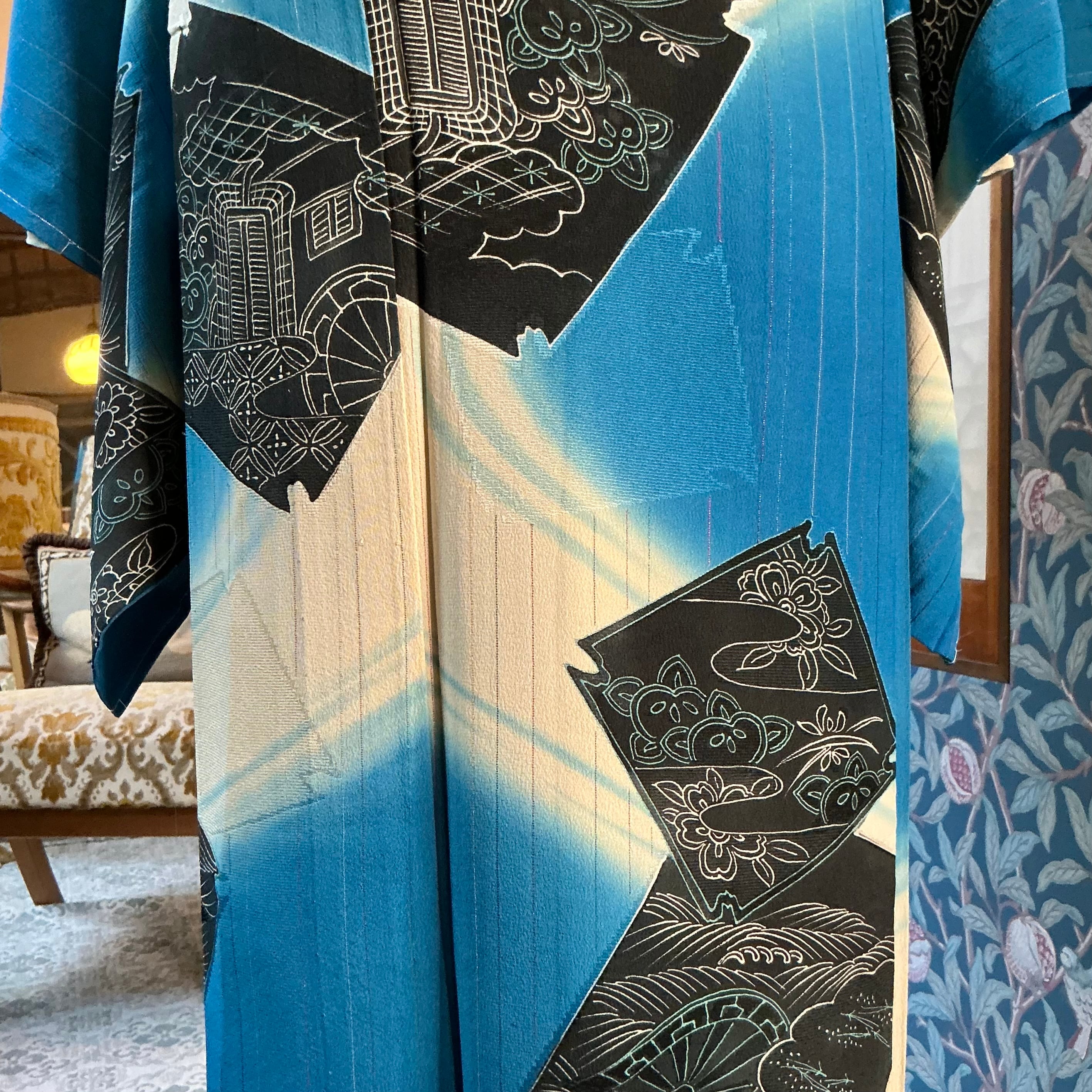 まるで水面のような綺麗なブルーに、古典的な模様が描かれた黒い色紙が舞い散る情緒のある一着
