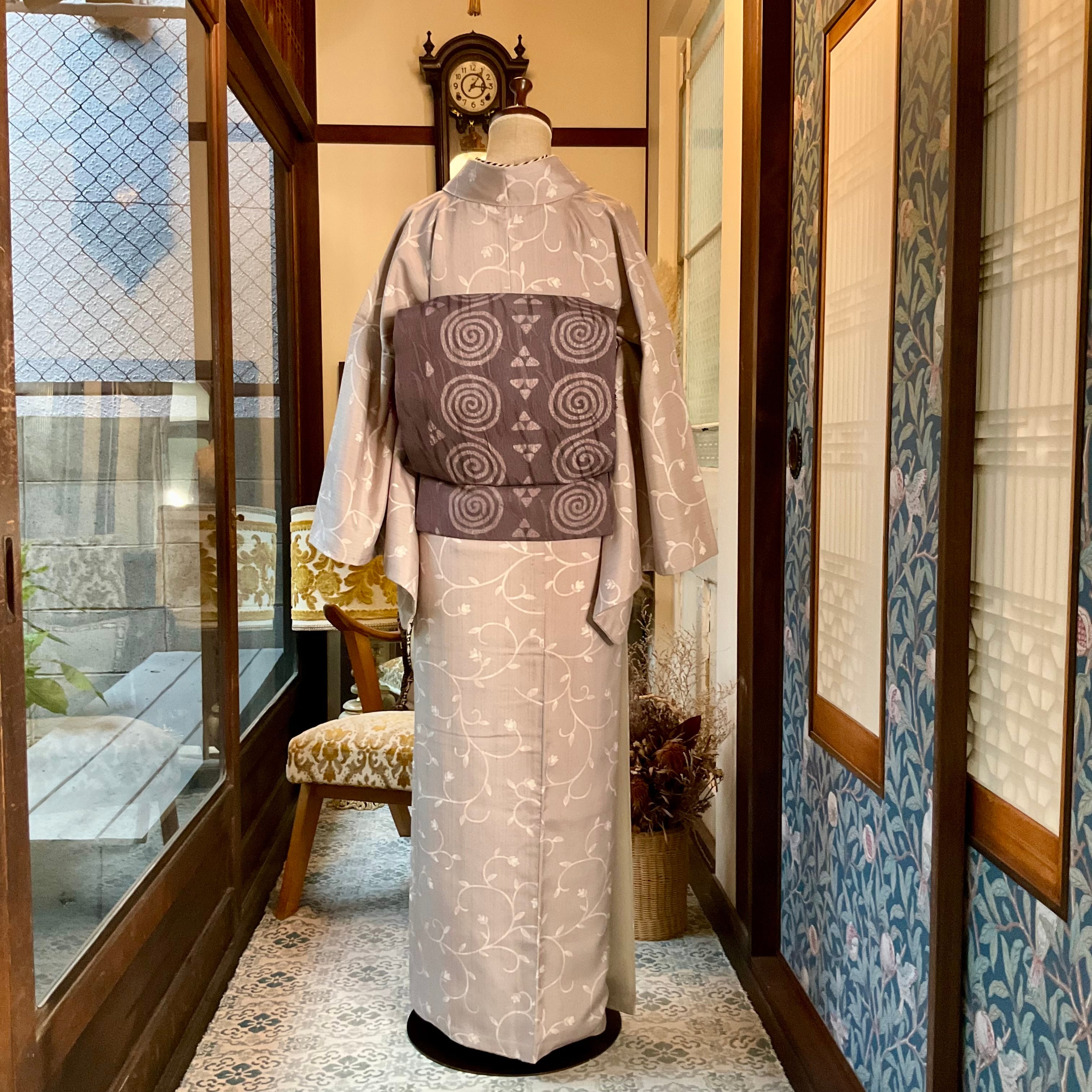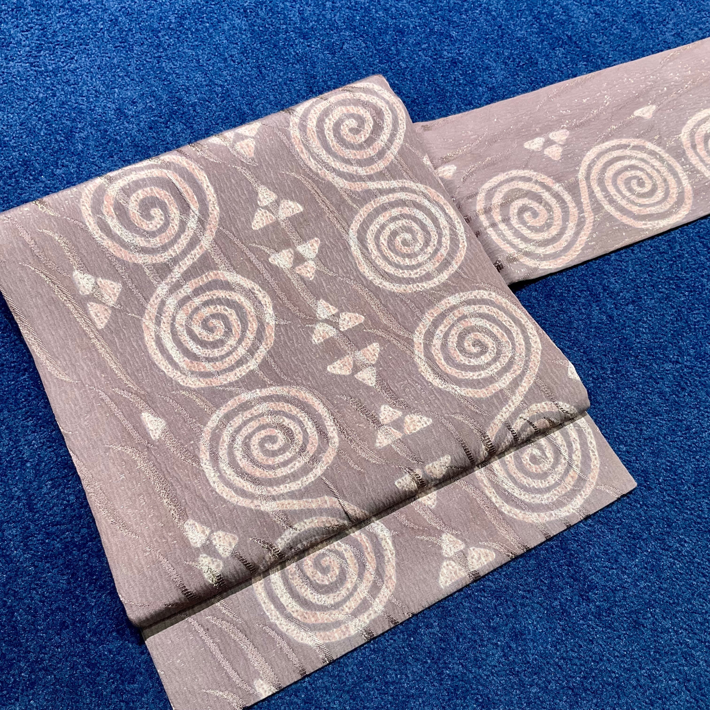 葡萄鼠色の地色にぐるぐるの渦巻きとさんかくのデザインが洒落た名古屋帯です