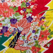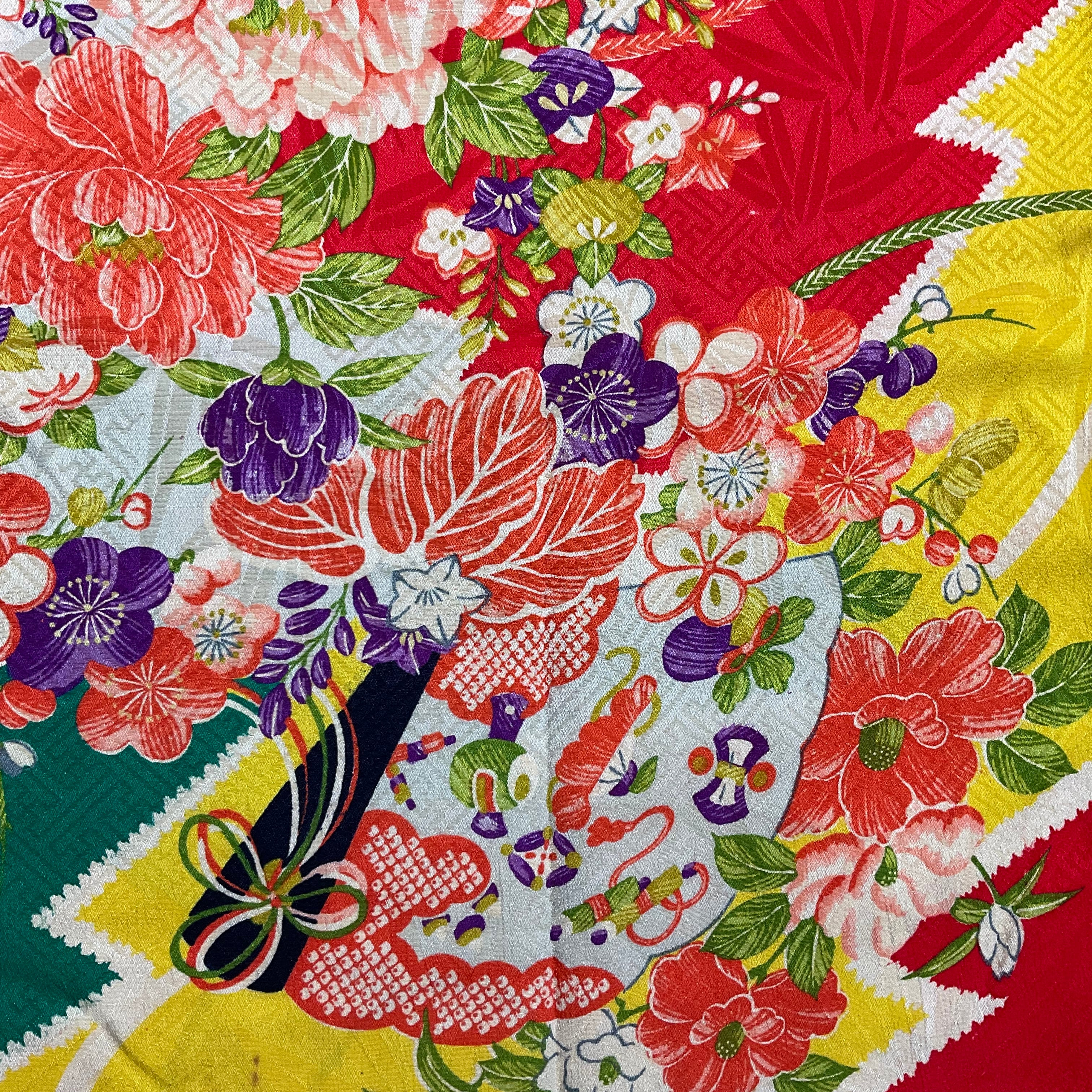 黄色×緑×赤の松皮菱模様の地に、朱色や紫などのお花で彩られた扇子や鼓など、縁起の良いデザインが華やかな一枚✨