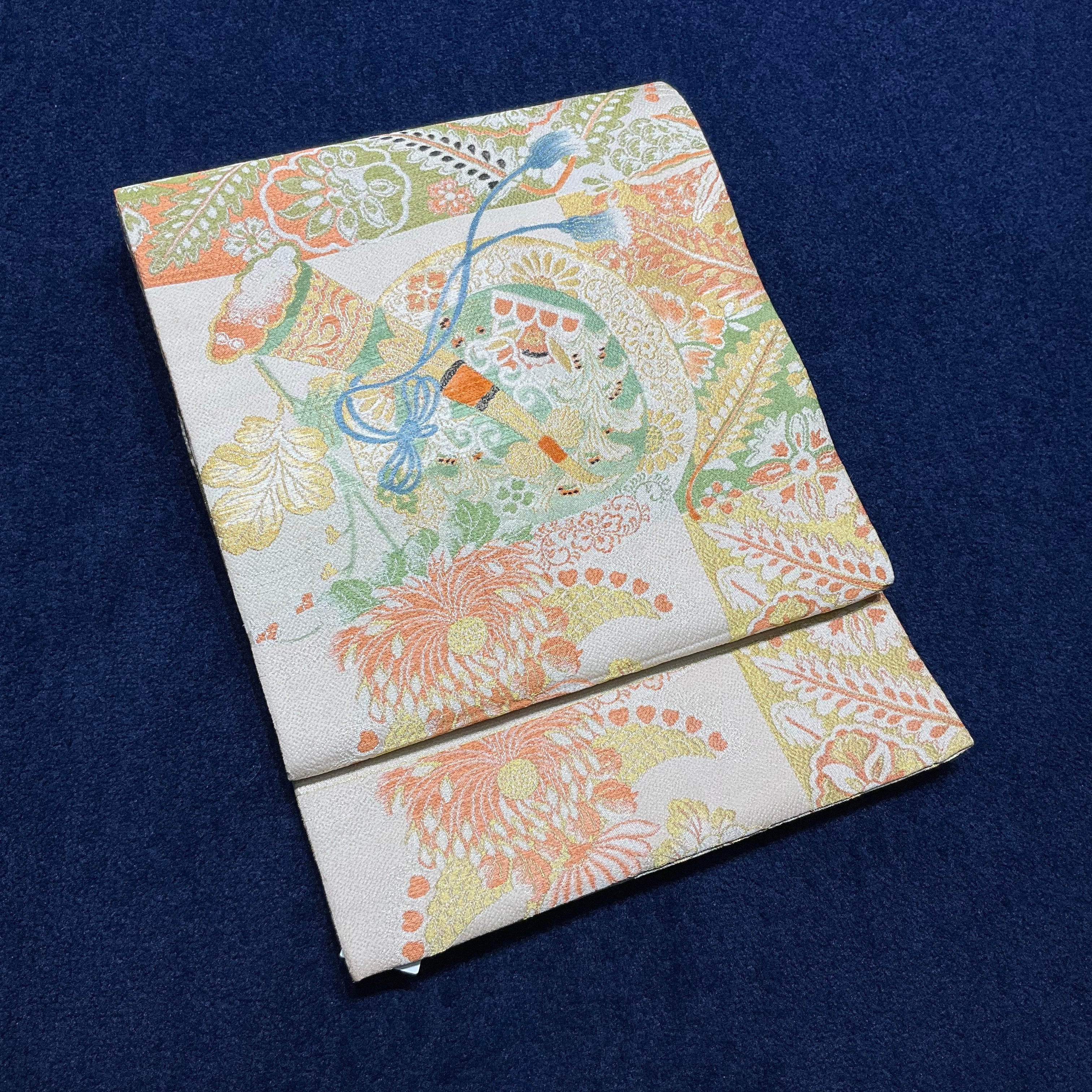 生成り地に、ラッパ、菊、唐花の織模様がお洒落なアンティーク丸帯です