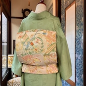 グリーンやオレンジのやわらかい色合いの中に、金糸が織り込まれており、ほんのり煌めく色合いが素敵です✨️
