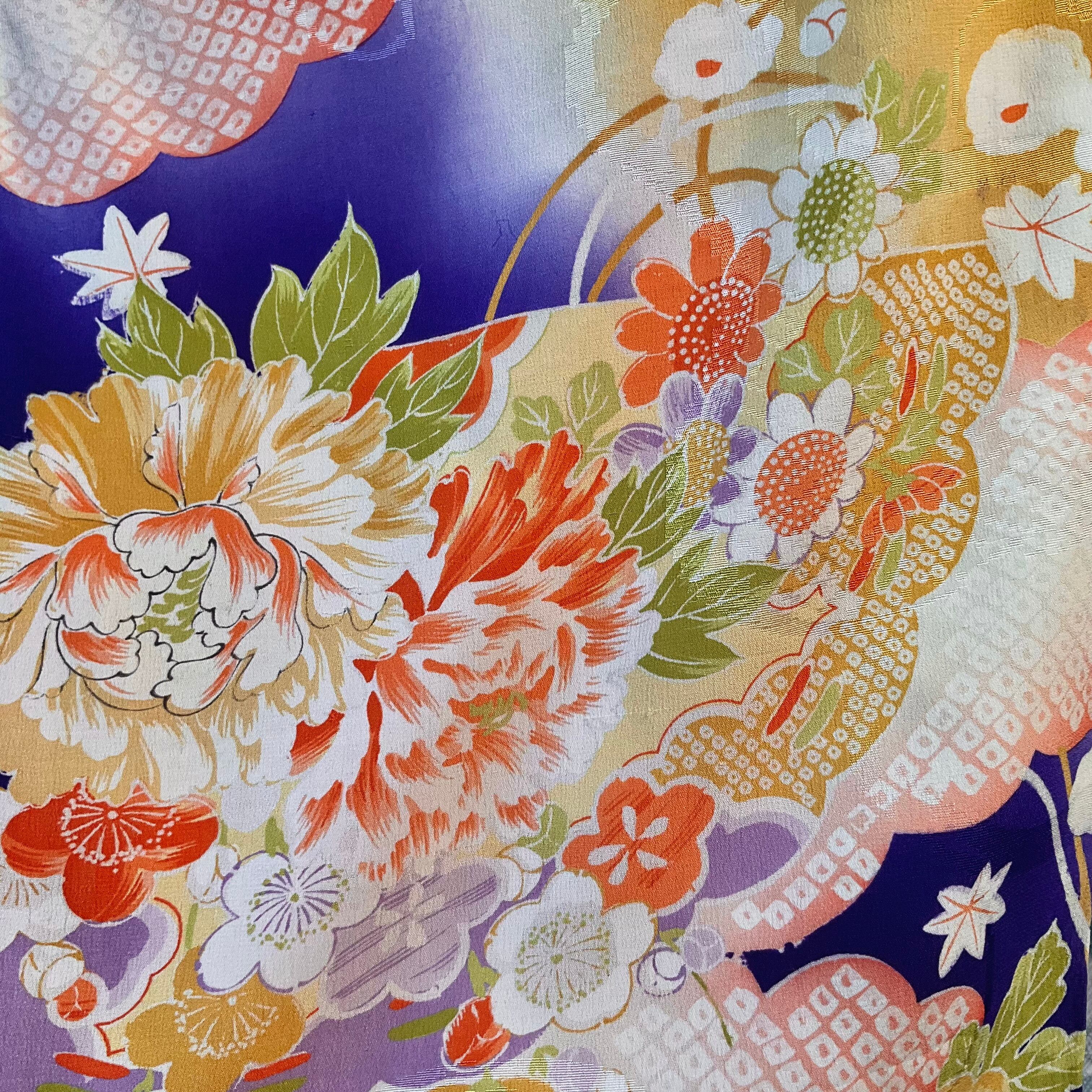 山吹×橙×紫紺の暈し地に、鹿の子の雲取り模様、牡丹や菊などの四季のお花、扇子、鼓など、上品な華やかさが心ときめく一着✨