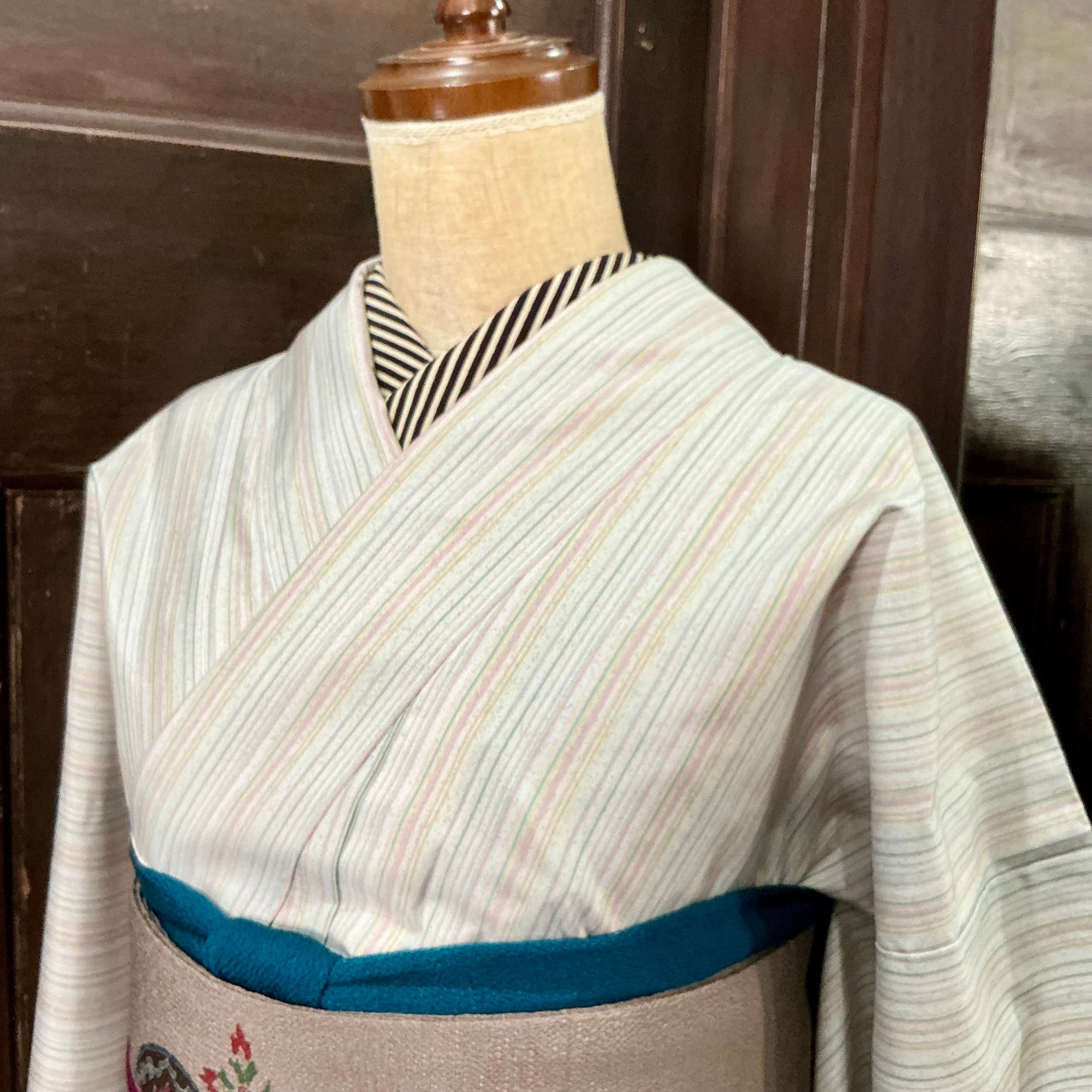ごく淡いグリーンの地色にマルチカラーの縞模様が粋な紬着物です♪