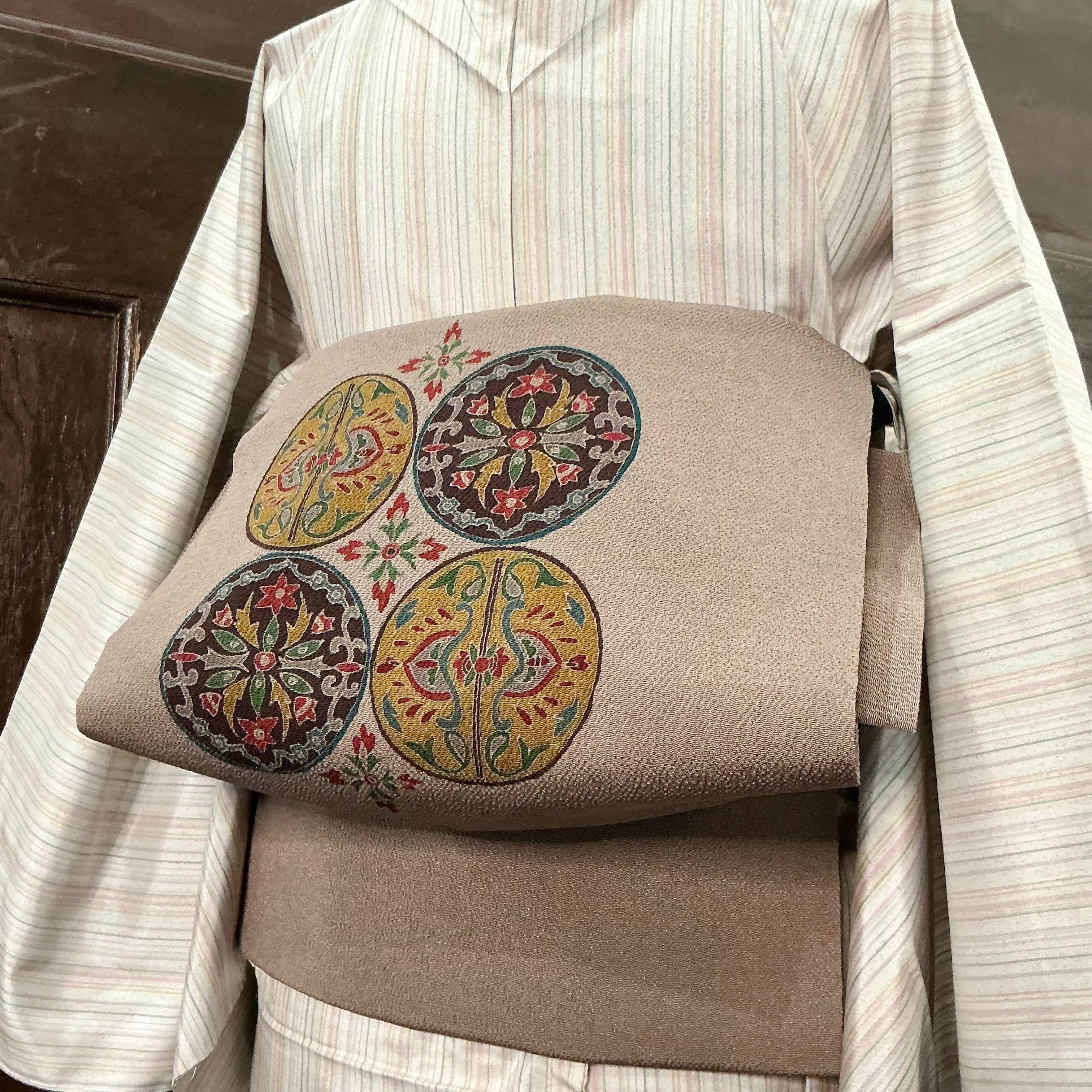 パープルグレーの地色に丸く花模様のモチーフが描かれたちりめん地の名古屋帯です
