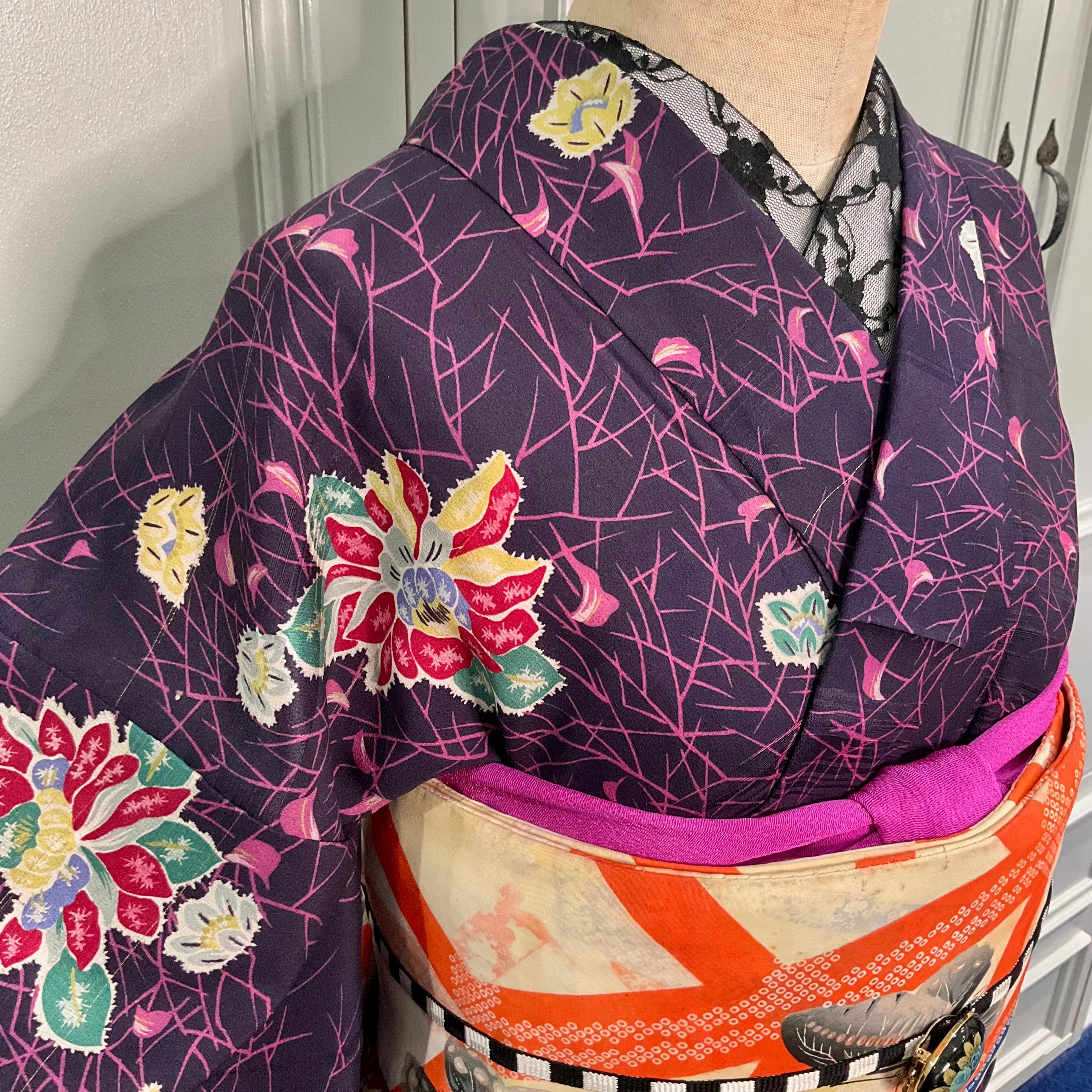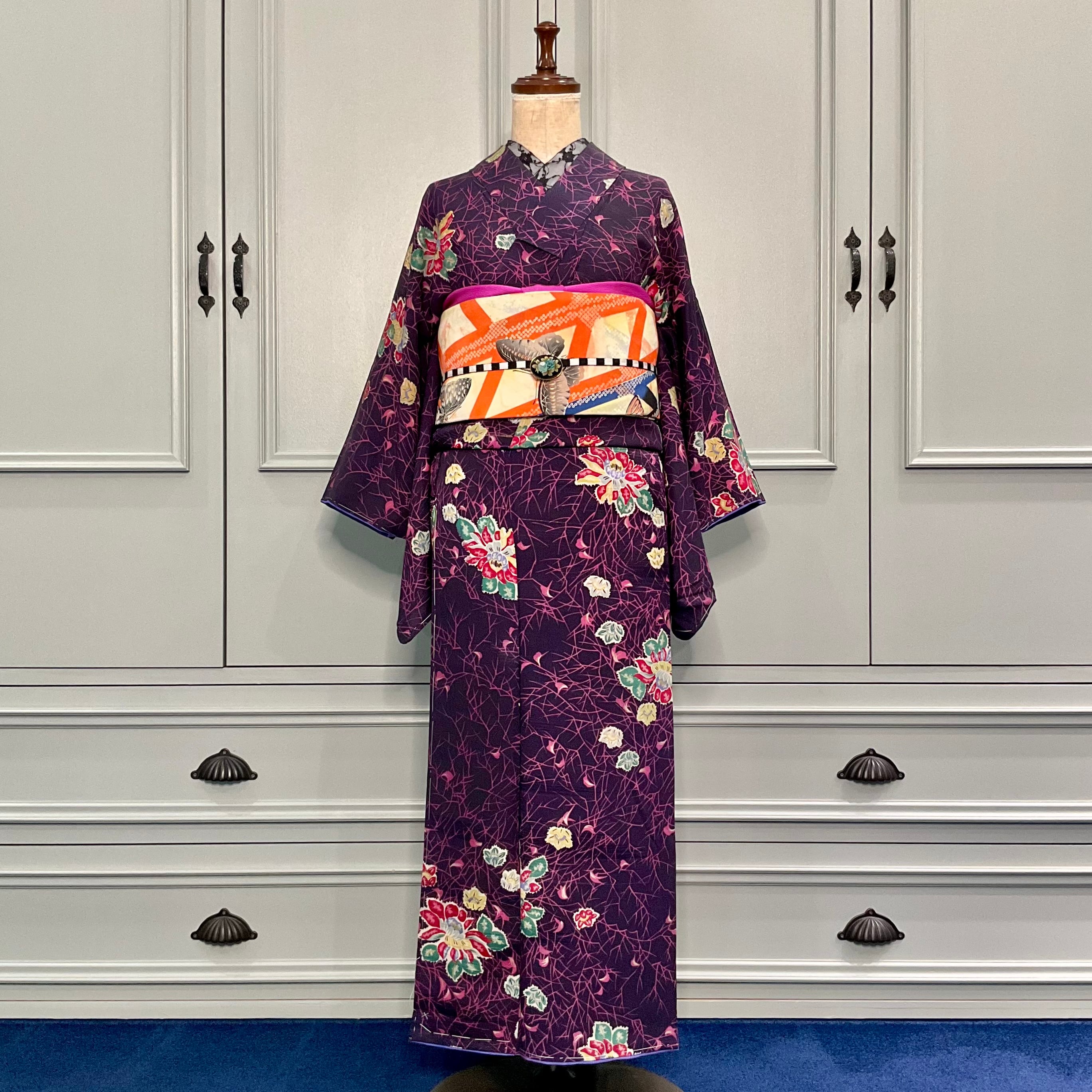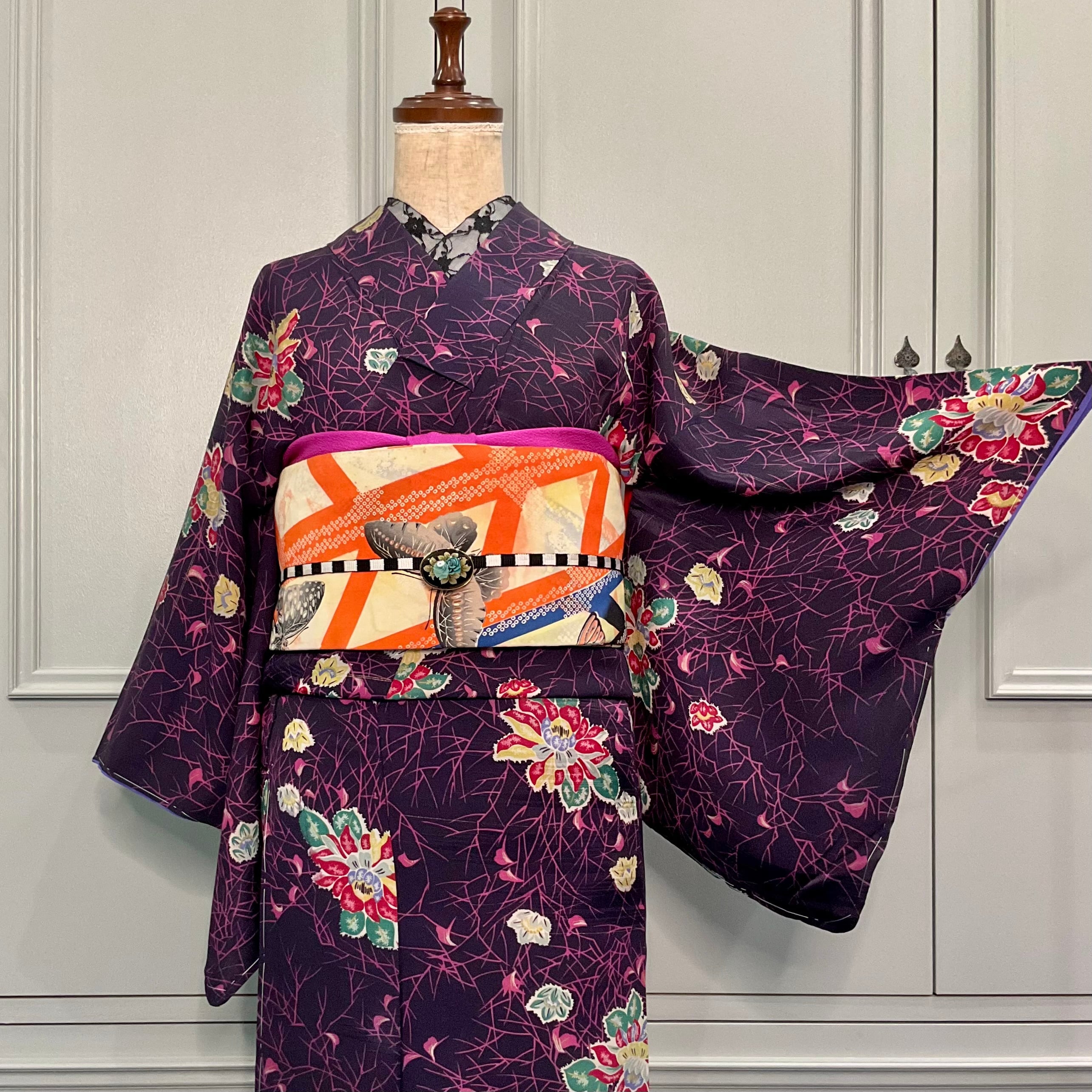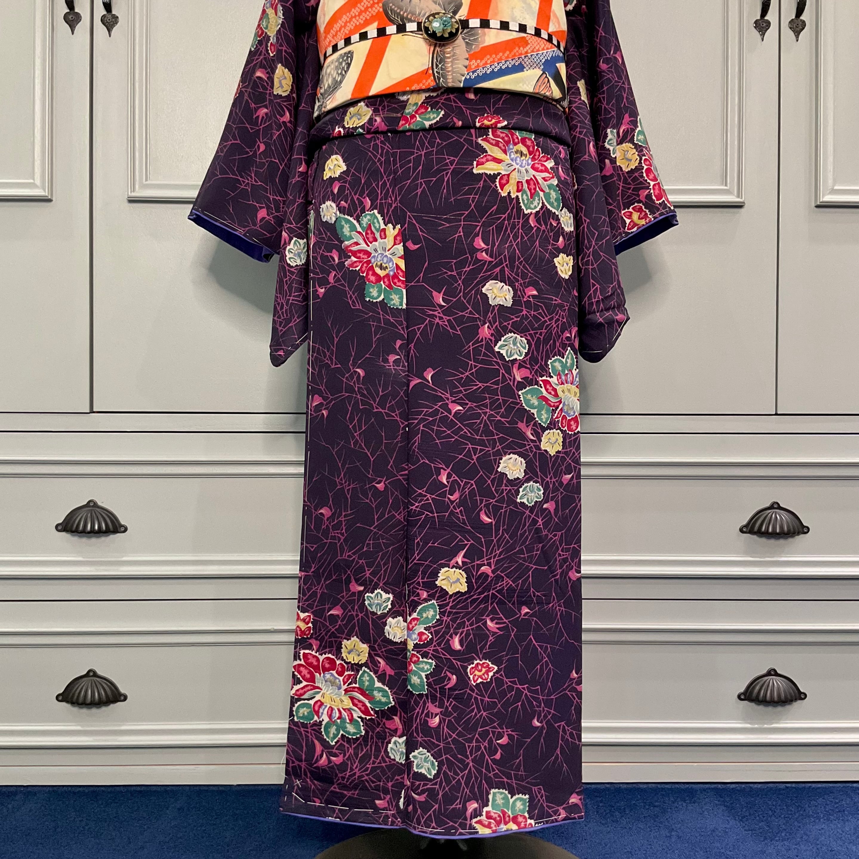 Dark Forest*ブラック ハロウィンカラー 黒地 花 蜘蛛の巣 アンティーク小紋着物 B272