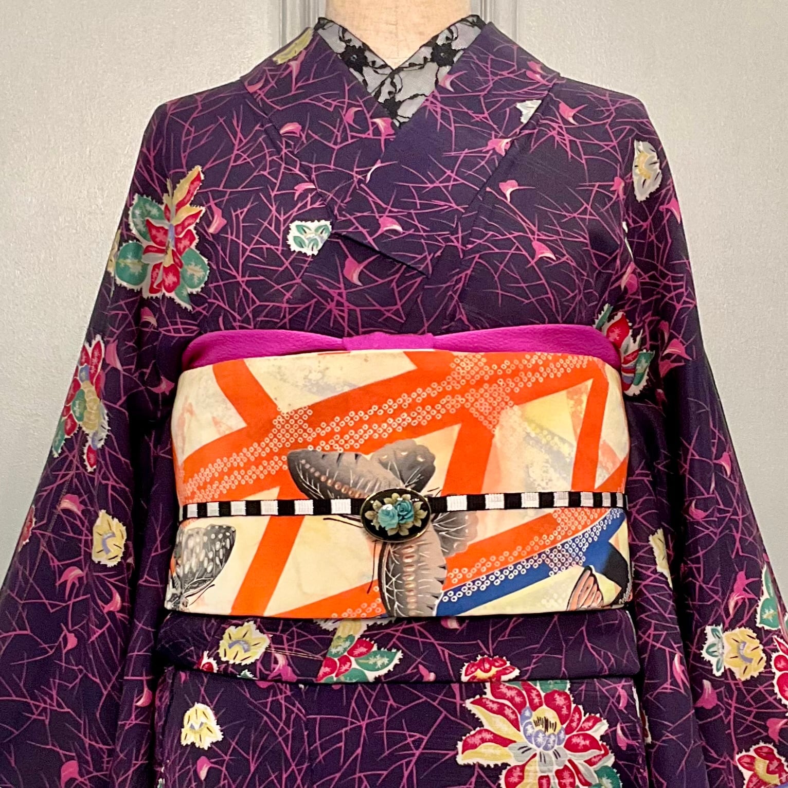 黒系の色も使われているので、ダークな色の着物や小物とも相性抜群です♩
