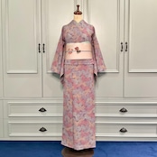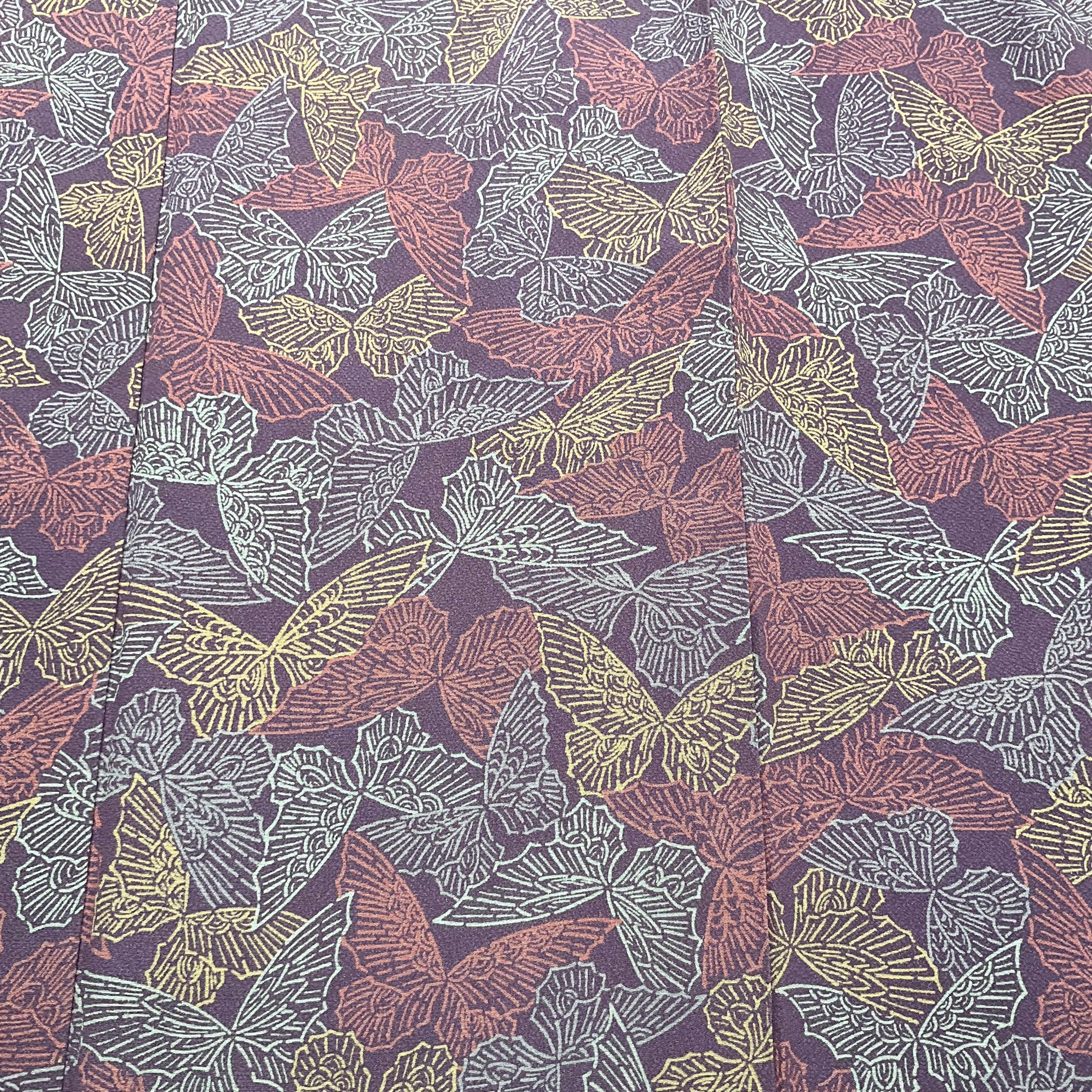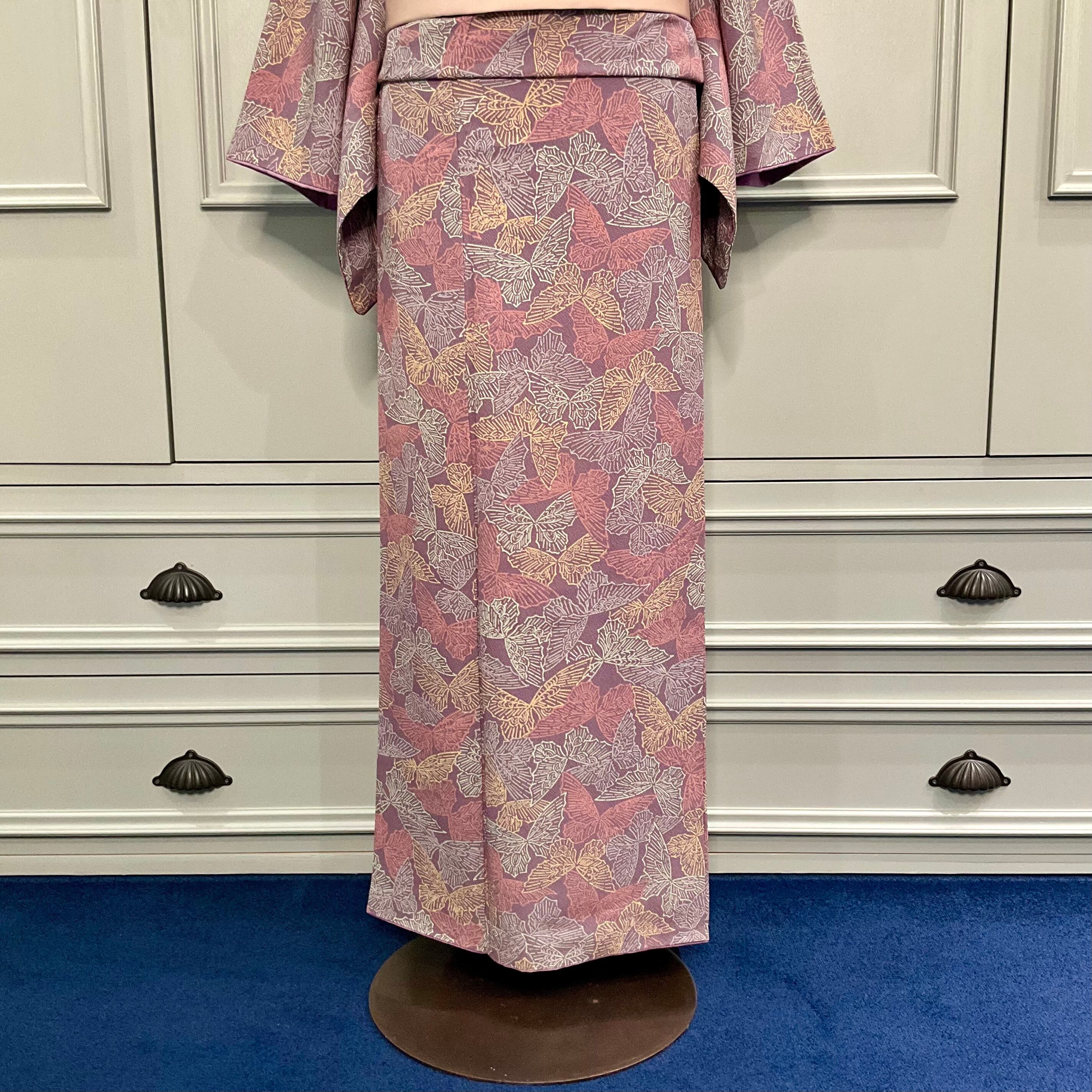 蝶々の柄が幾重にも重なりギュッと詰まって華やかですが、全体のお色味は落ち着いたカラーなので、帯に柄物や複数のお色が入ったデザインのものを合わせてもまとまりやすく、幅広いコーディネートが楽しめそうです♪