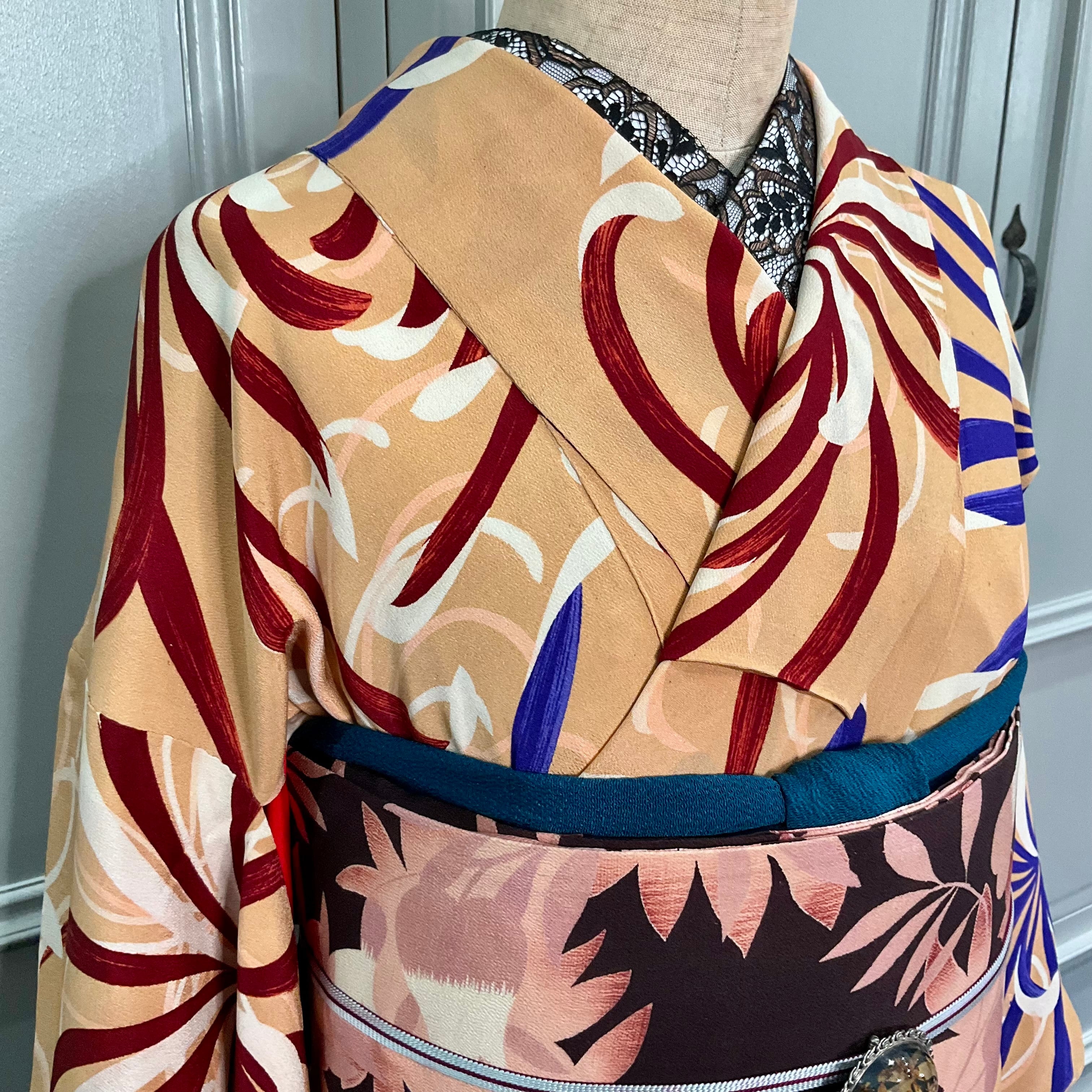 Deco spraymum*オレンジベージュ 乱菊 スプレー菊 アンティーク小紋着物 B290