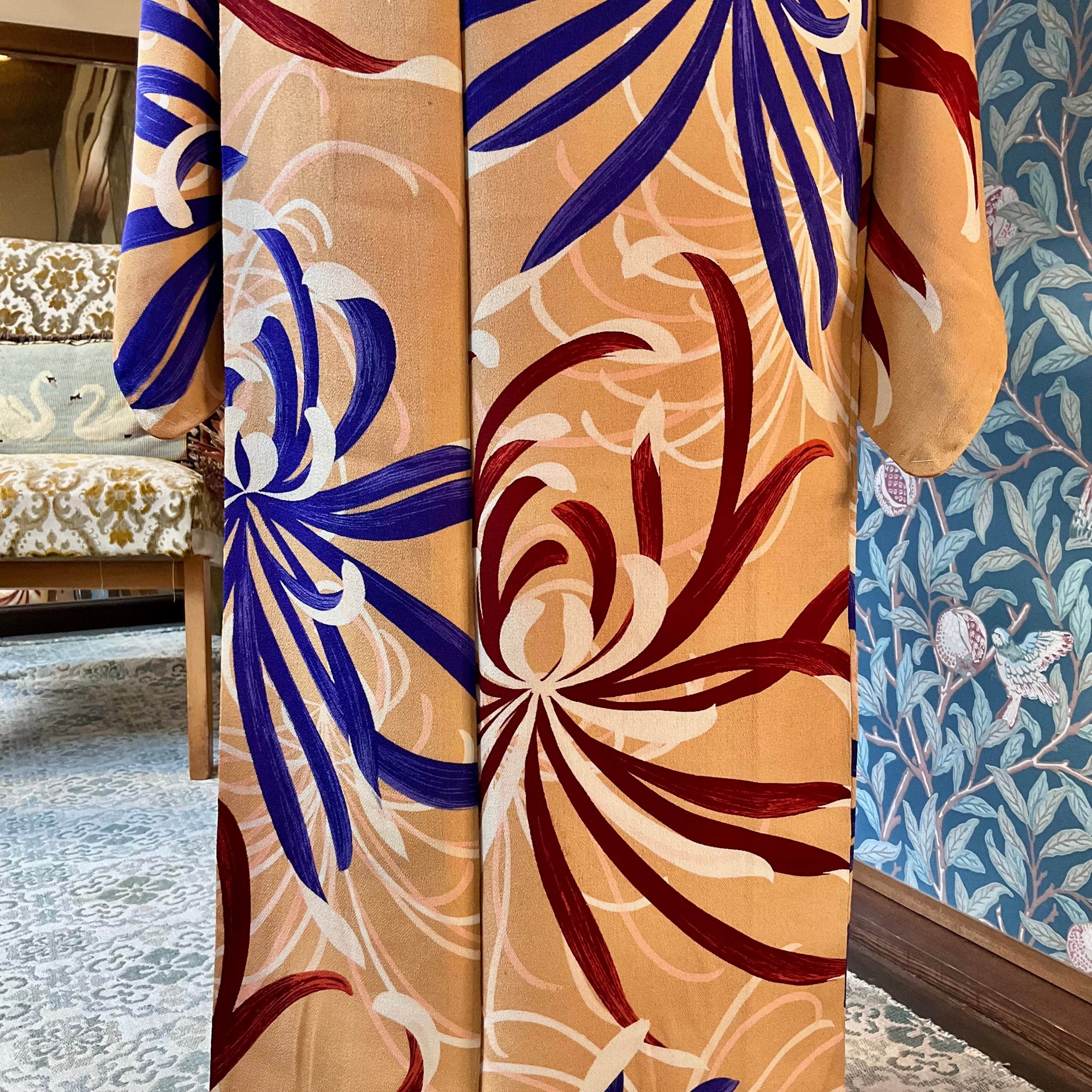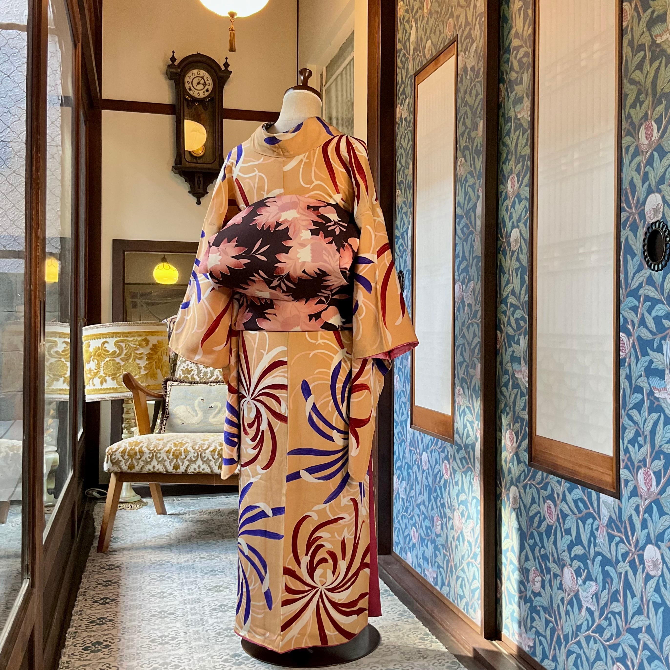 オレンジベージュ地に、大きな菊が一面にデザインされた袷のアンティーク小紋着物です