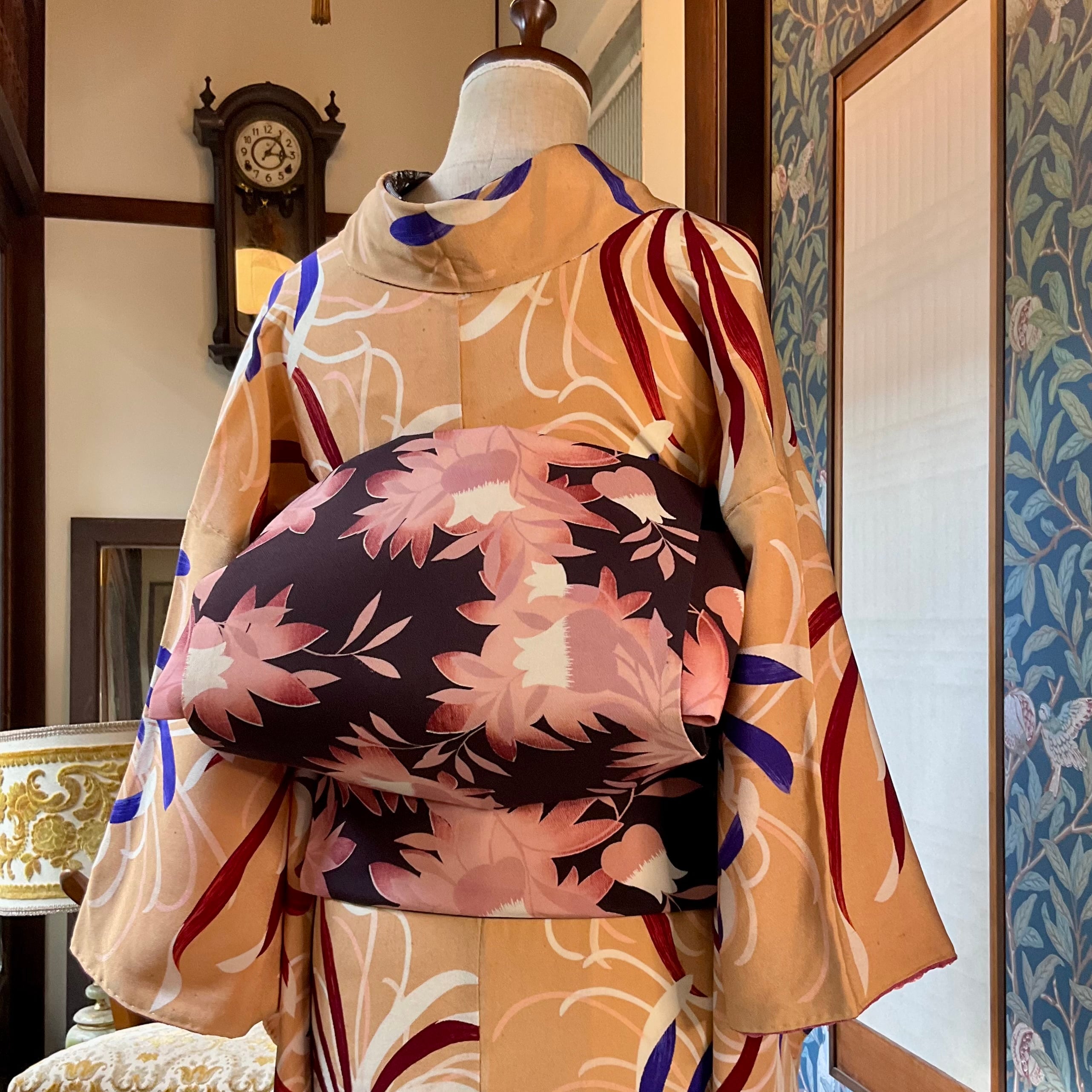 ○合わせたアンティーク名古屋帯、オリジナル帯揚げビリジアングリーン、オリジナル三分紐リバーシブルライン プラム×ミントもwebshop掲載品です♪