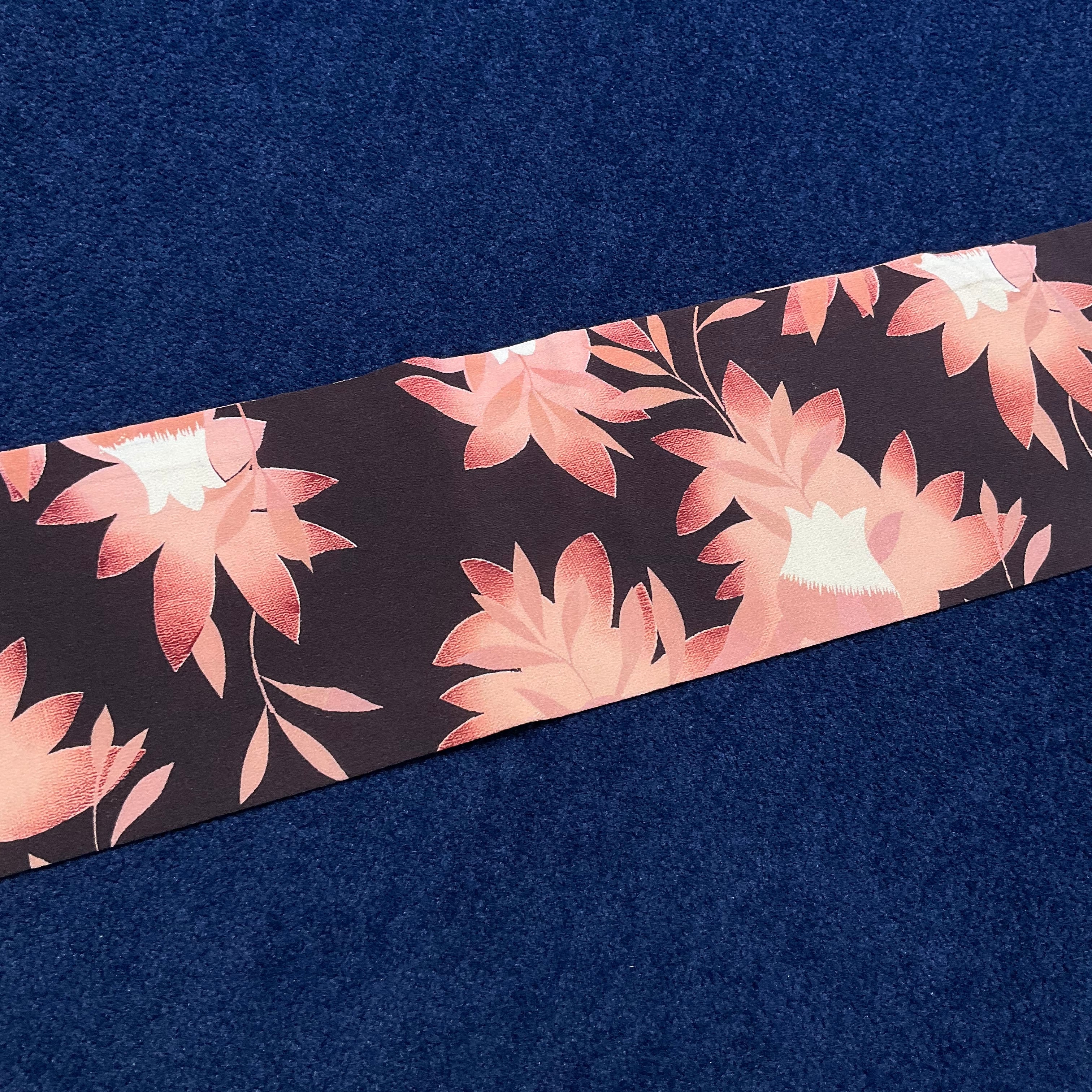 黒地に、くすみピンク系のお花や葉っぱがデザインされたアンティーク仕立てかえ名古屋帯です