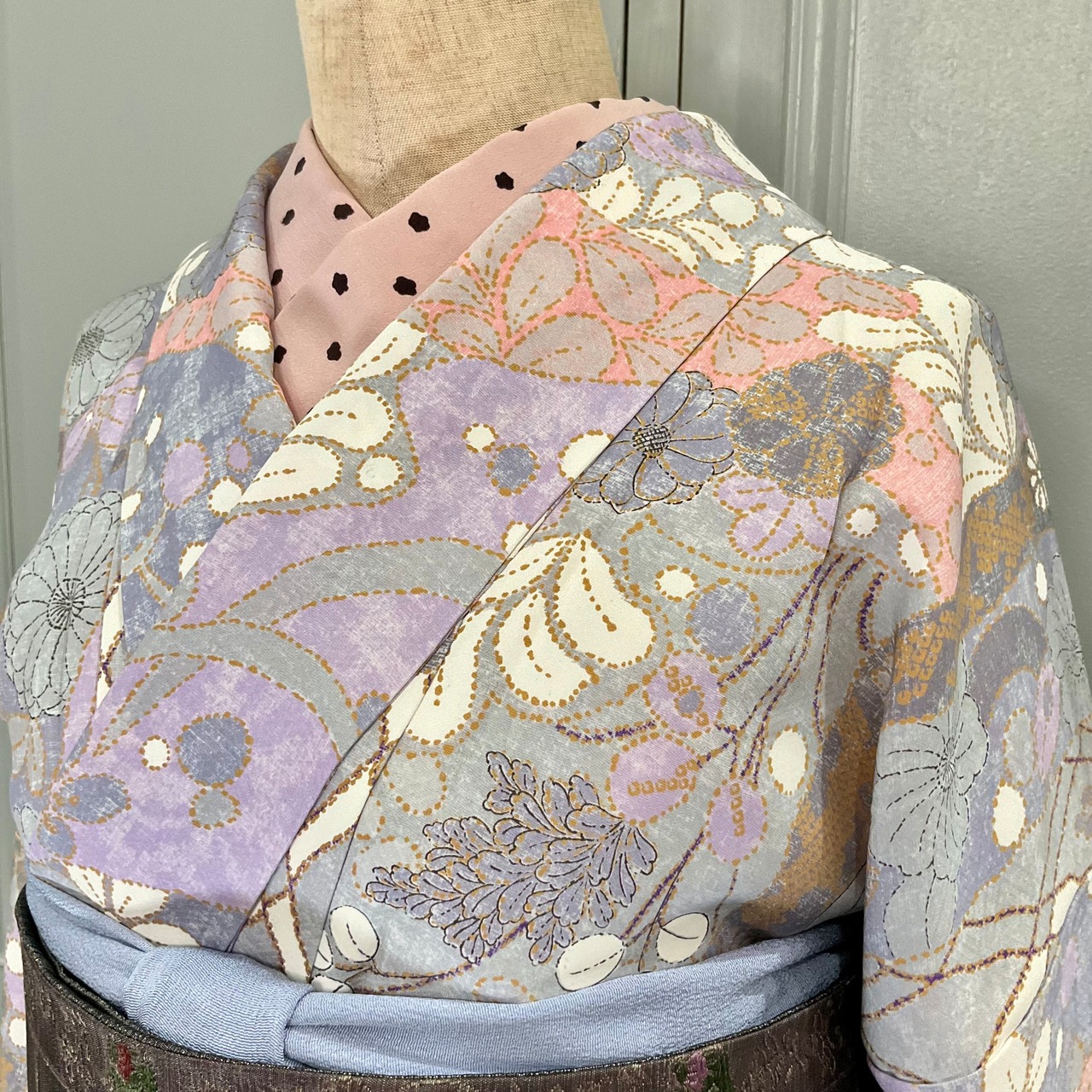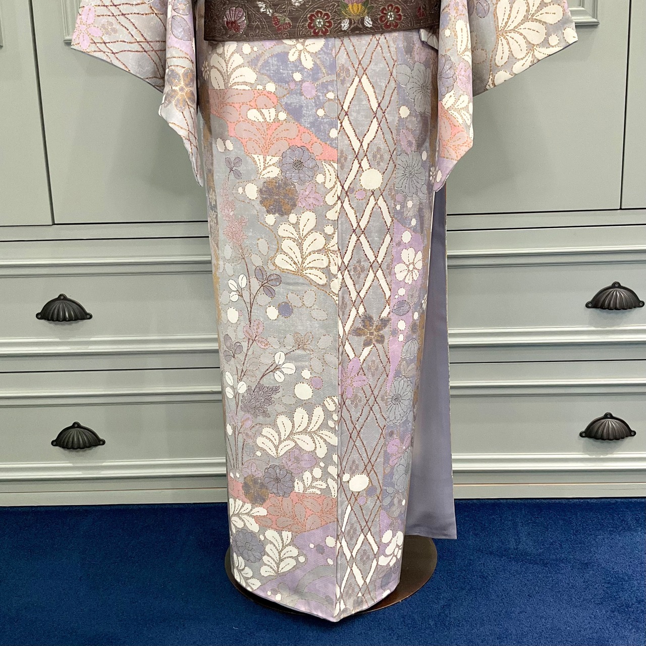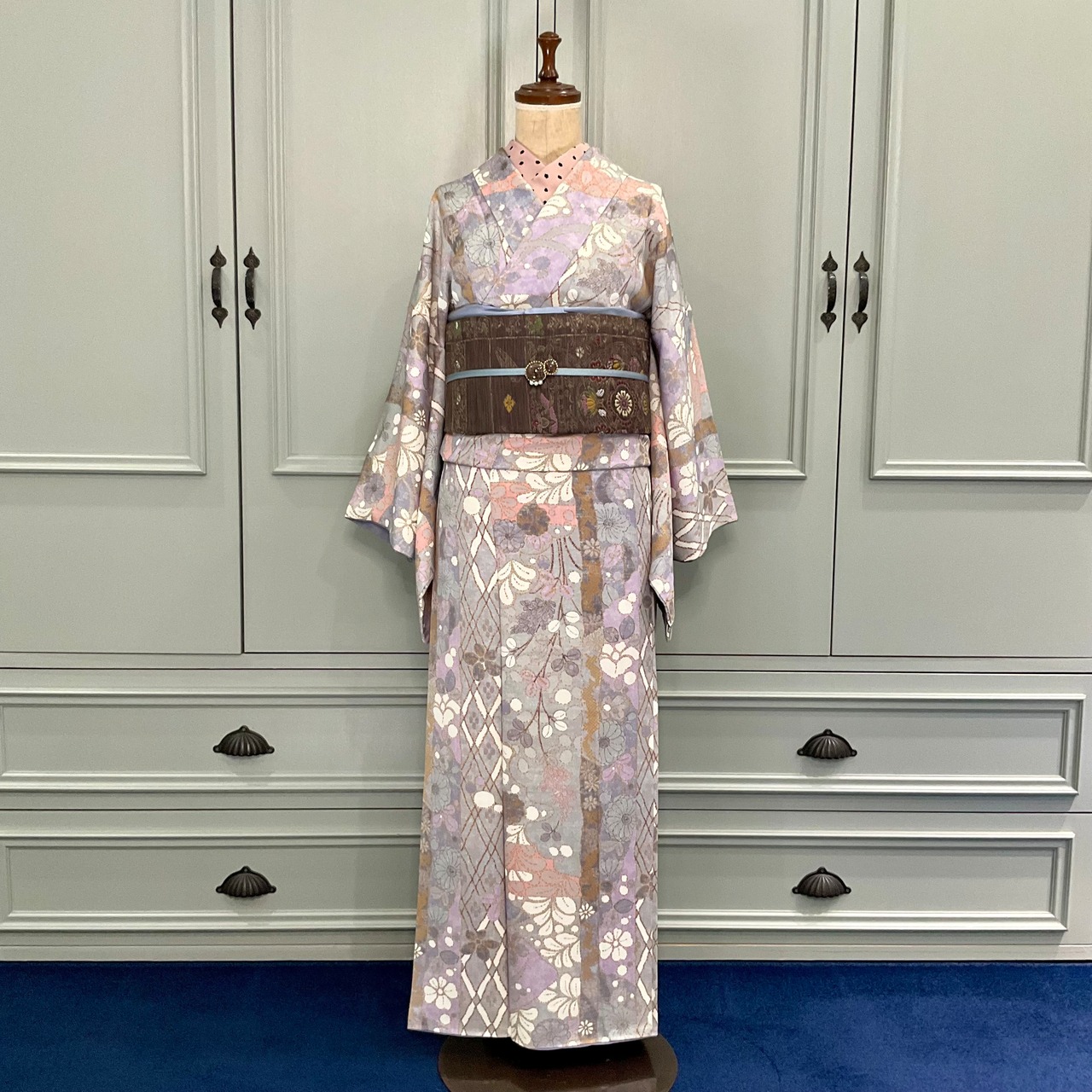 ブルーグレーの地色に花や葉、菱の格子などがデザインされた大人かわいい小紋着物です