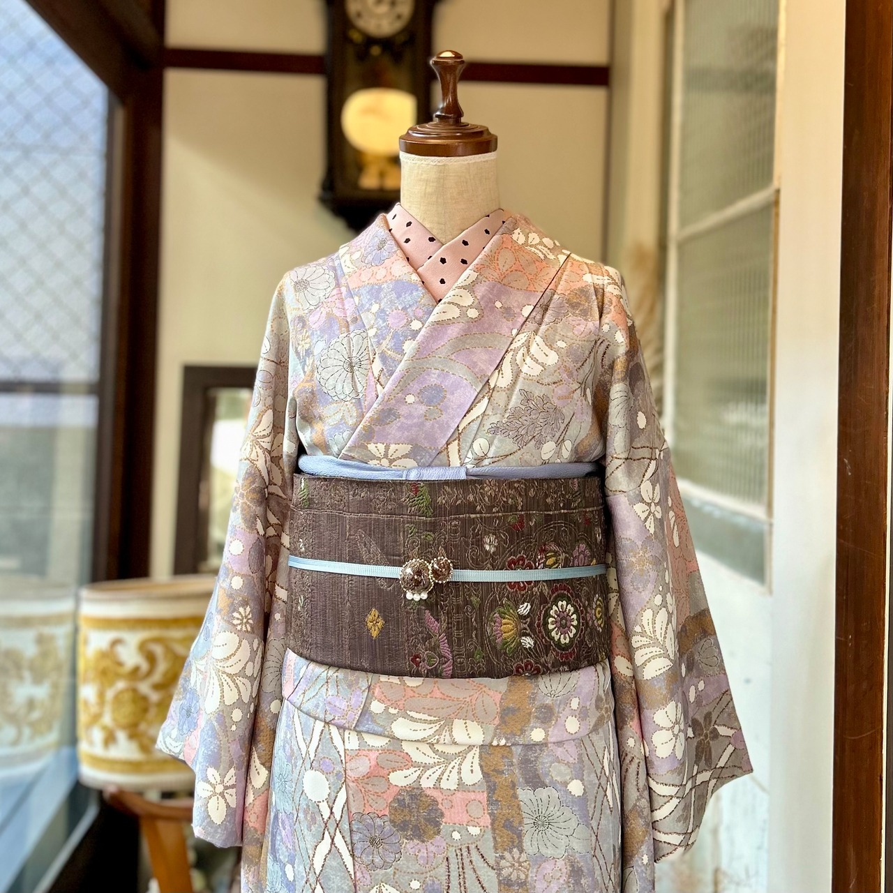 ○合わせた帯、オリジナル帯揚げスモークブルー、オリジナル三分紐ブルーグレー×ホワイトもweb shop掲載品です♪