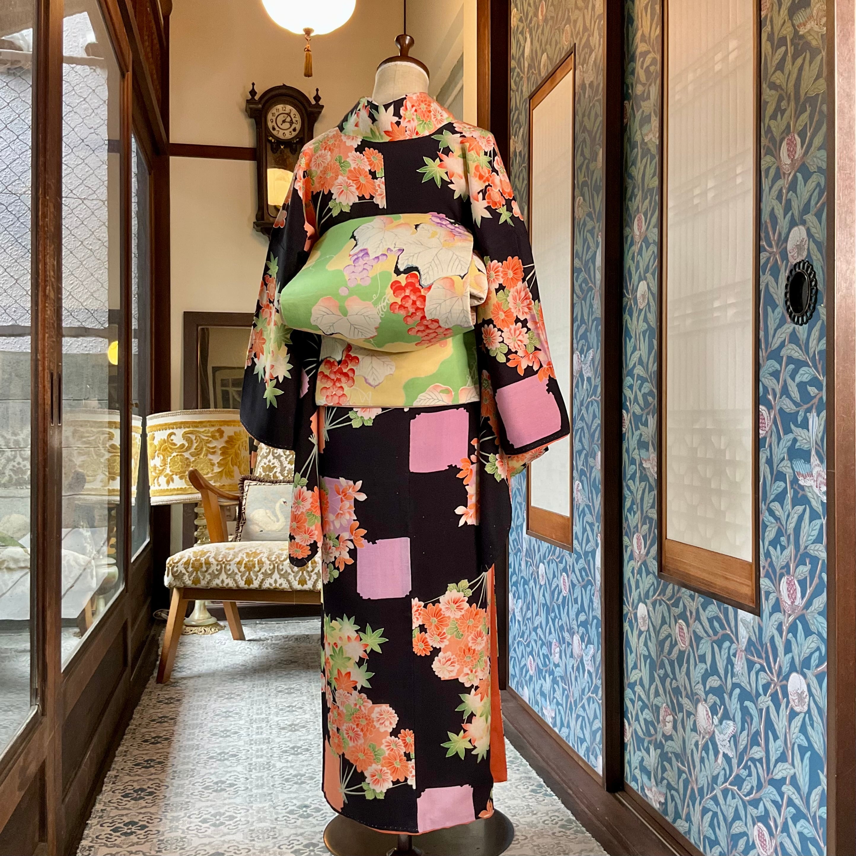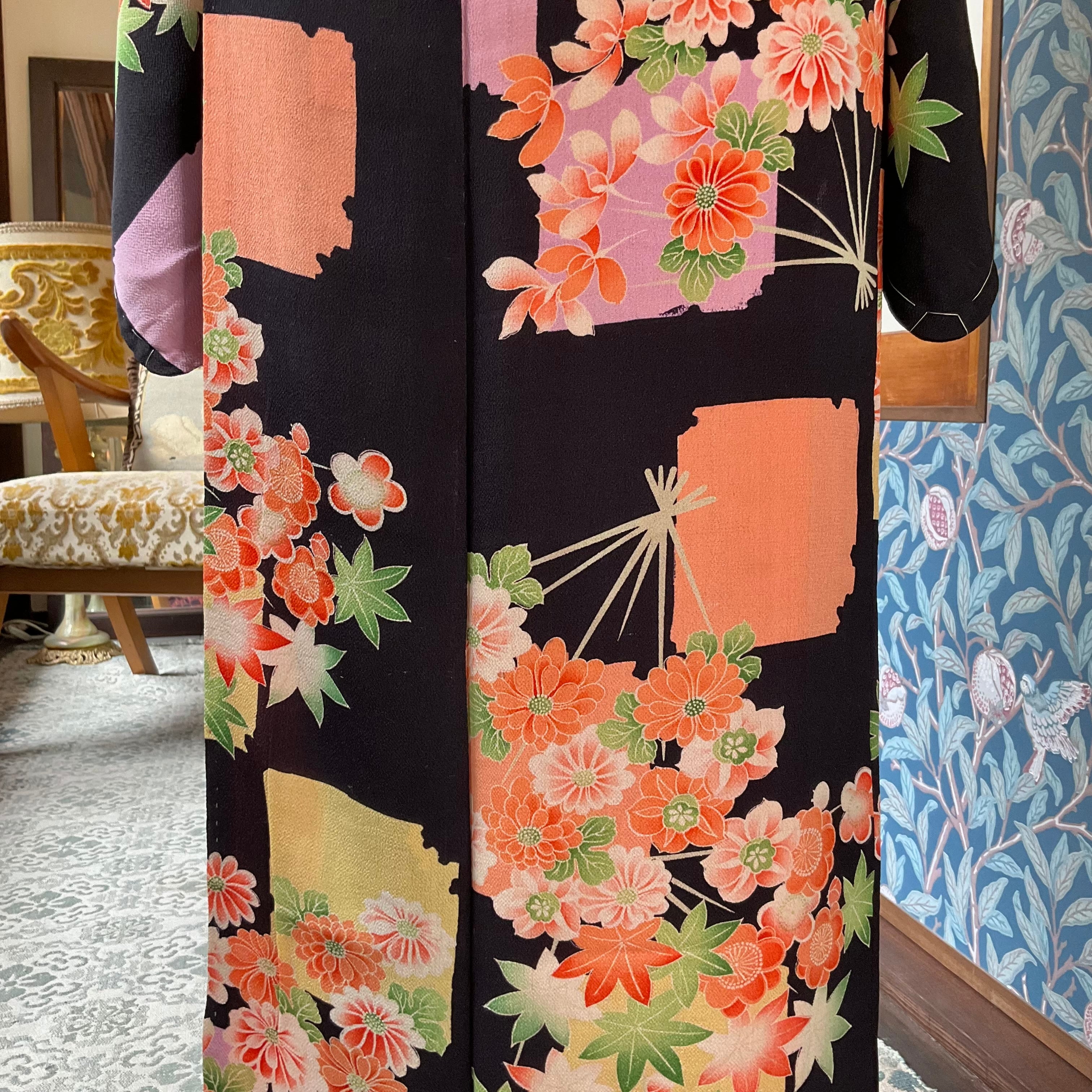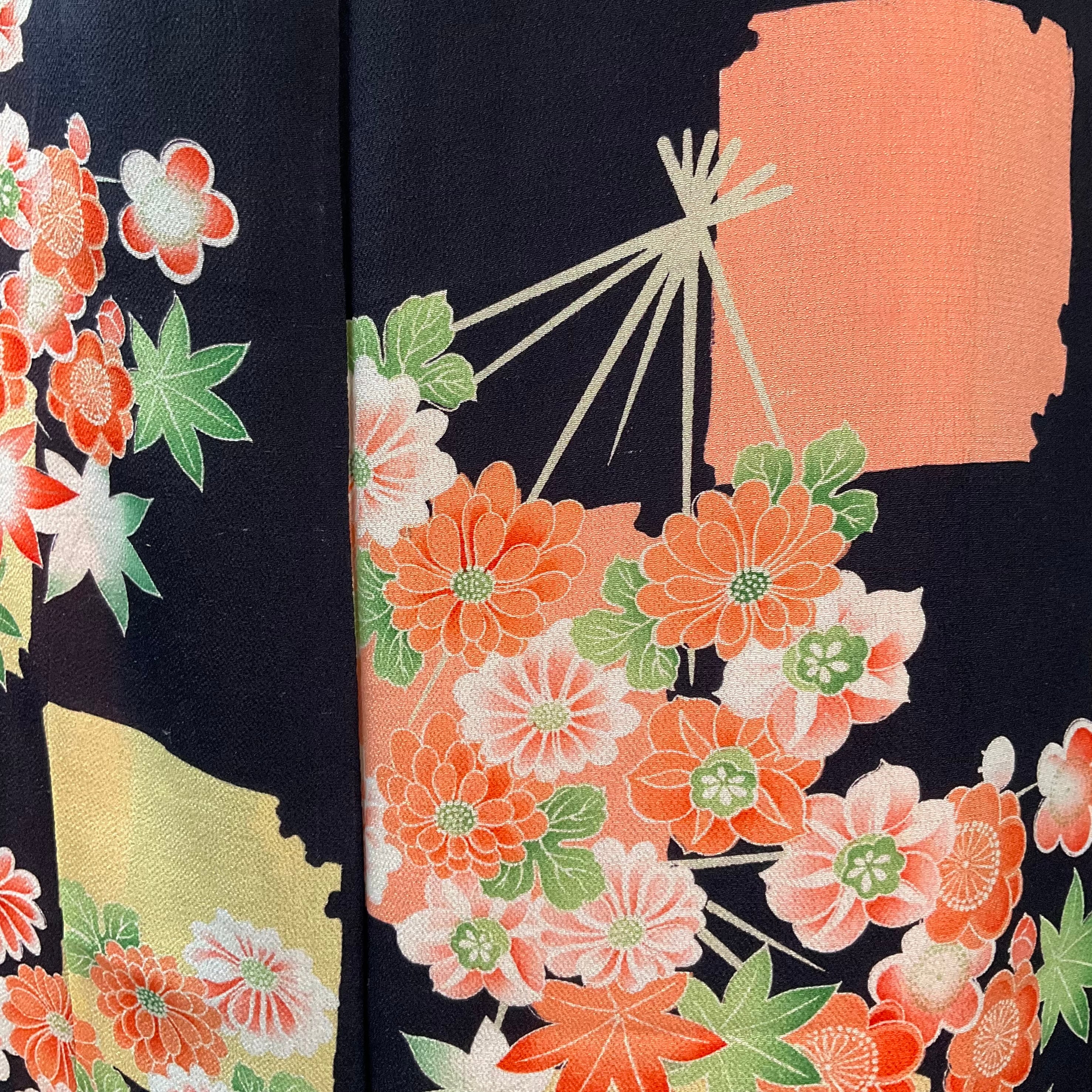黒地に色紙模様、オレンジ系の菊や紅葉などのお花の扇子が描かれた袷のアンティーク小紋着物です