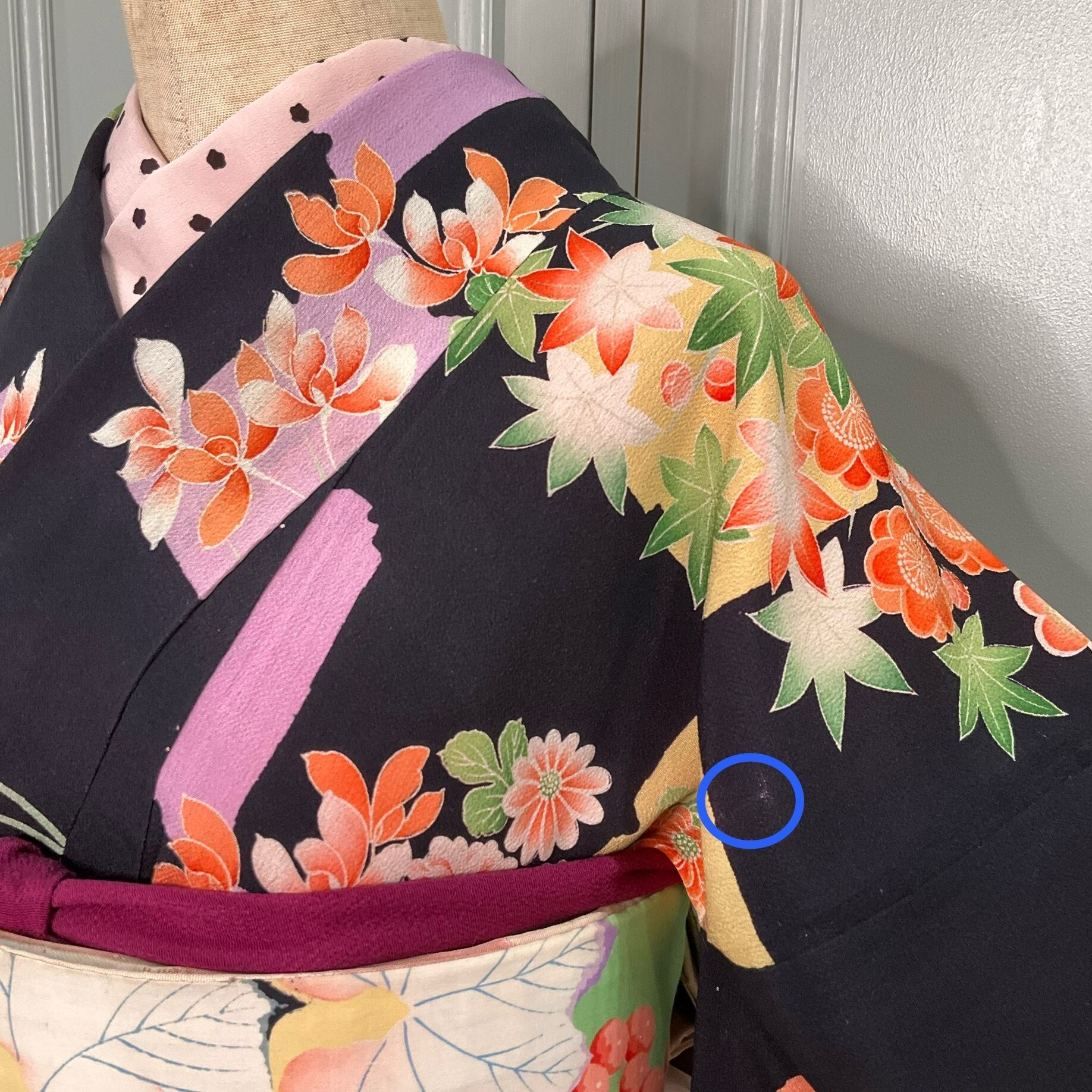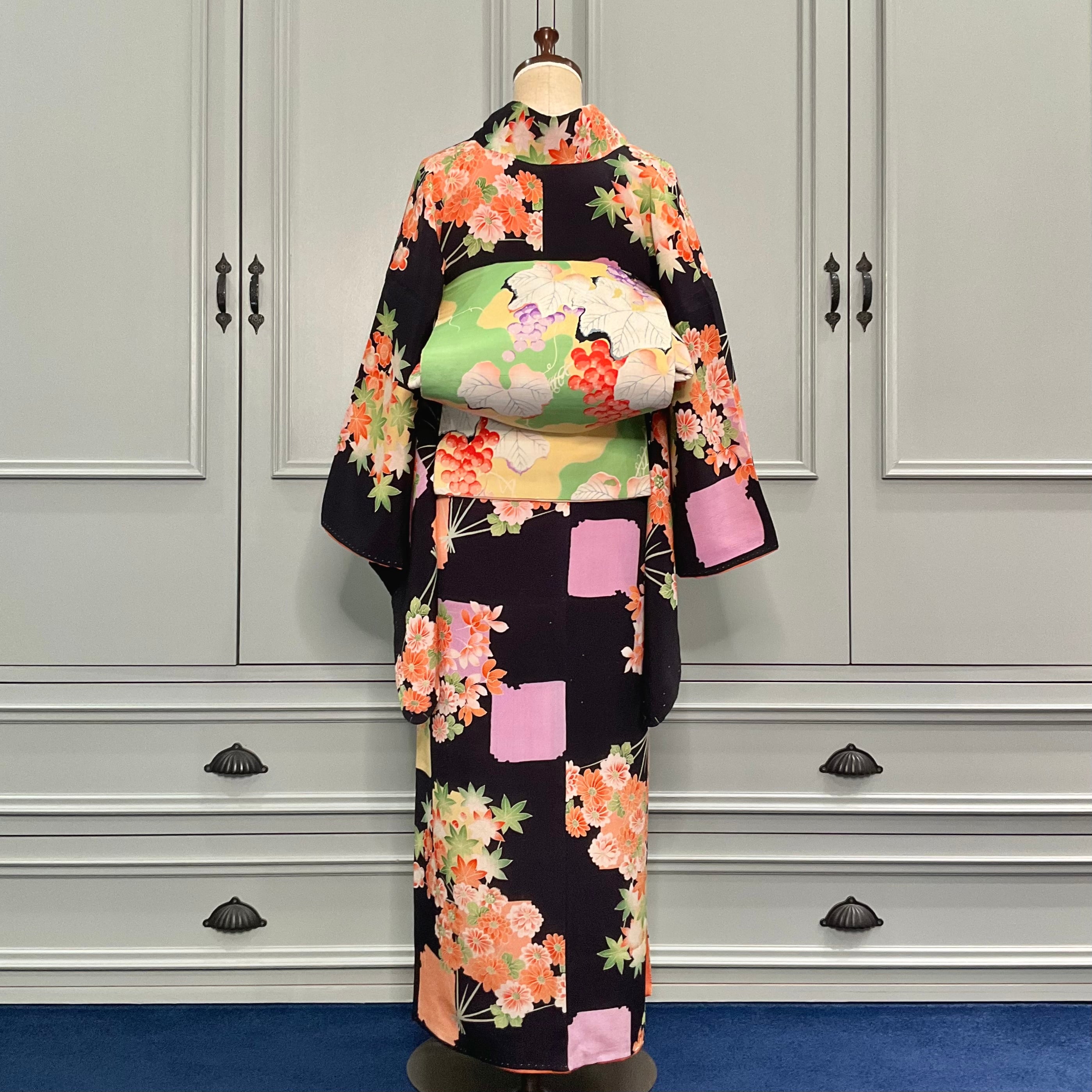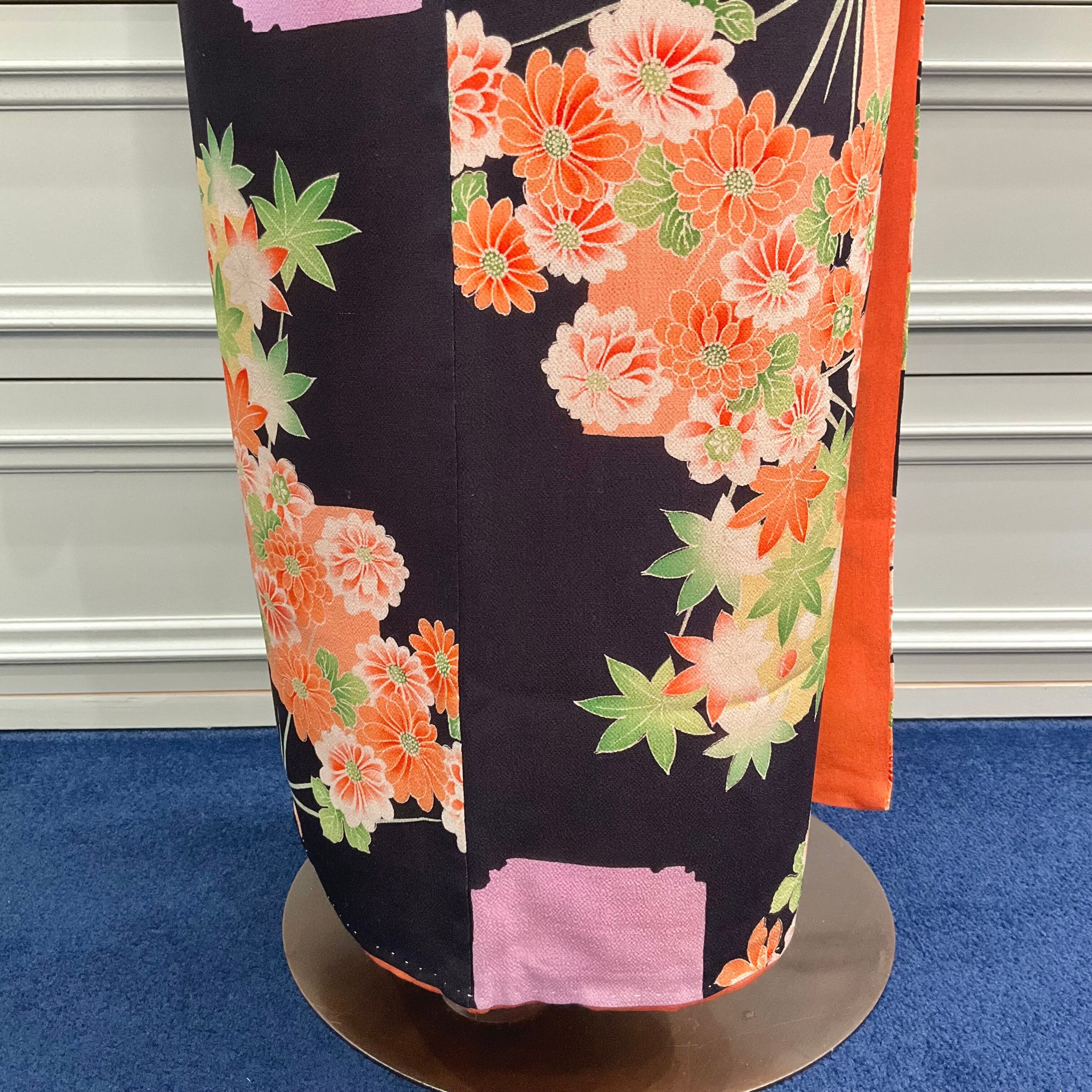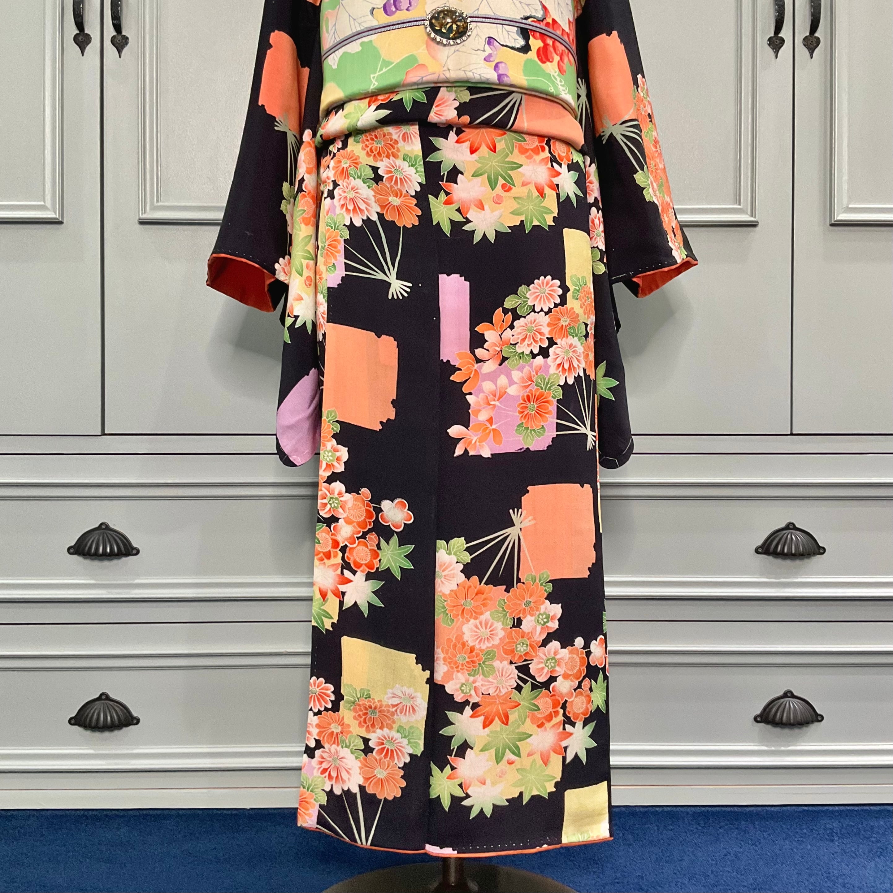 花扇子に色紙*黒 菊 梅 紅葉 春蘭 クレマチス オレンジ アンティーク小紋着物 B302