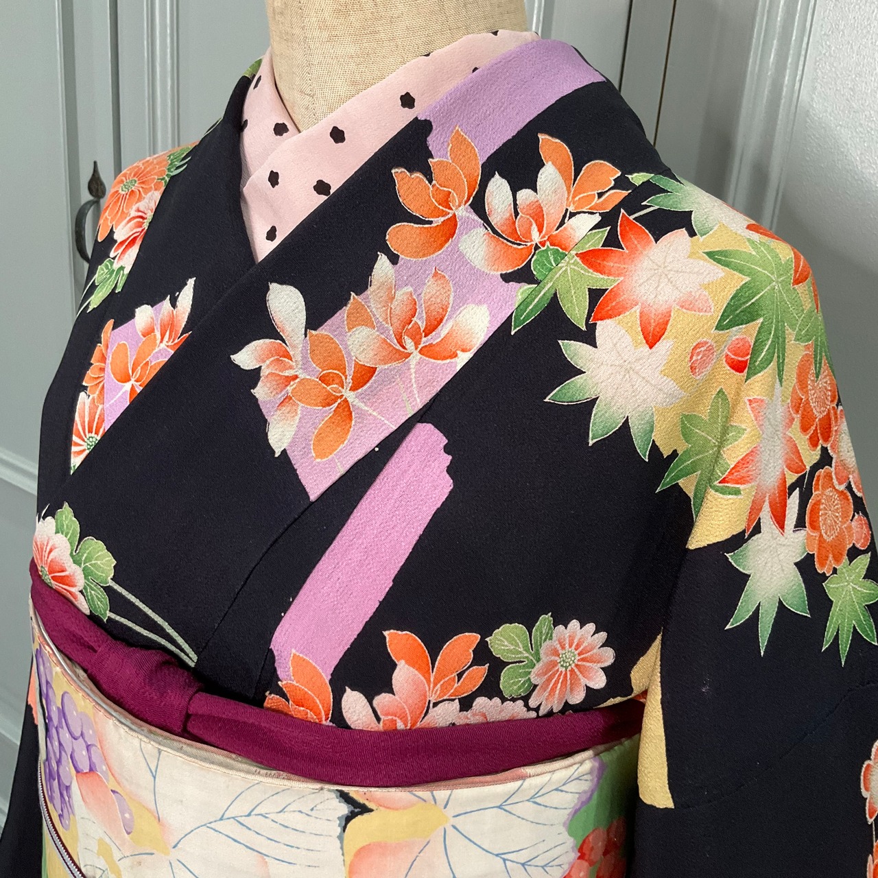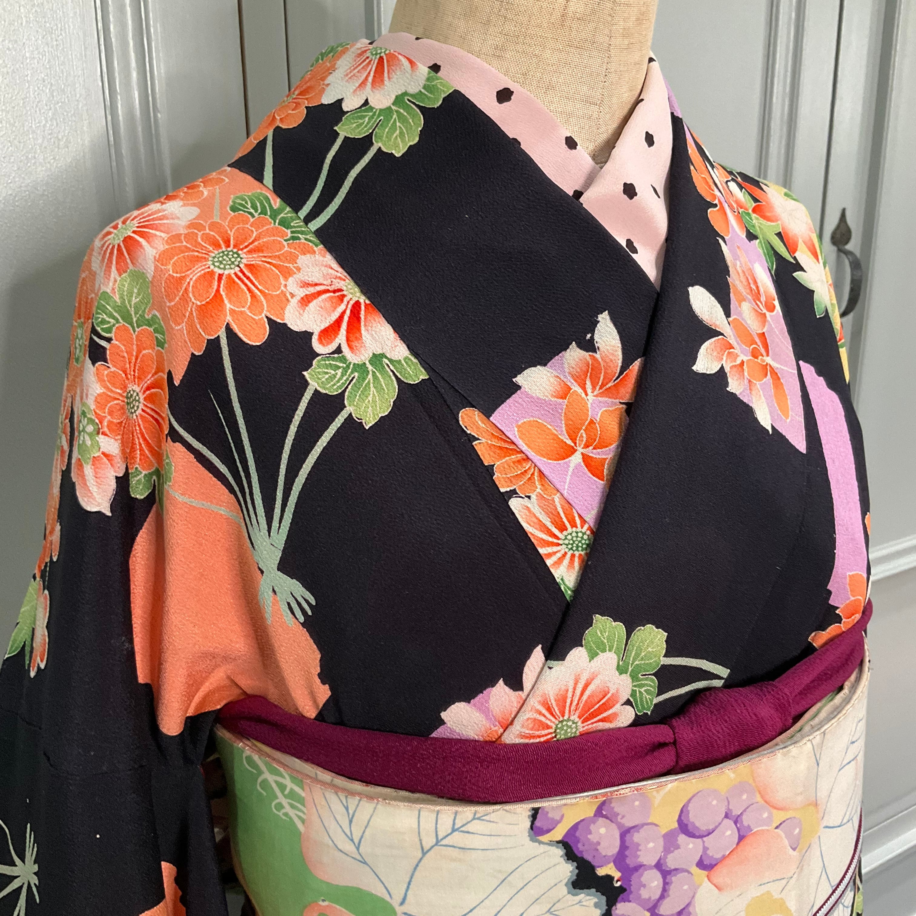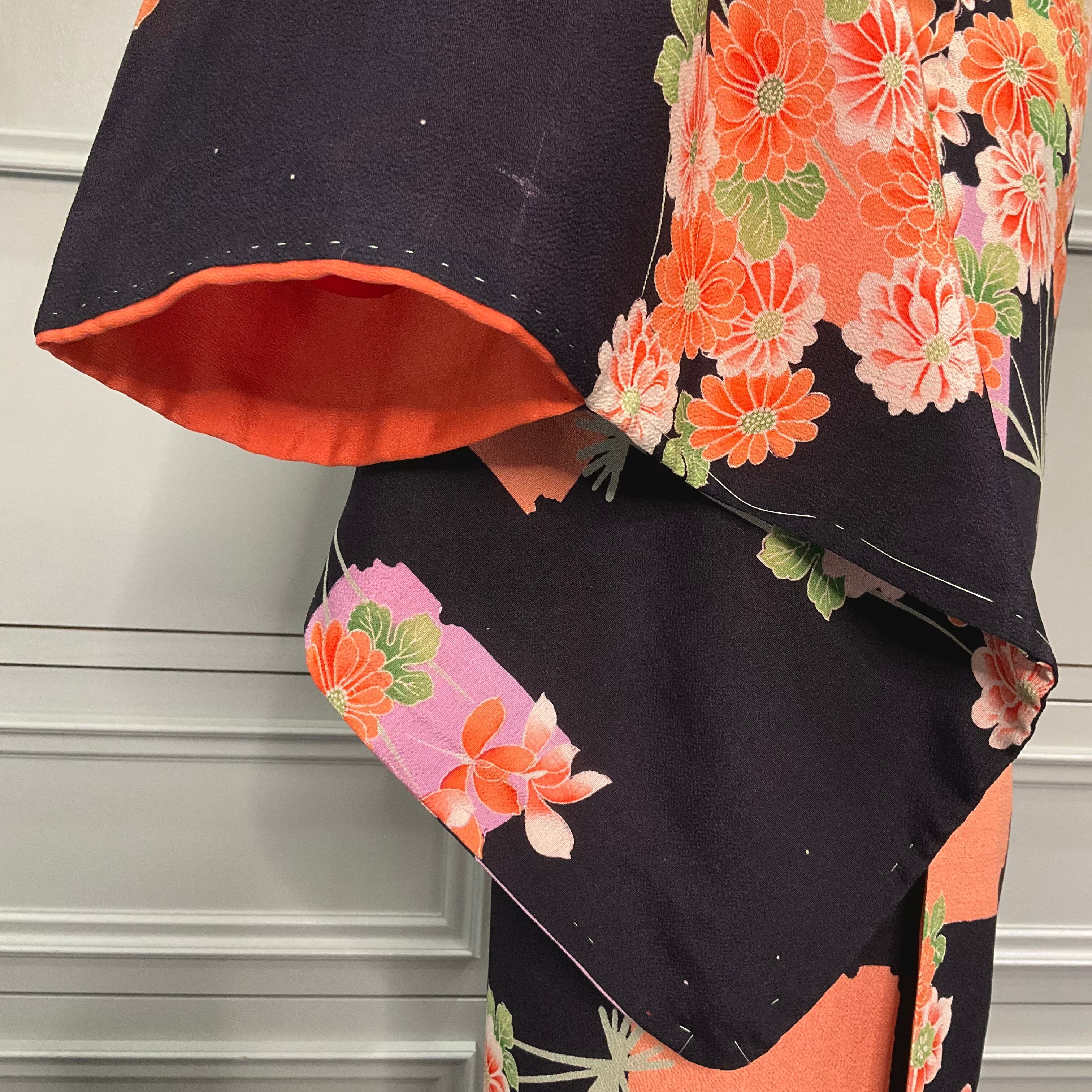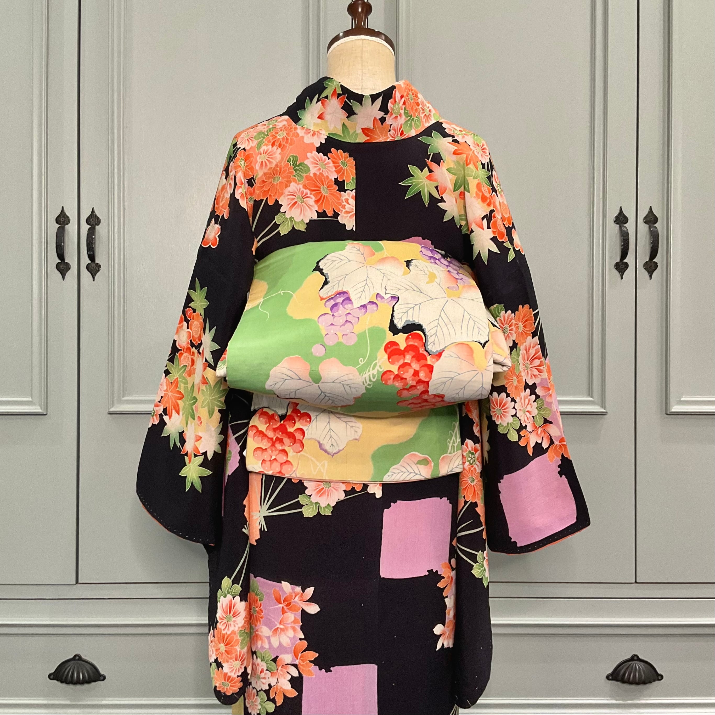 花扇子に色紙*黒 菊 梅 紅葉 春蘭 クレマチス オレンジ アンティーク小紋着物 B302