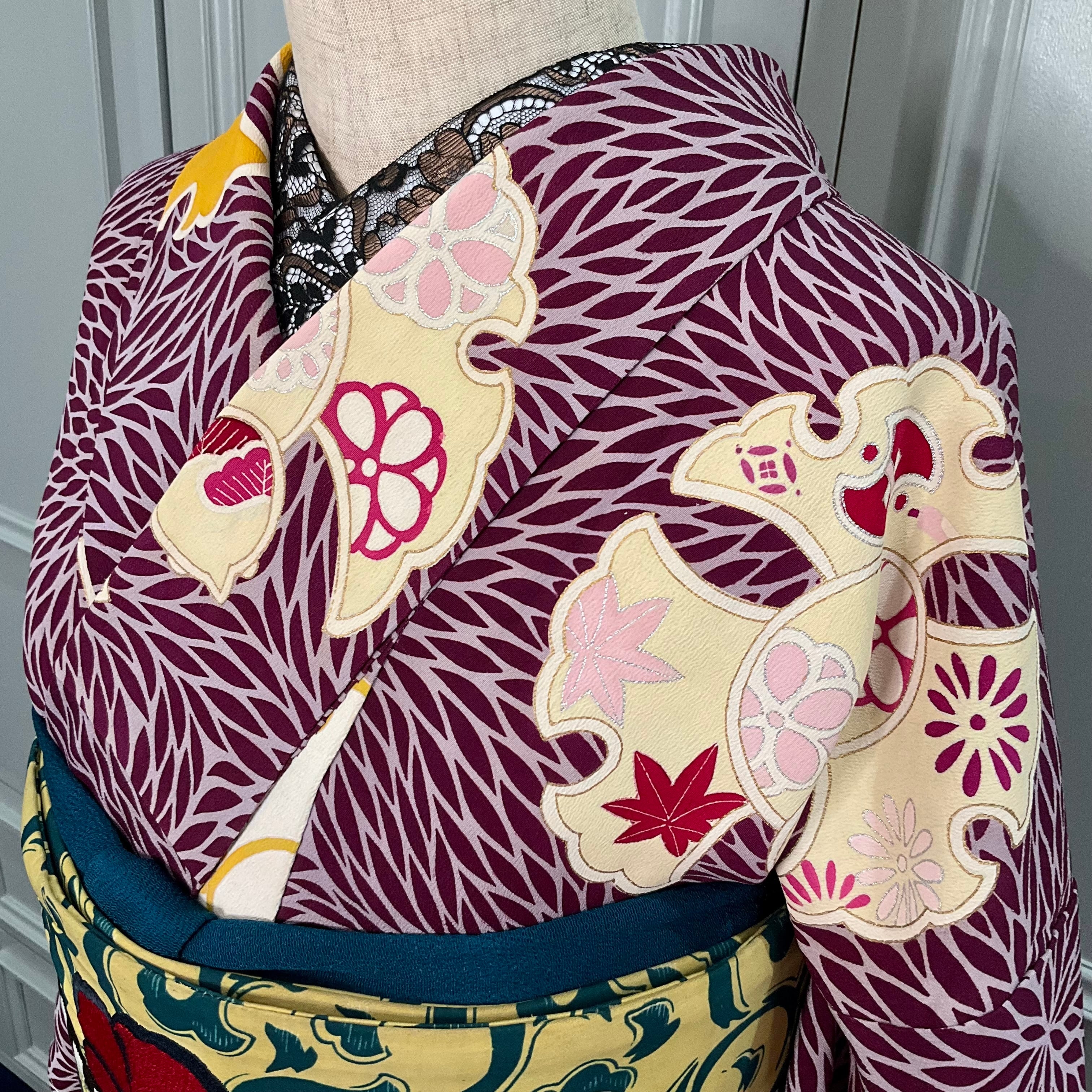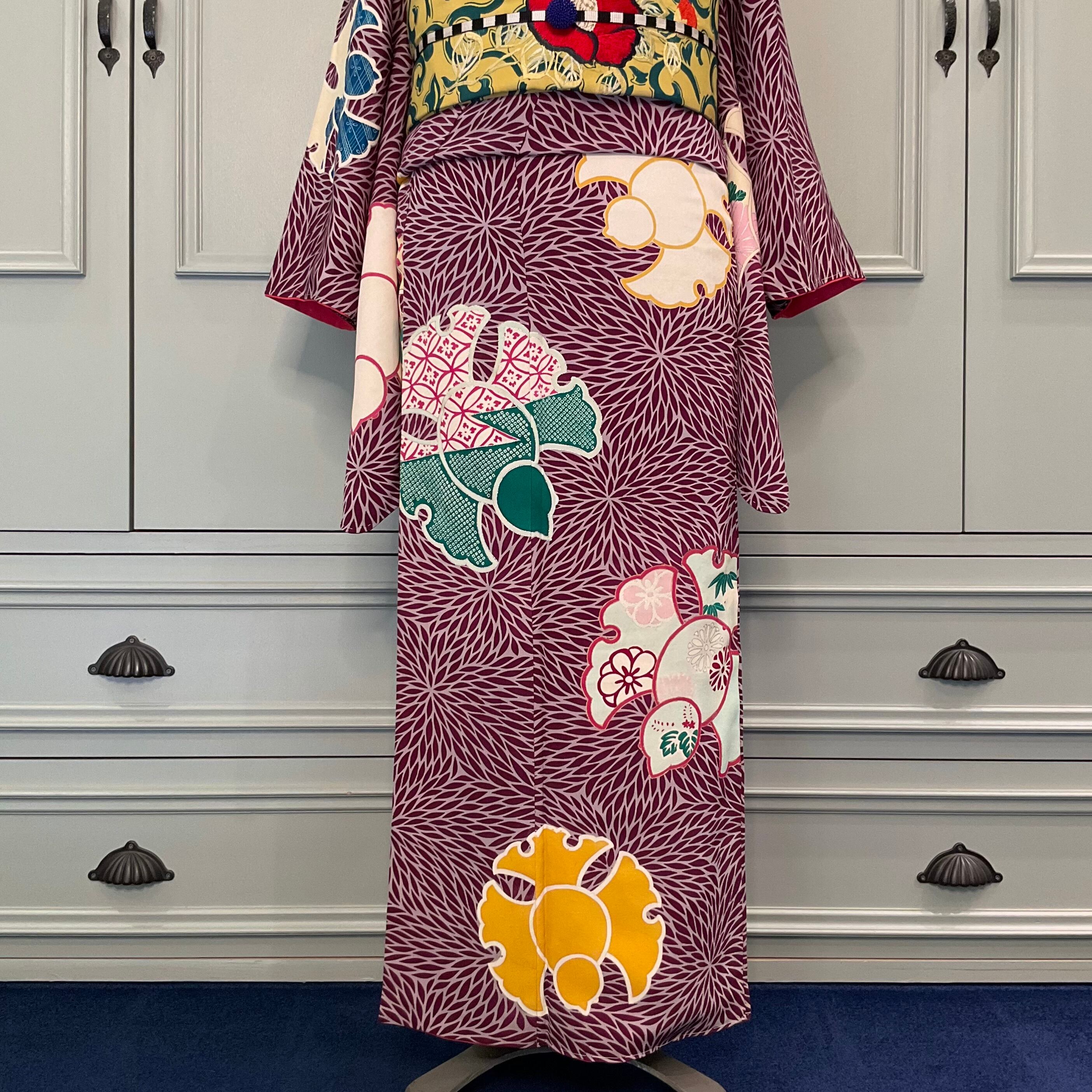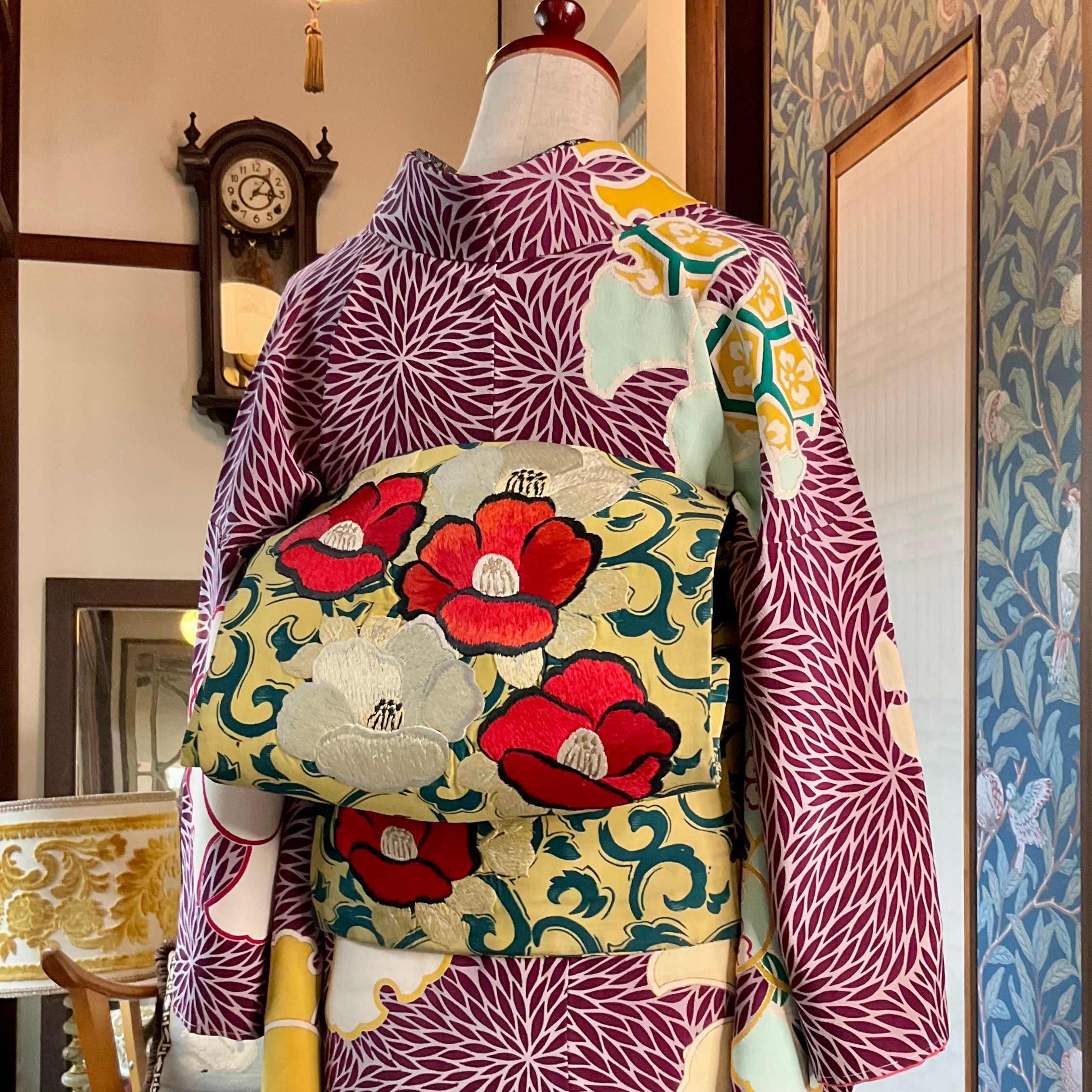 落ち着いた地色に、色とりどりのふくら雀がアンティークらしい色づかいで、古典的なデザインでありながら個性のある一着✨️