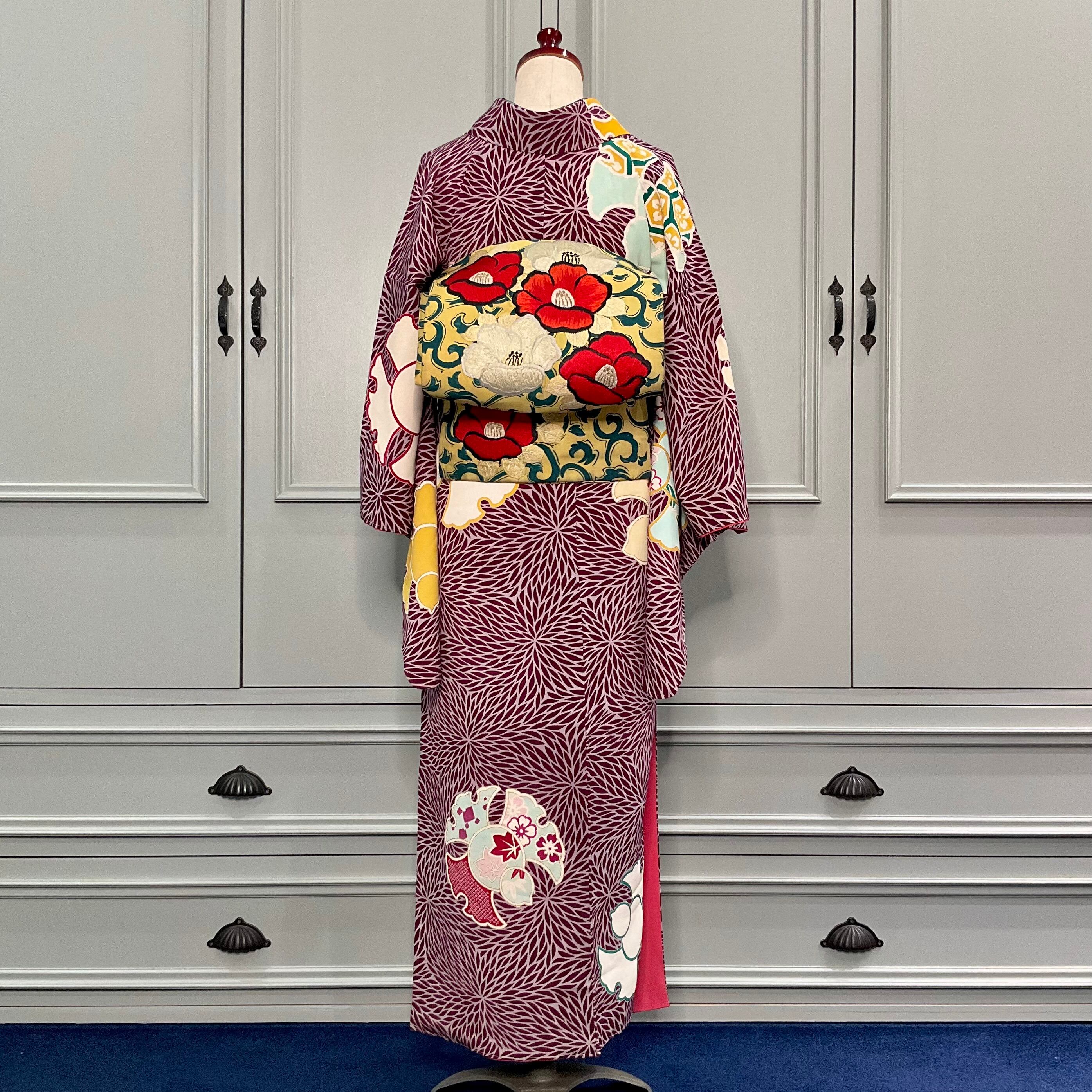 雪輪ふくら雀*むじな菊 すずめ 七宝 亀甲 桐 桜 紅葉 ボルドー ワイン パープル 臙脂 蘇芳 小豆 紫 茶色 ブラウン アンティーク小紋着物 B304