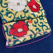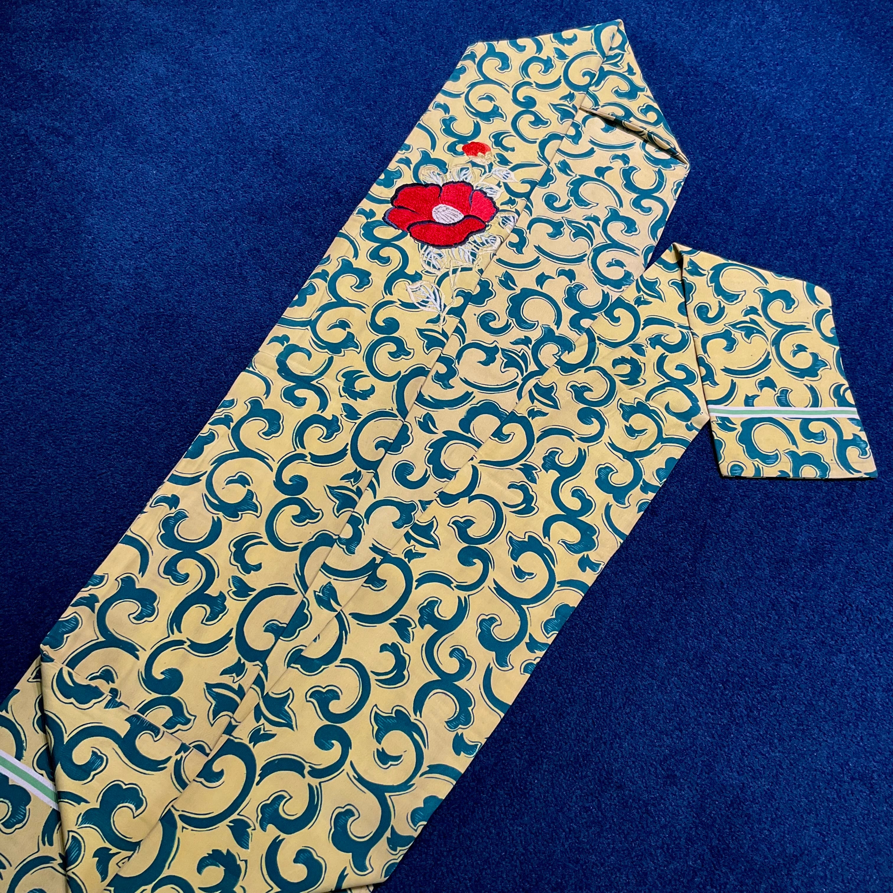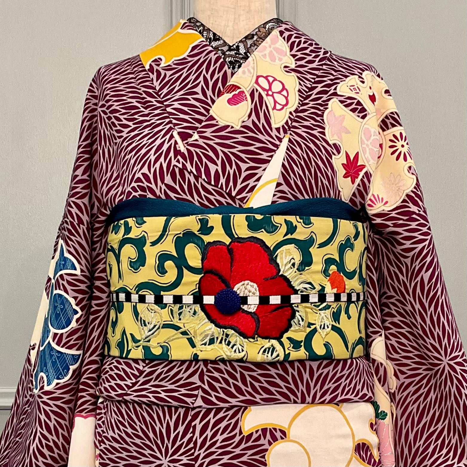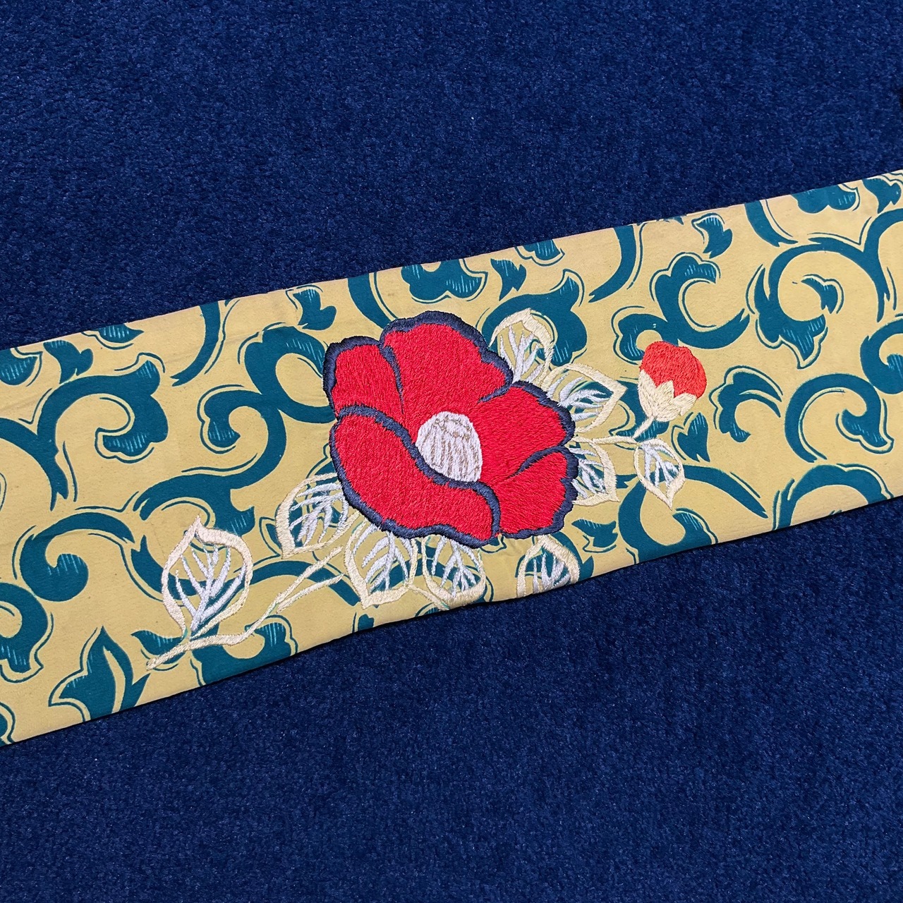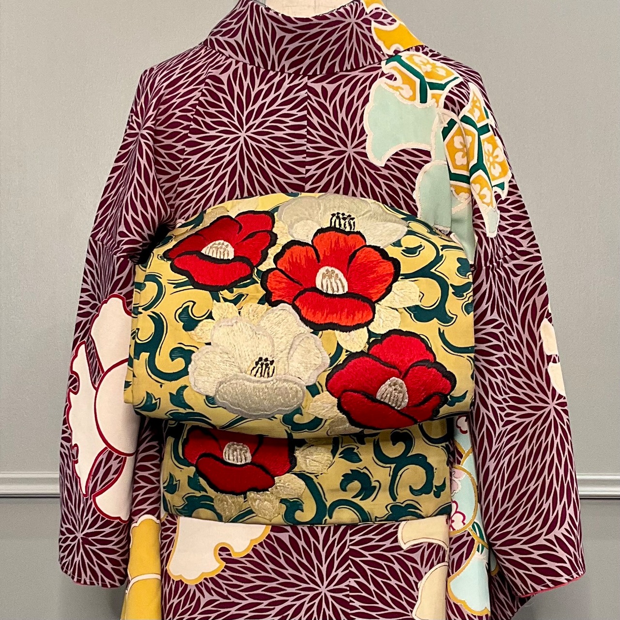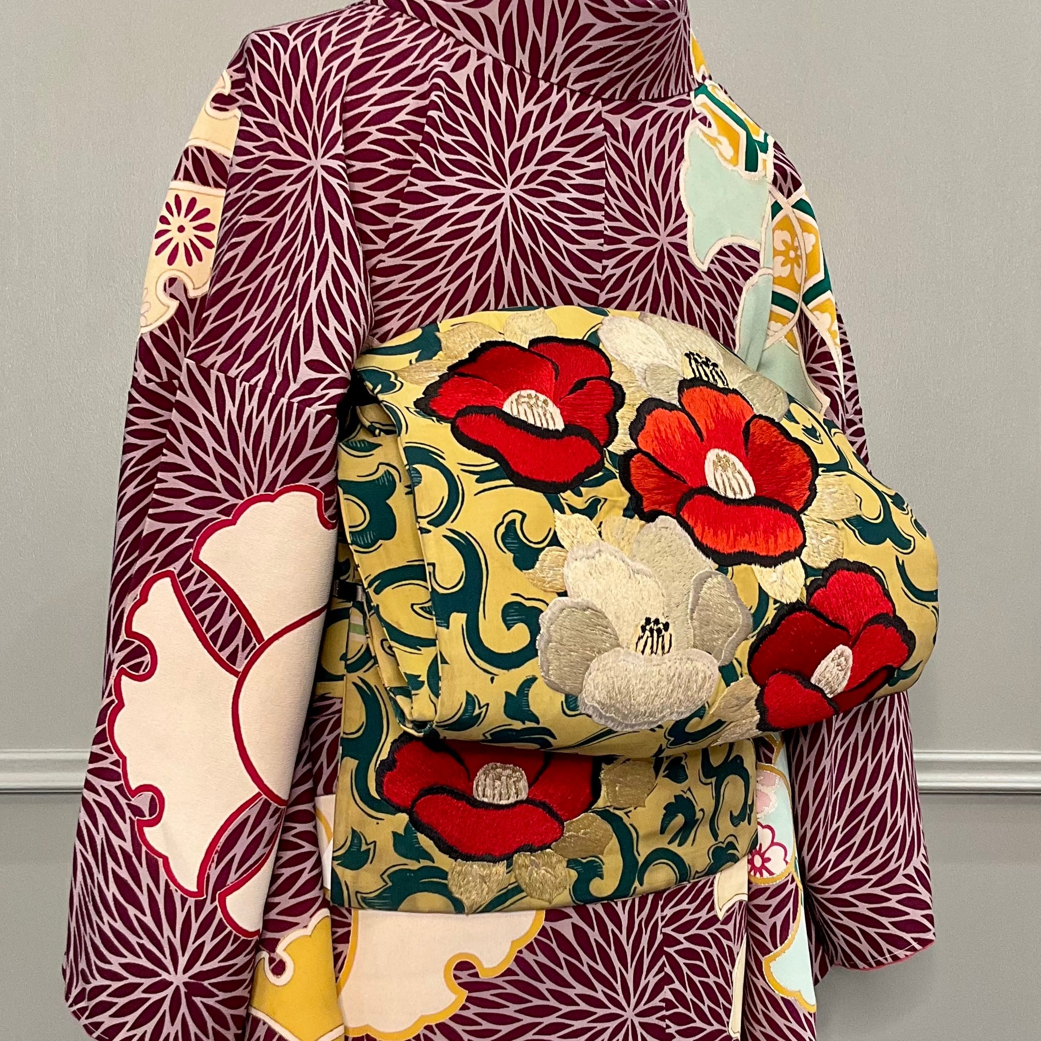 クリームイエロー系の地色にグリーンの唐草模様と、紅白の椿の刺繍がおしゃれな染めのアンティーク名古屋帯です