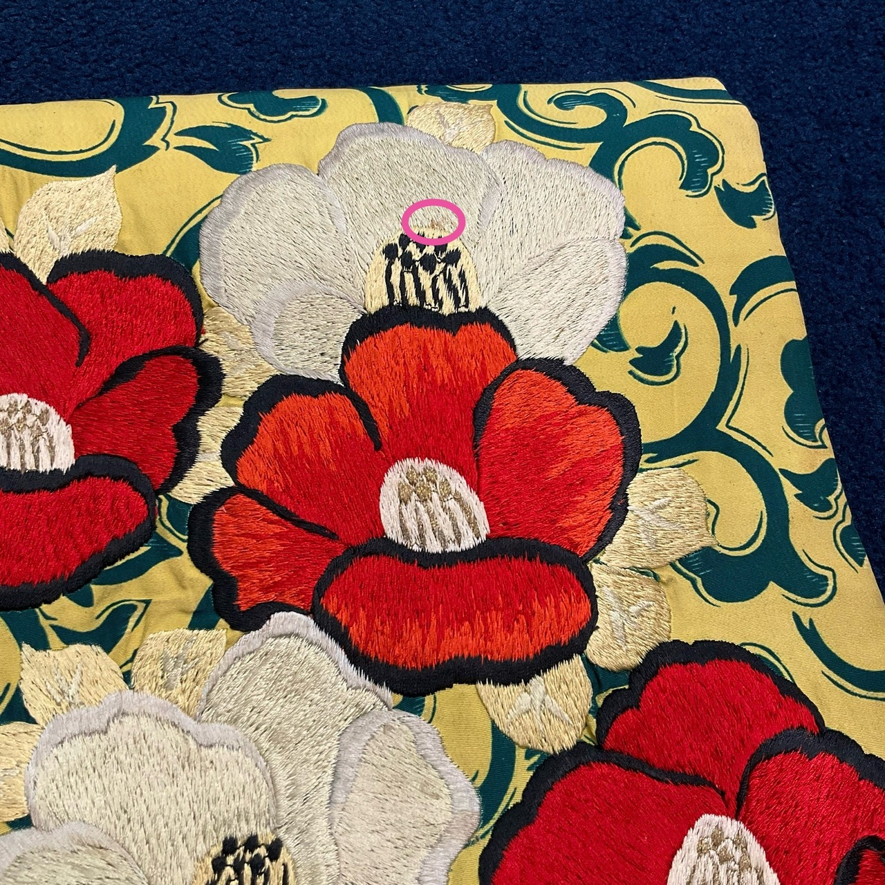 お太鼓の刺繍、たれ、手先、胴前の裏面に小シミ、クスミ。