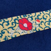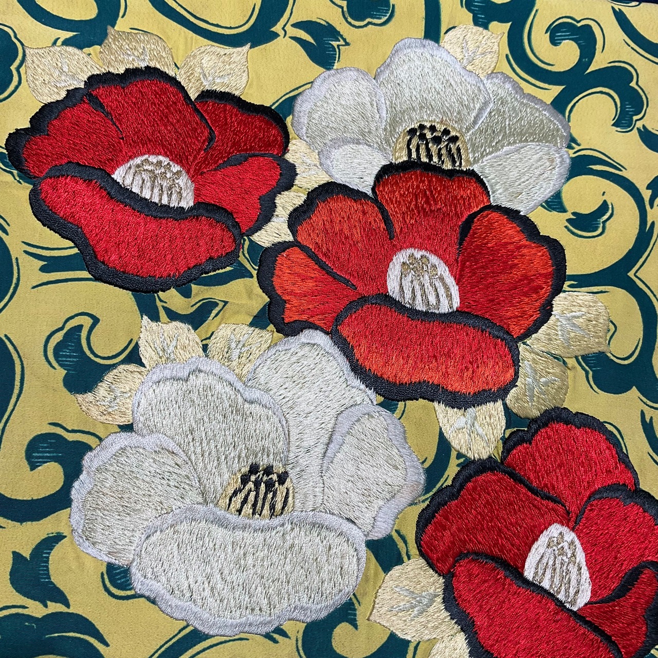 紅白の椿と、深いグリーンの唐草模様の組み合わせが個性のあるデザイン*