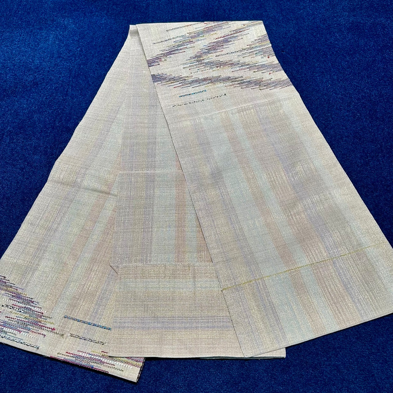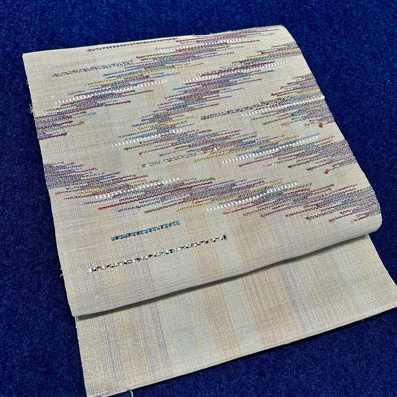 アイボリーの中にシャンパンゴールド煌めく地色は、よく見るとブルーやグリーン、パープルのパステルカラーが織り込まれ、光の当たり具合によって様々な表情を見せてくれる繊細な一本✨️