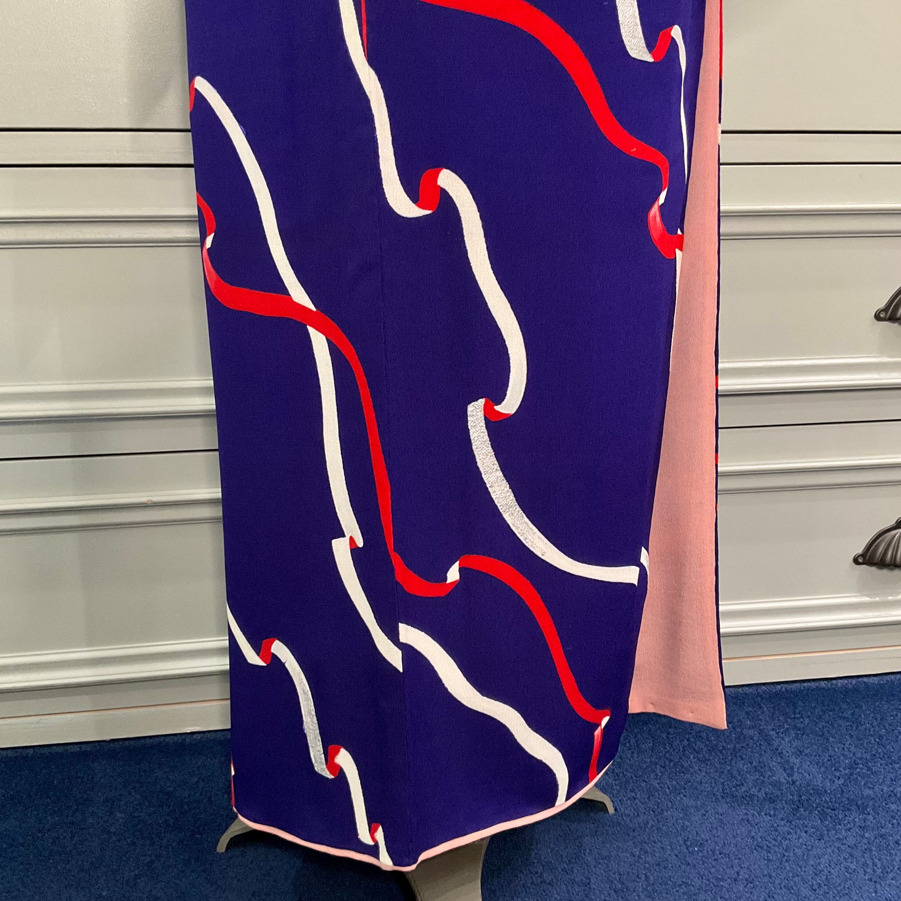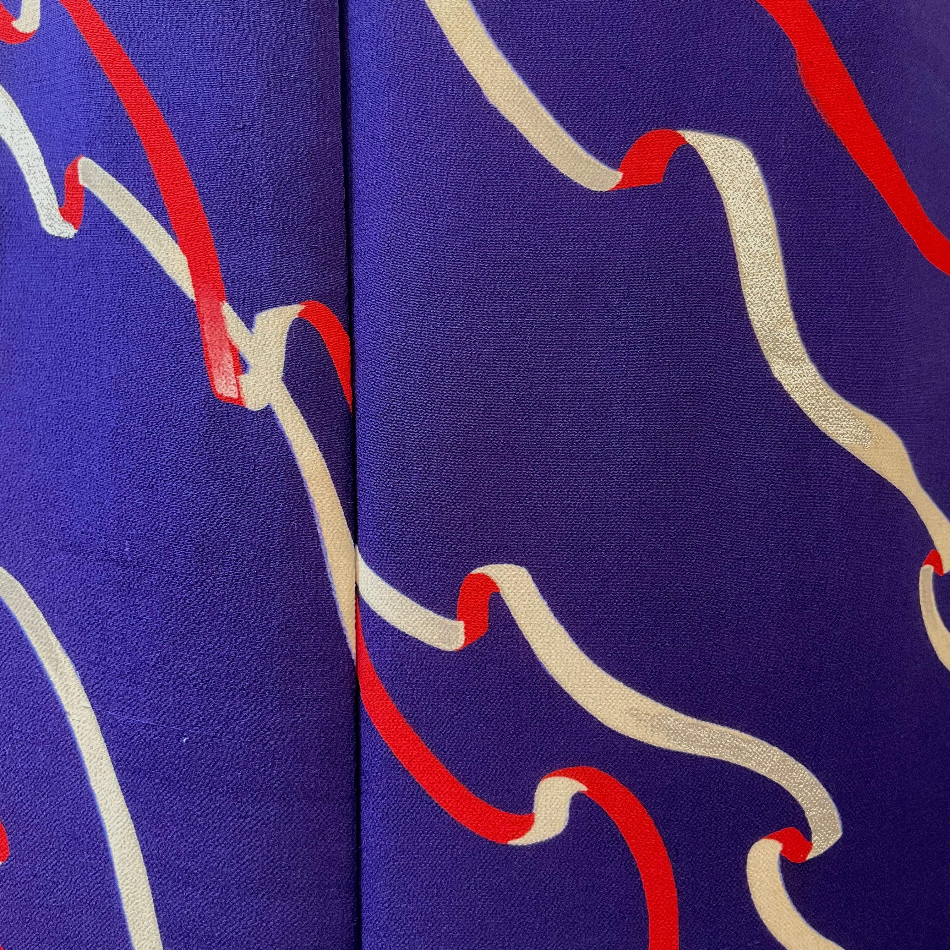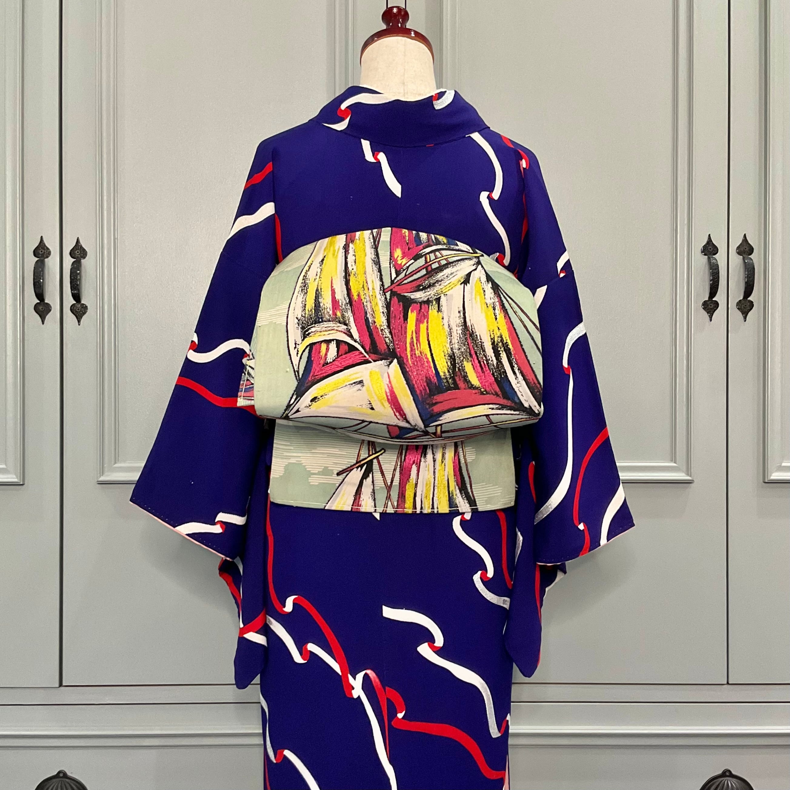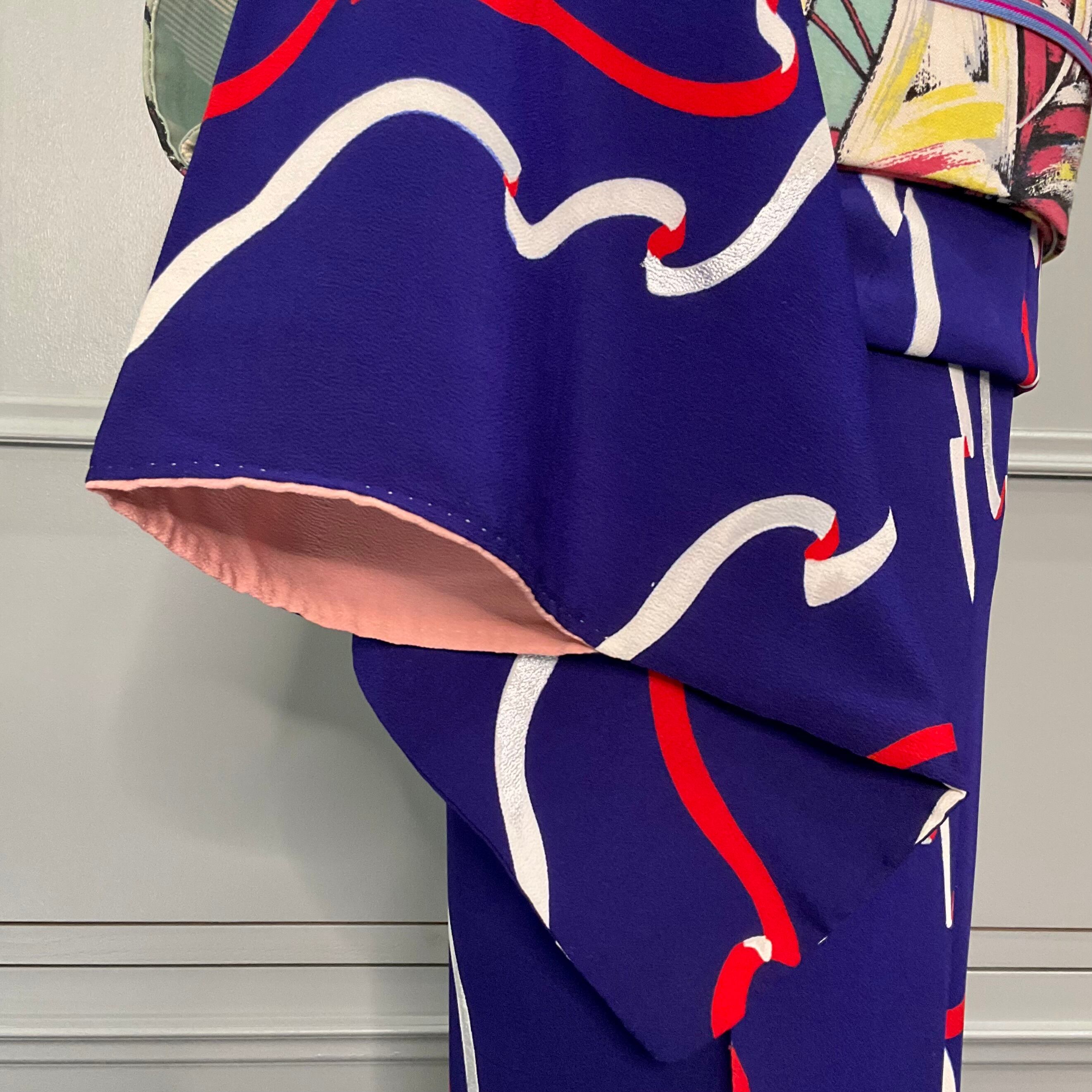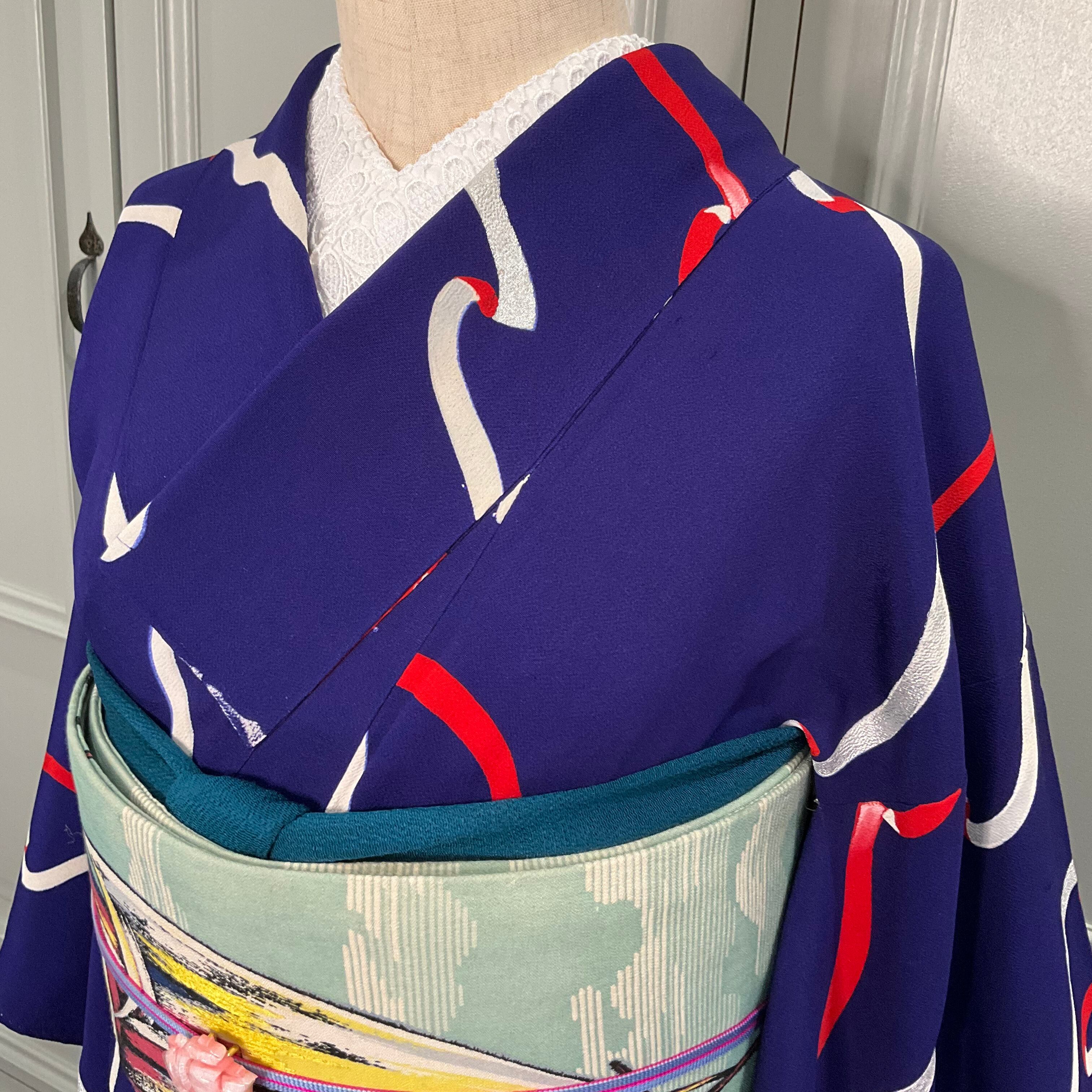 Ribbon Dance*リボン ネイビーブルー マリンカラー トリコロール 紺 赤 白 シルバー アンティーク小紋着物 B310