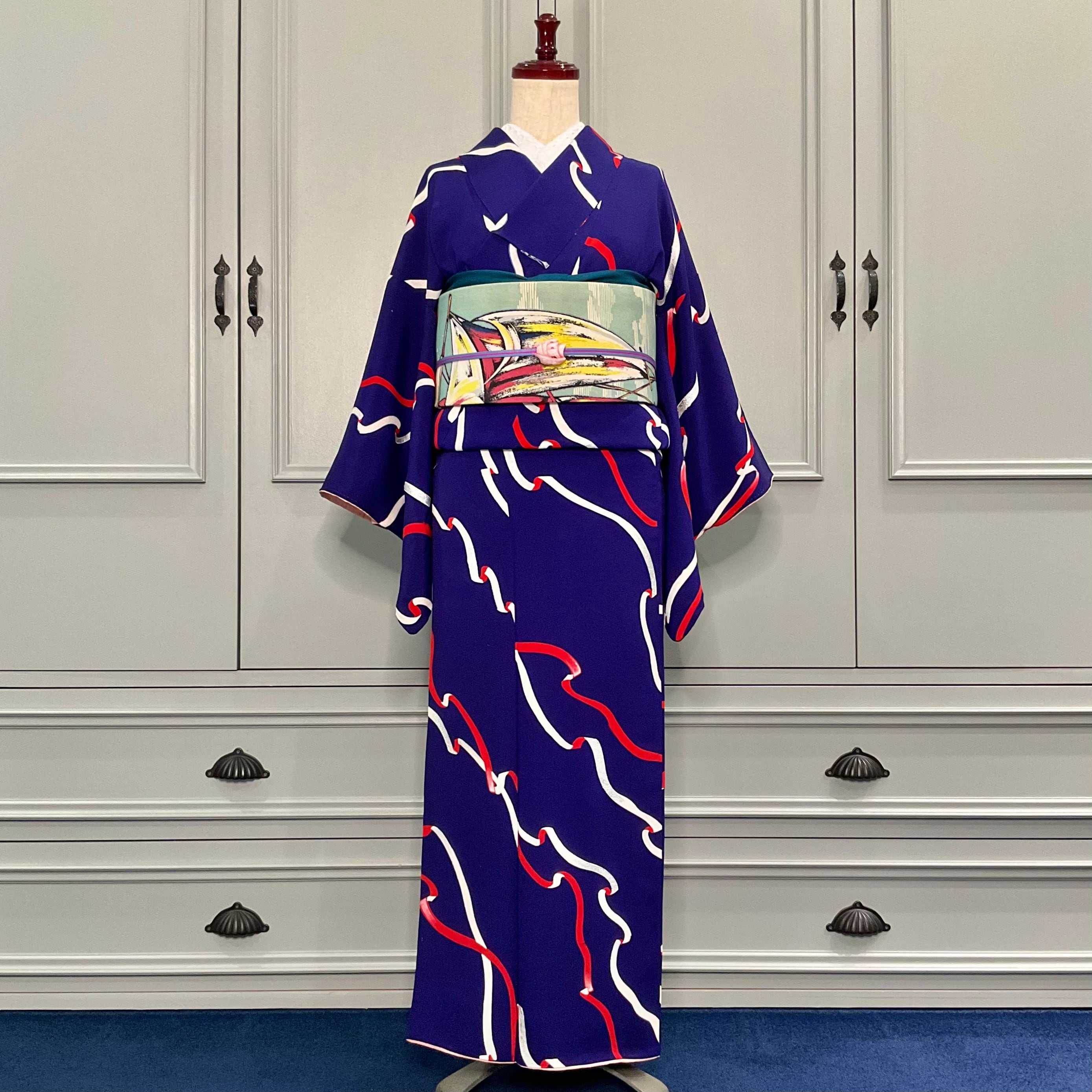 ネイビーブルー地に赤白シルバーのリボンが描かれた袷のアンティーク小紋着物です