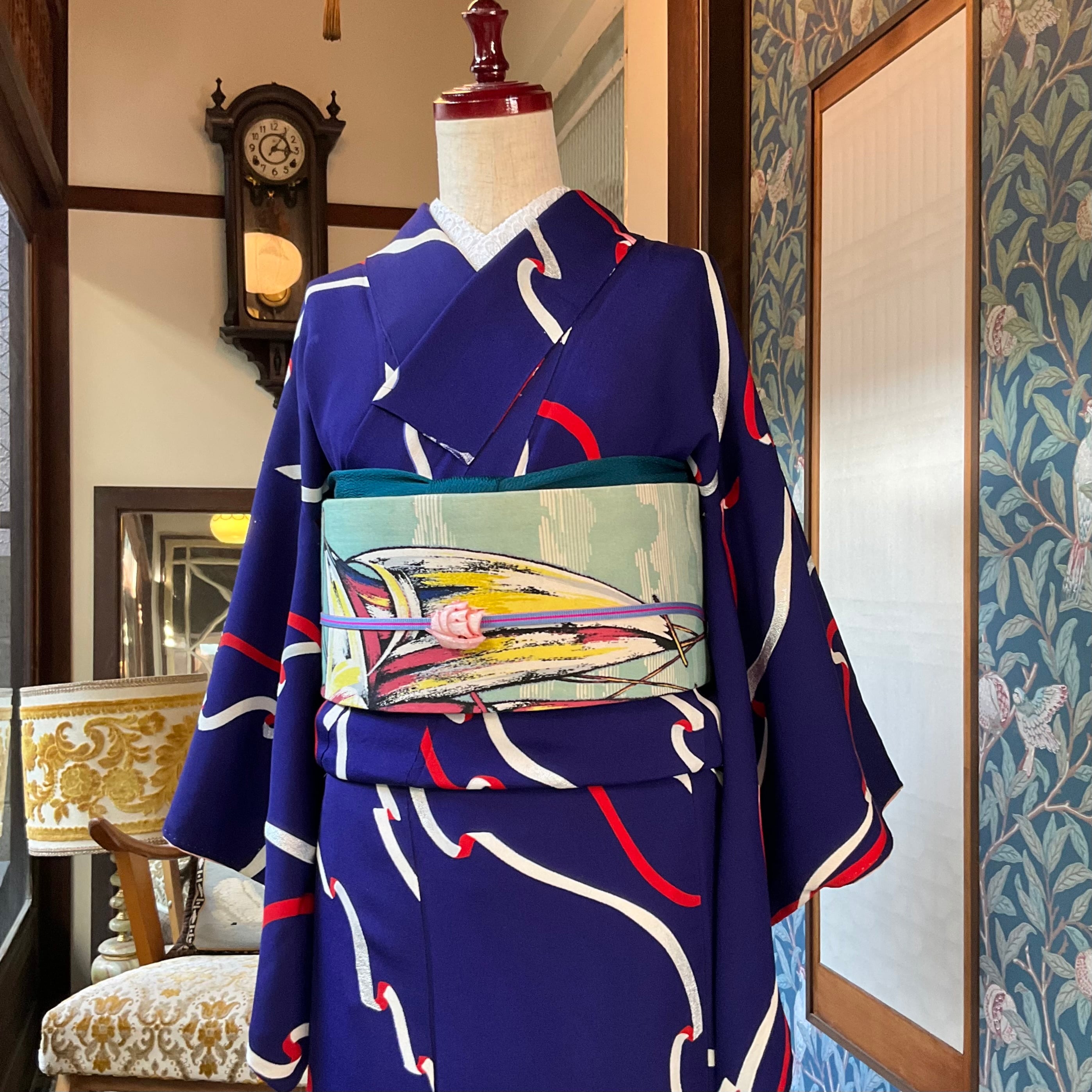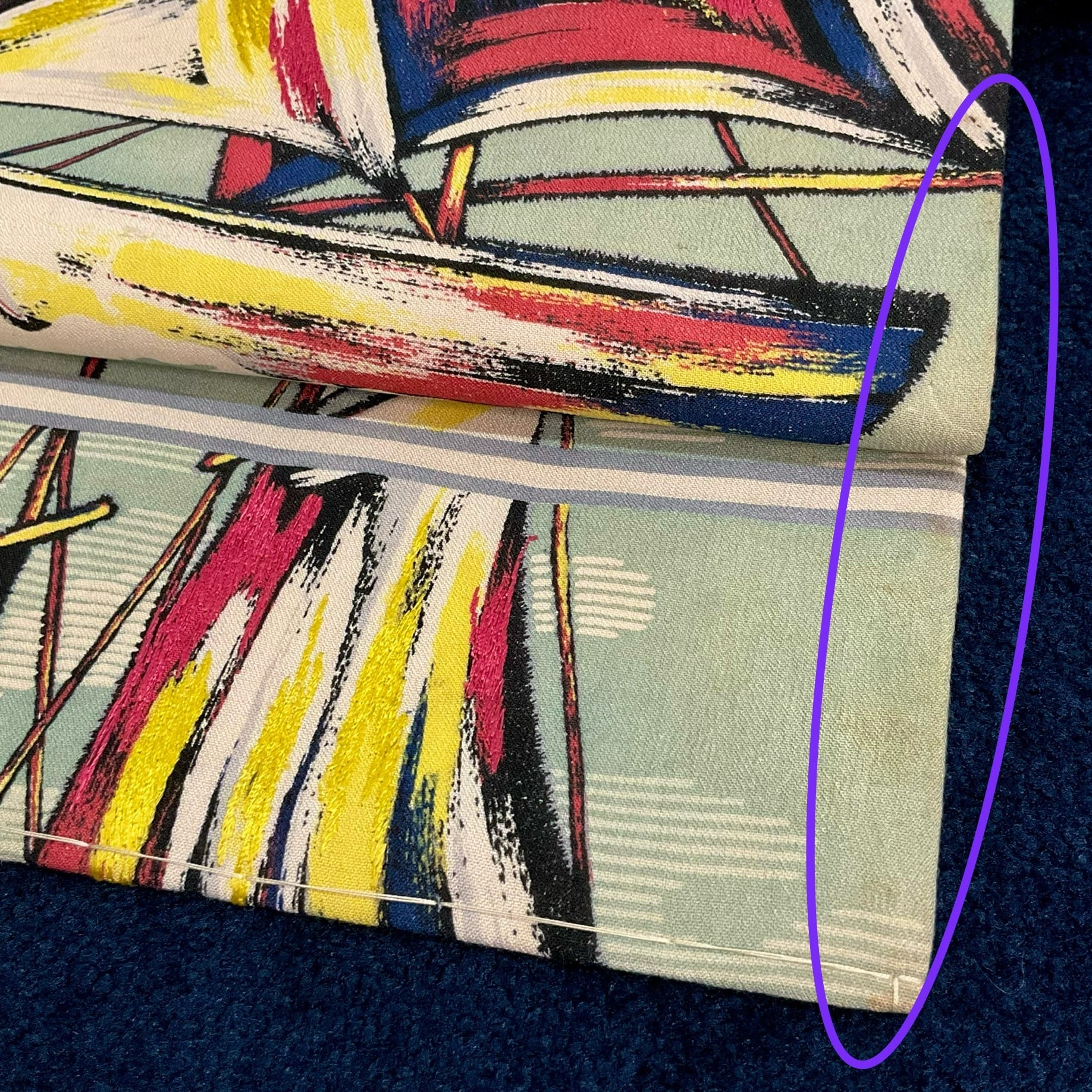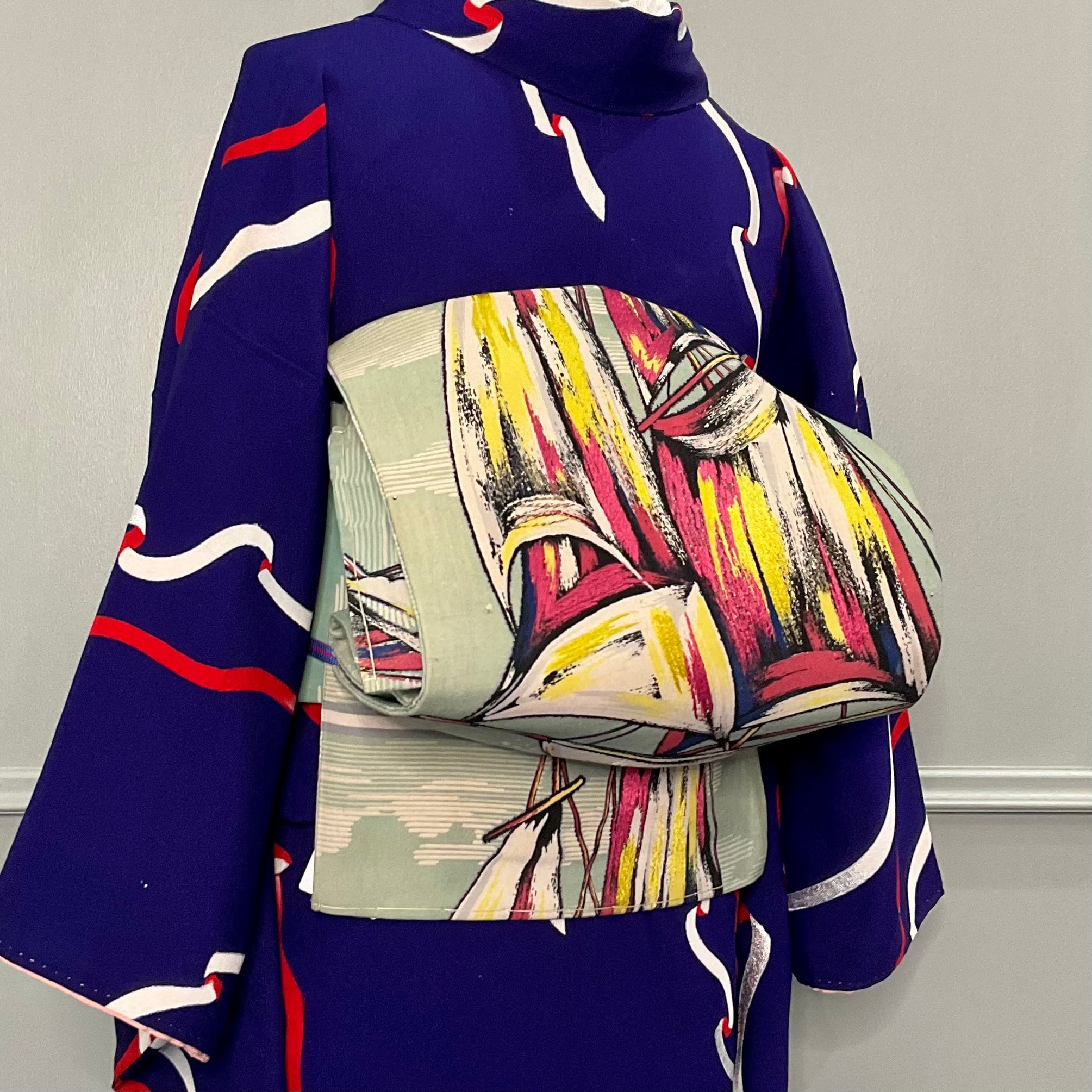 Retro Art Yacht*帆船 ふね ヨット 波 マリン クルーズ アート ミントグリーン 染め帯 刺繍 アンティーク名古屋帯 B311