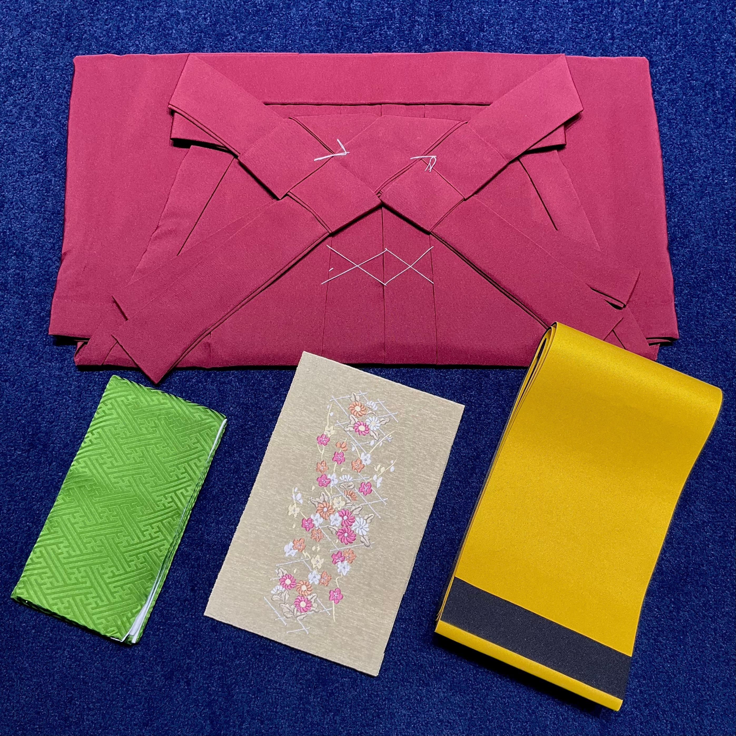 ○セット内容は、着物、袴、帯、刺繍半衿、重ね衿の5点になります