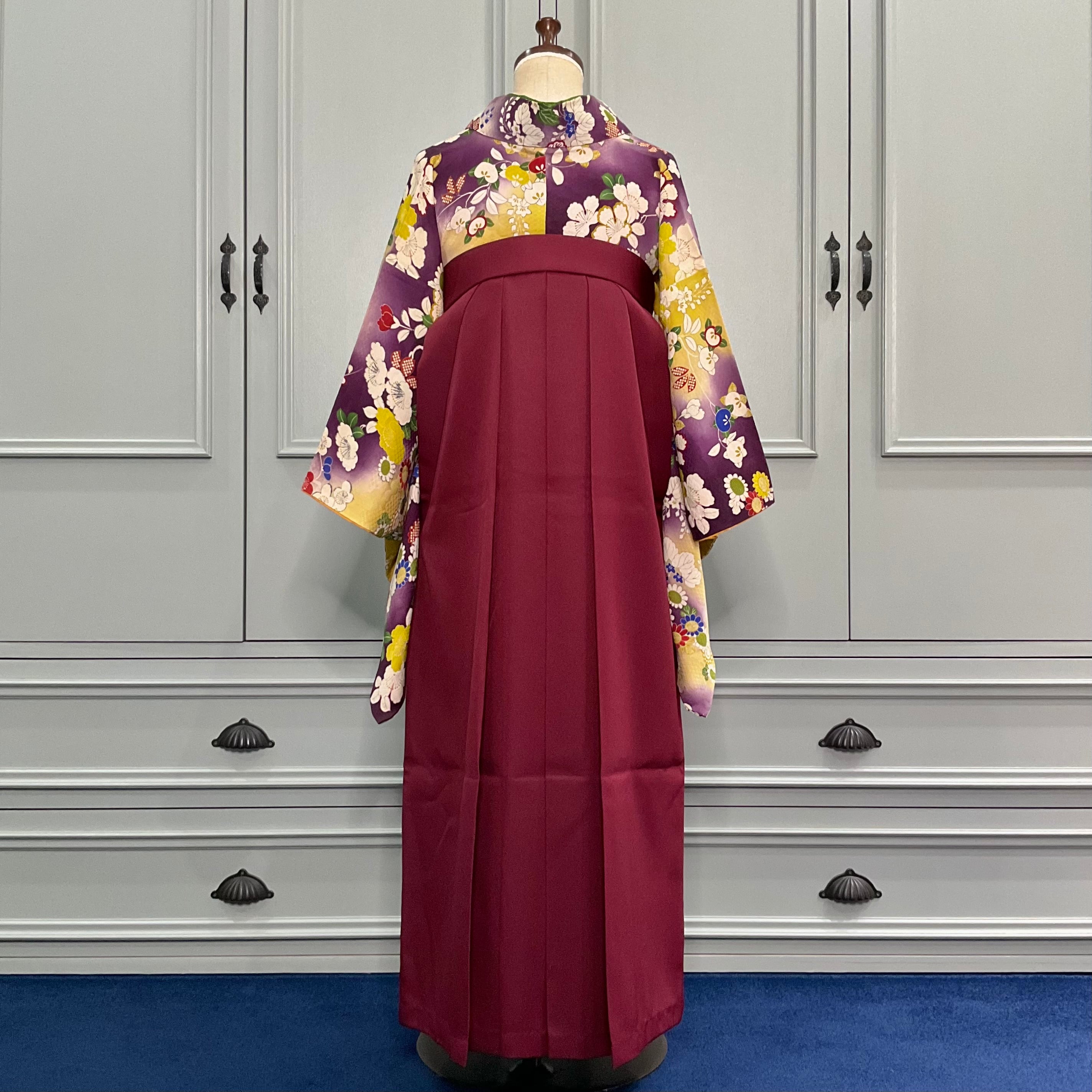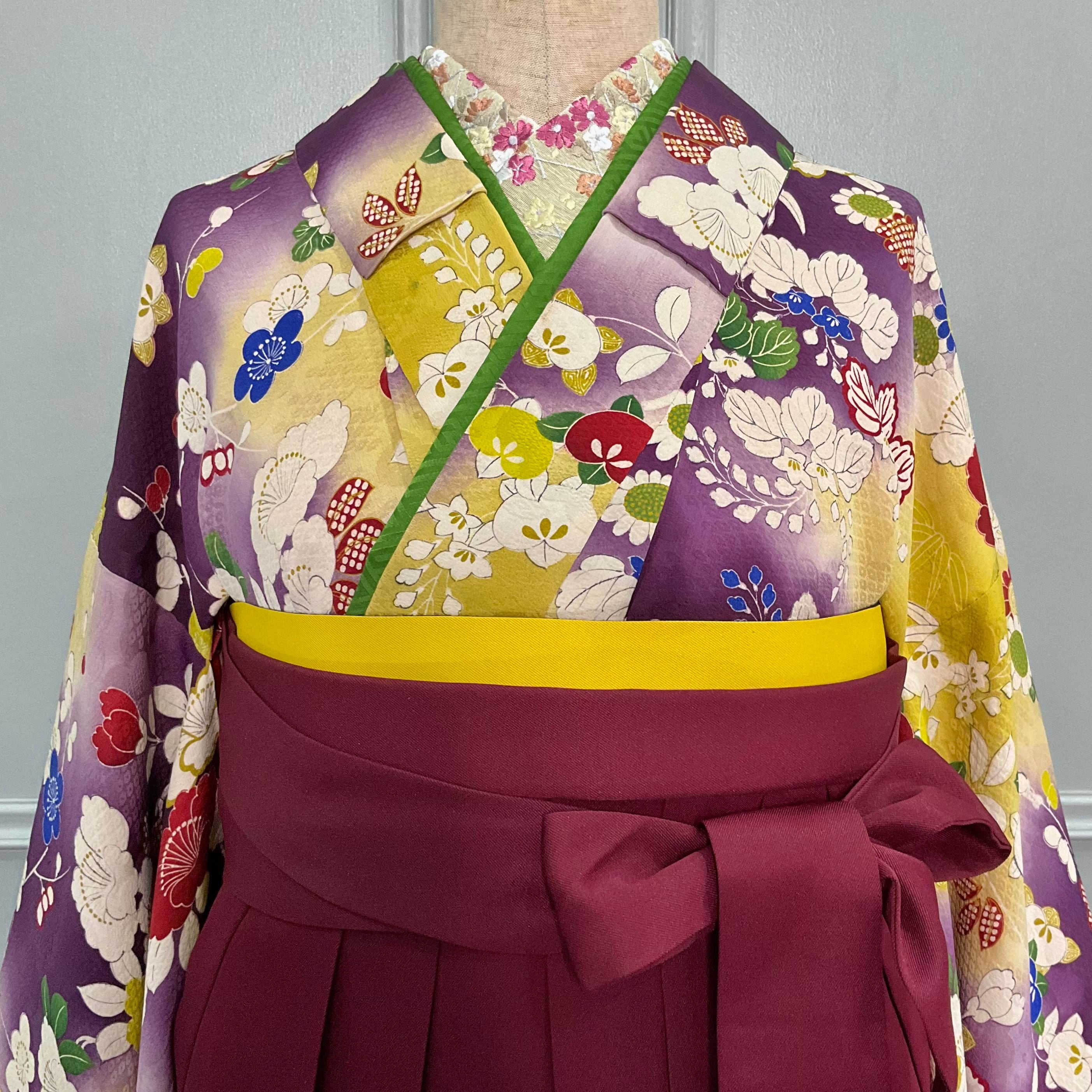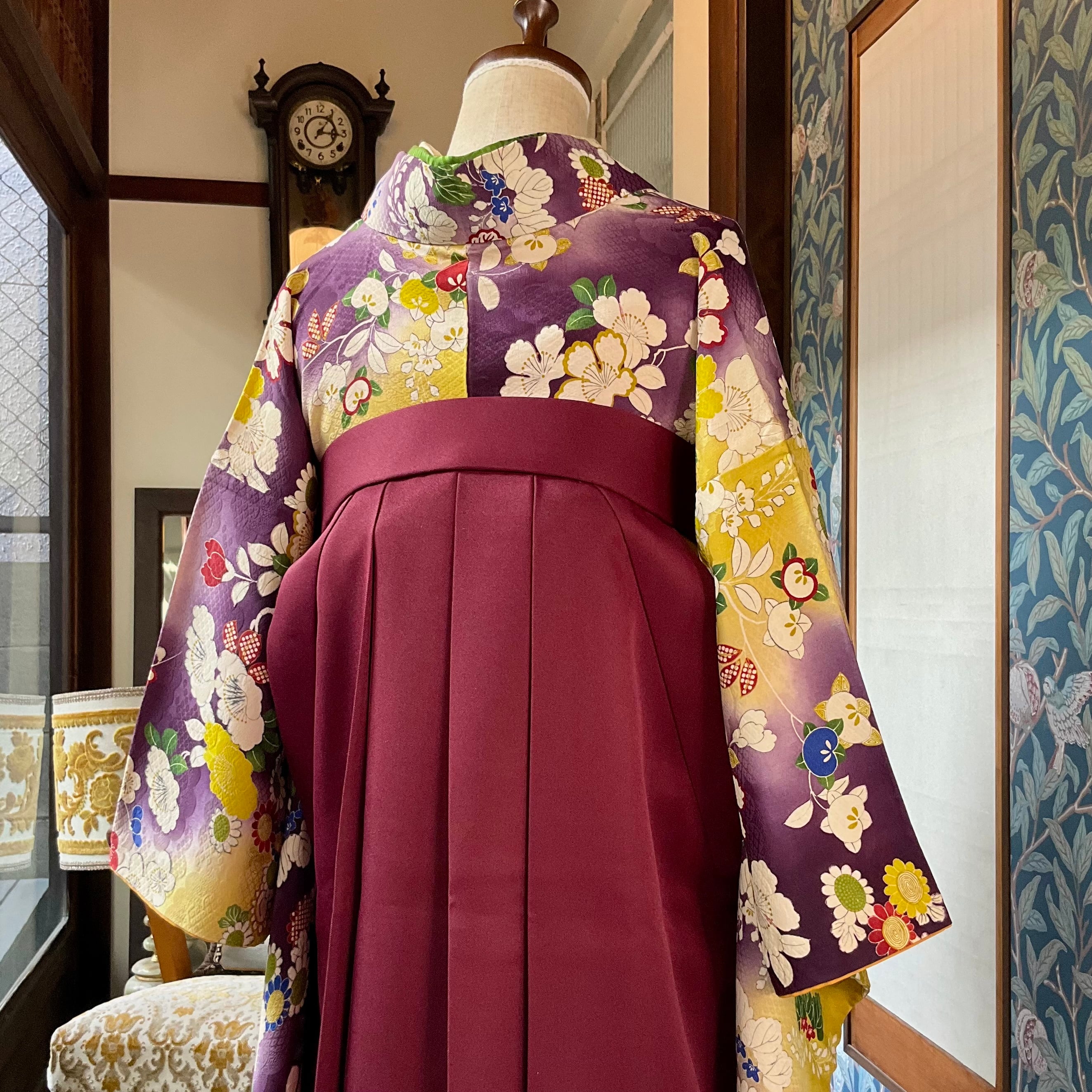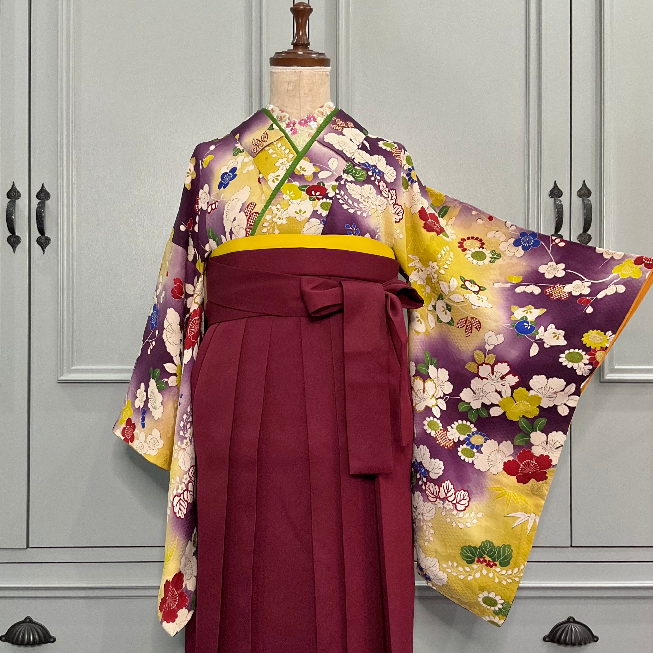 紫雲花衣*はかま5点セット 着物+袴+半幅帯+半衿+重ね衿 袴 暈し 紫 辛子 黄色 花 卒業式 アンティーク小紋着物 B308