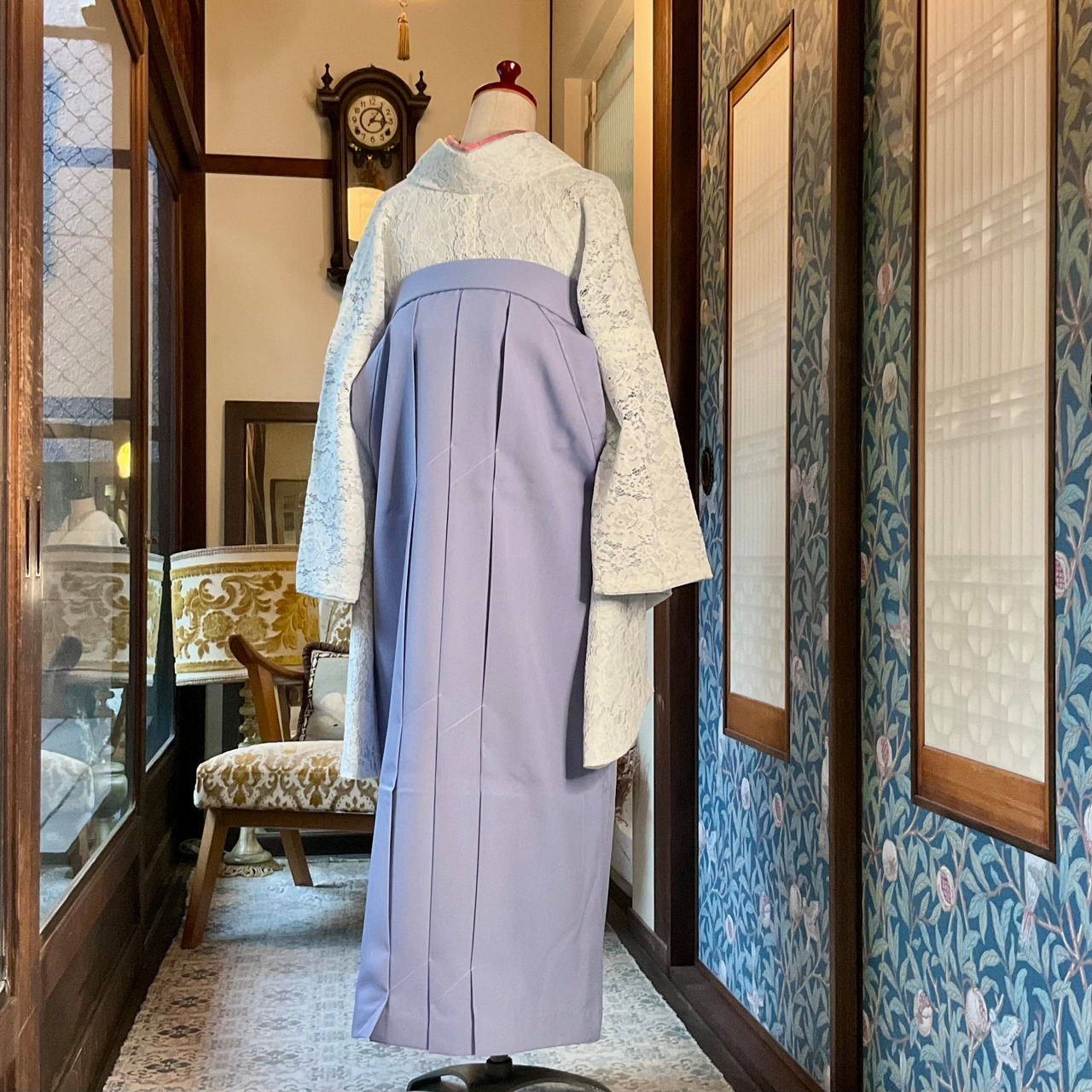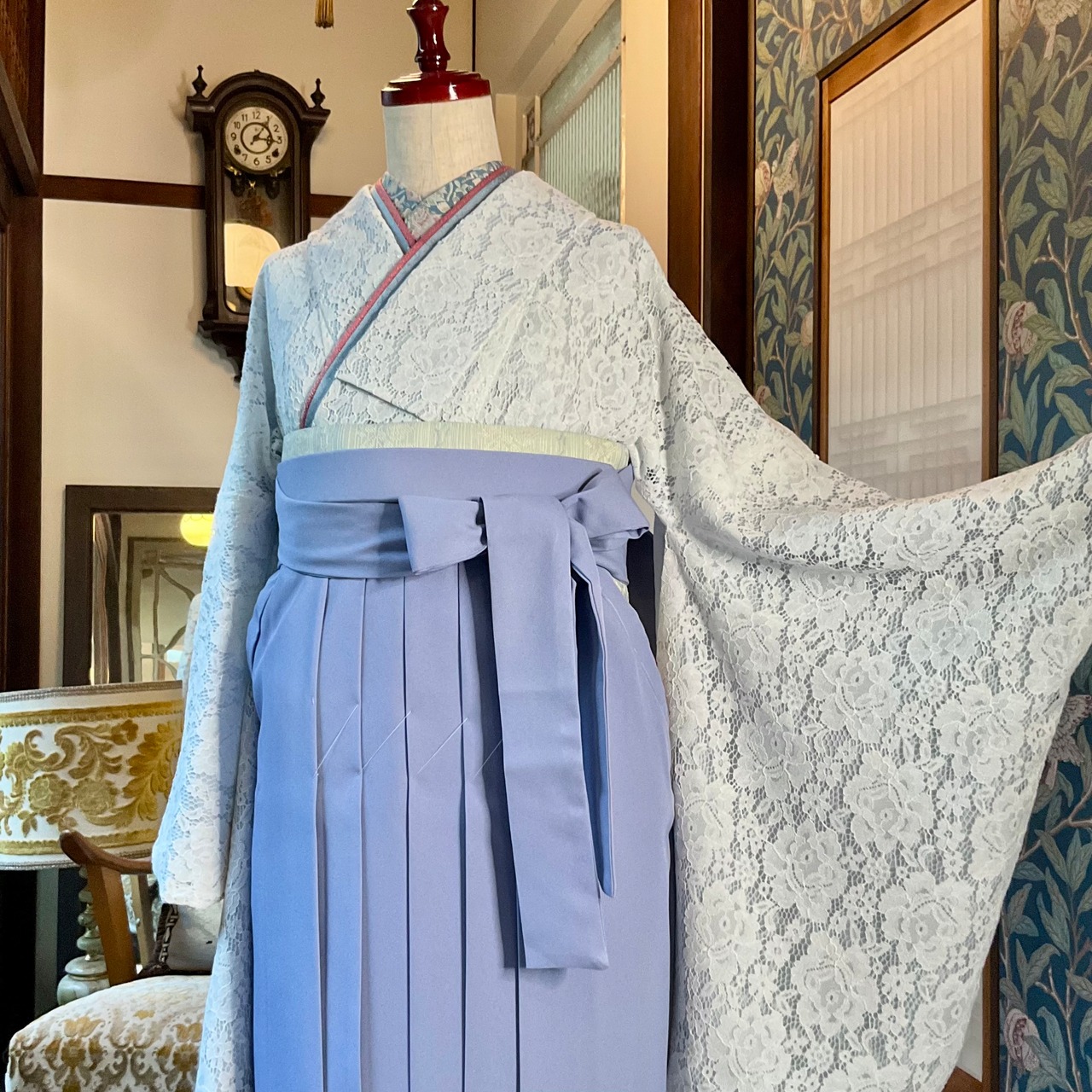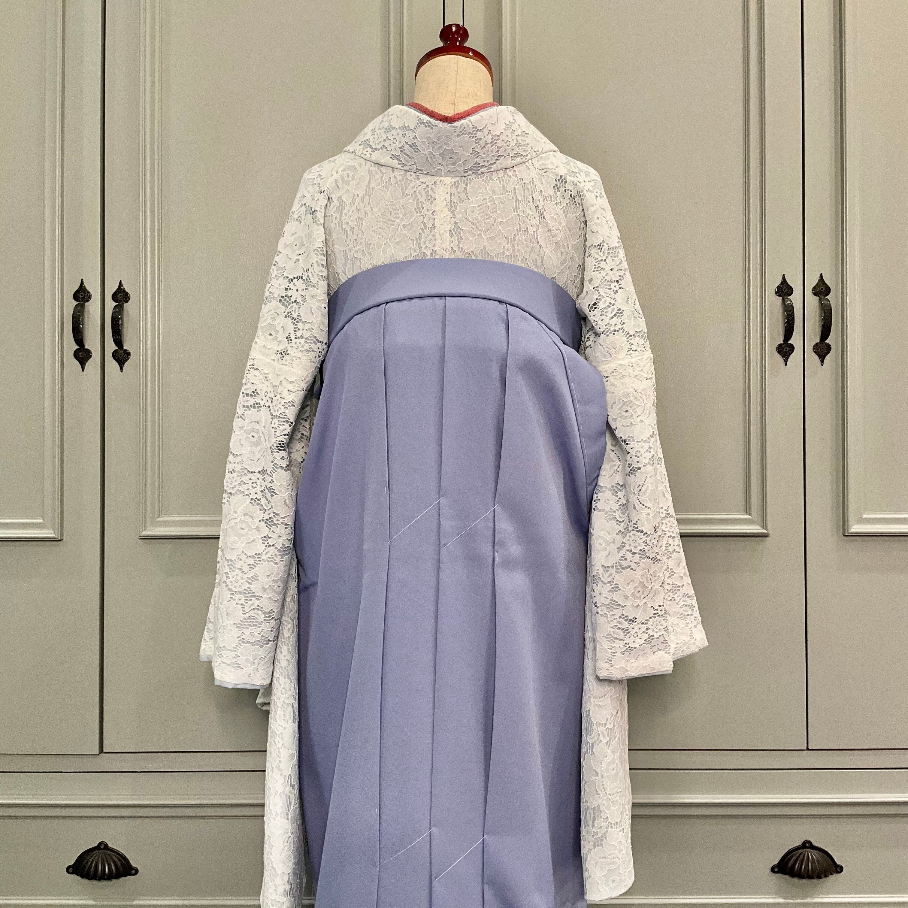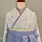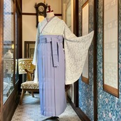 ホワイト×ライトグレーのお花レースの袷の小紋着物に、ライトサックスブルー系のニュアンスカラーな袴を合わせました♩