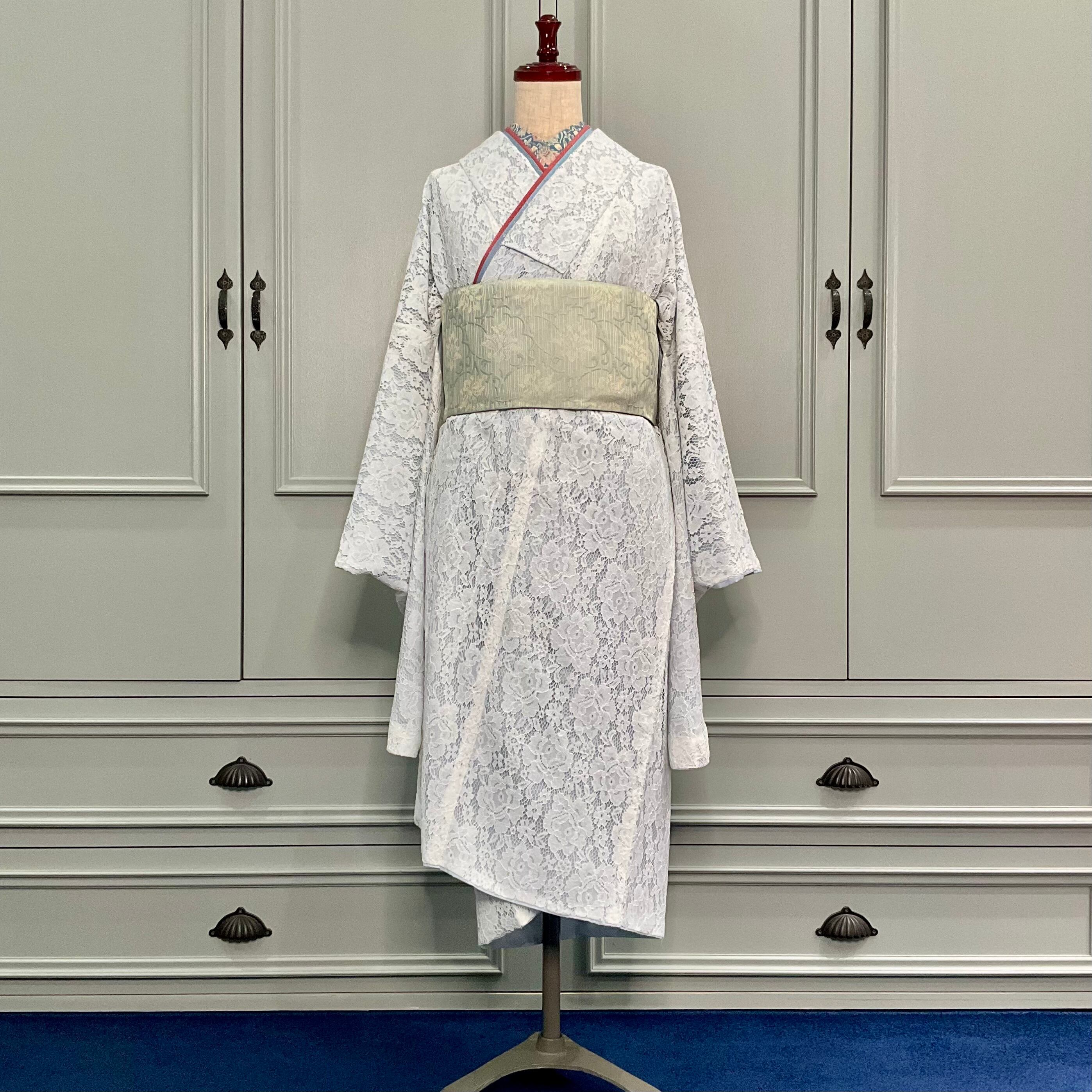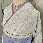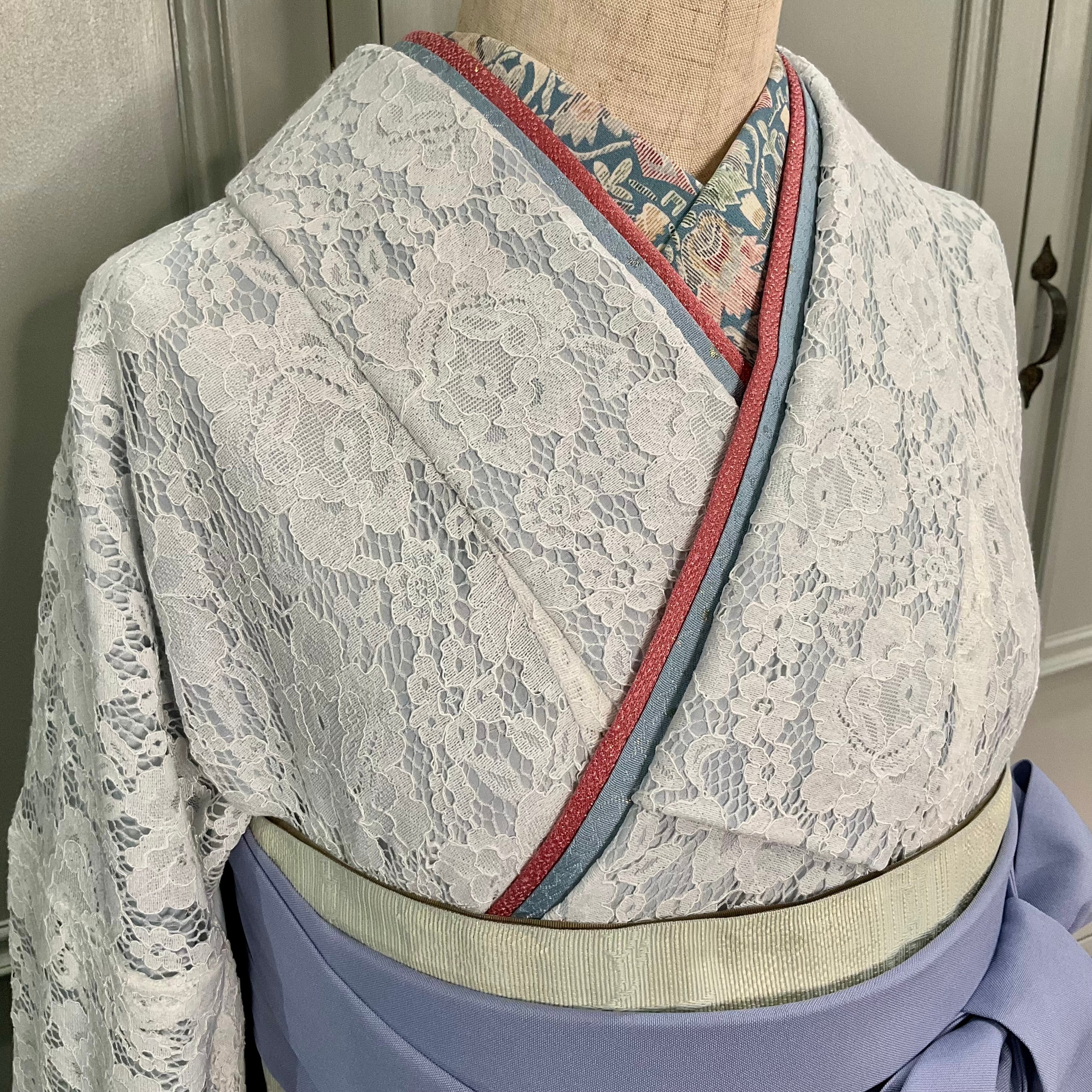 着物は、淡色カラーのレース生地が上品な一着♡二尺袖で、お袖がたっぷり長く、丸い袖のフォルムもかわいらしいです♡