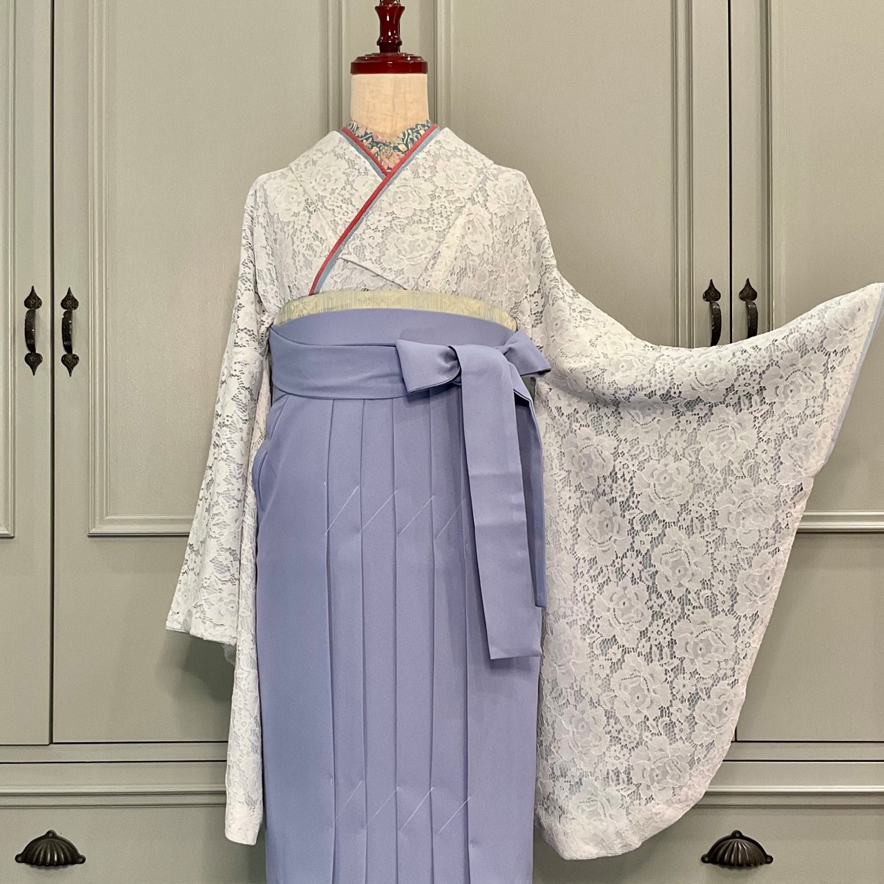 mist gray lace*はかま5点セット 着物+袴+半幅帯+半衿+重ね衿 レース ホワイト ライトグレー 白 袴 卒業式 リサイクル小紋着物 B309