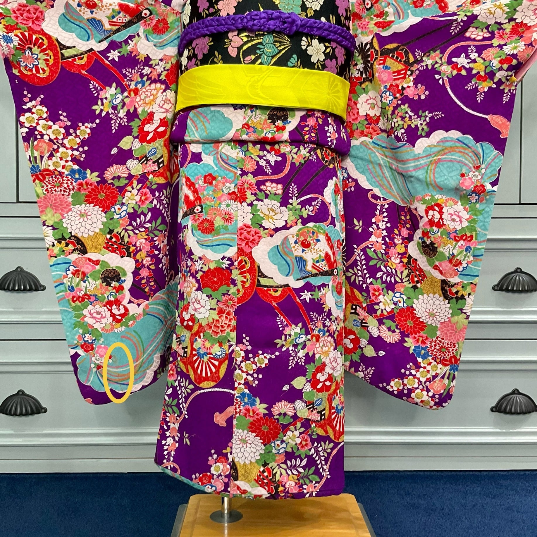 アンティークらしい紫の大人っぽい地色に、水色の雲取りの差し色が目を惹きますね♪