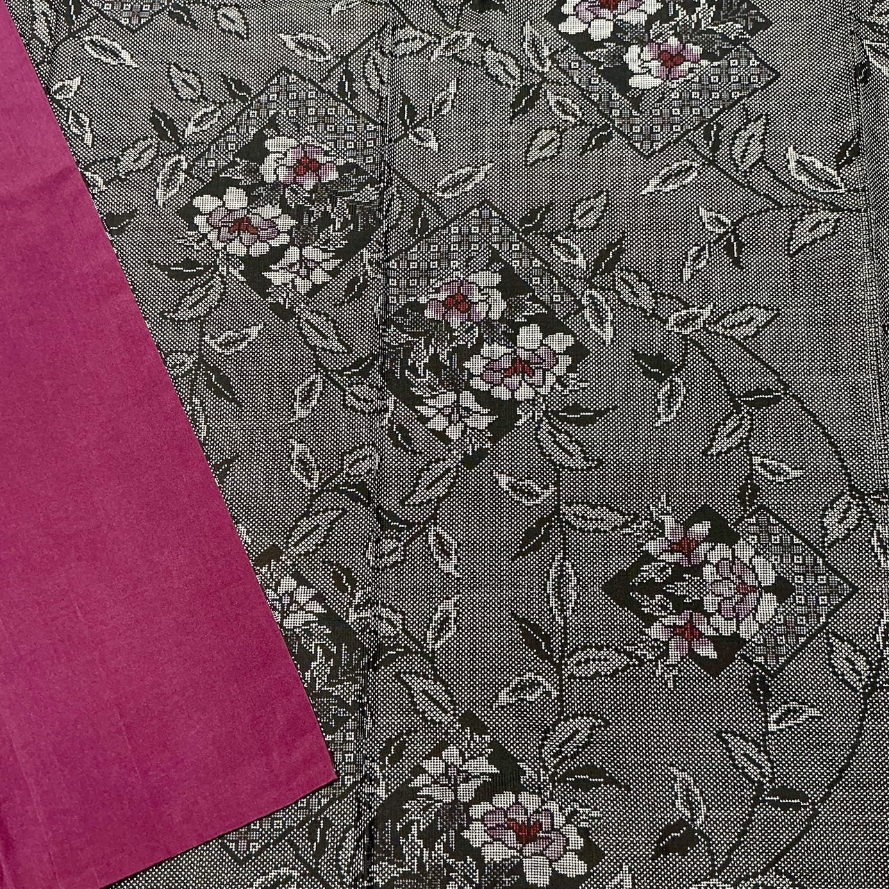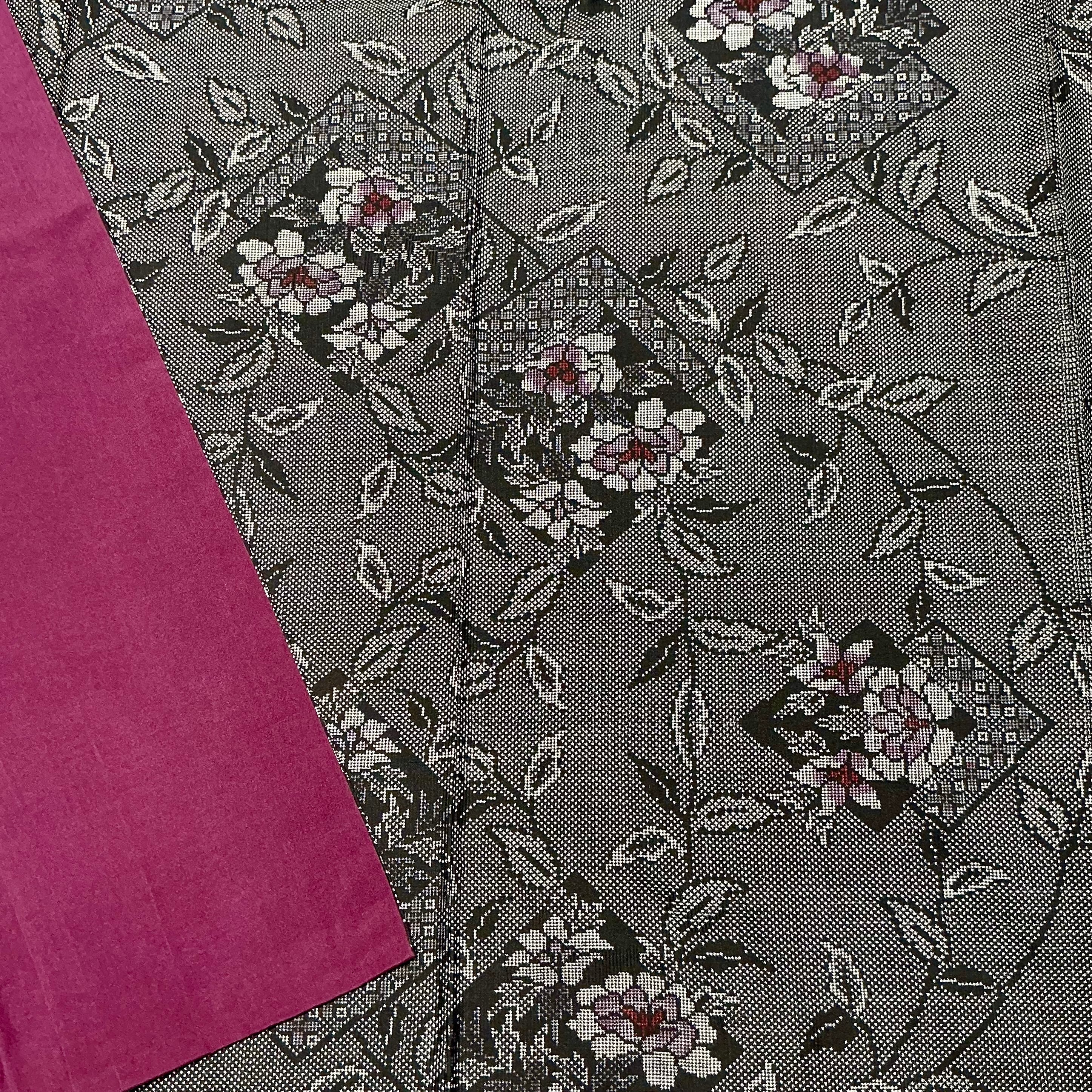 墨黒の地色に葉、花に菱模様がデザインされた本場大島紬の着物です