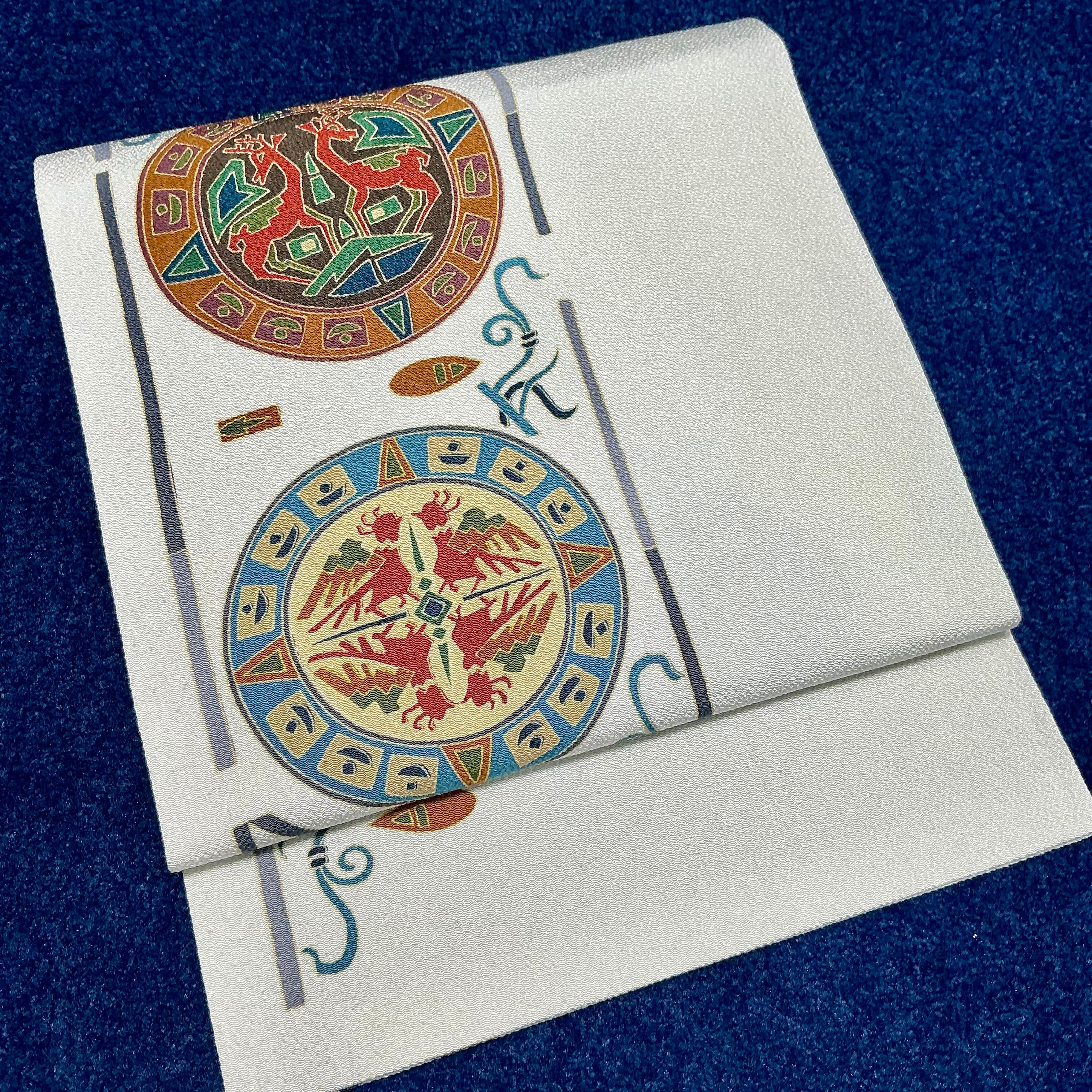 パールホワイトの地色に丸く鹿のモチーフが描かれたちりめん地の名古屋帯です