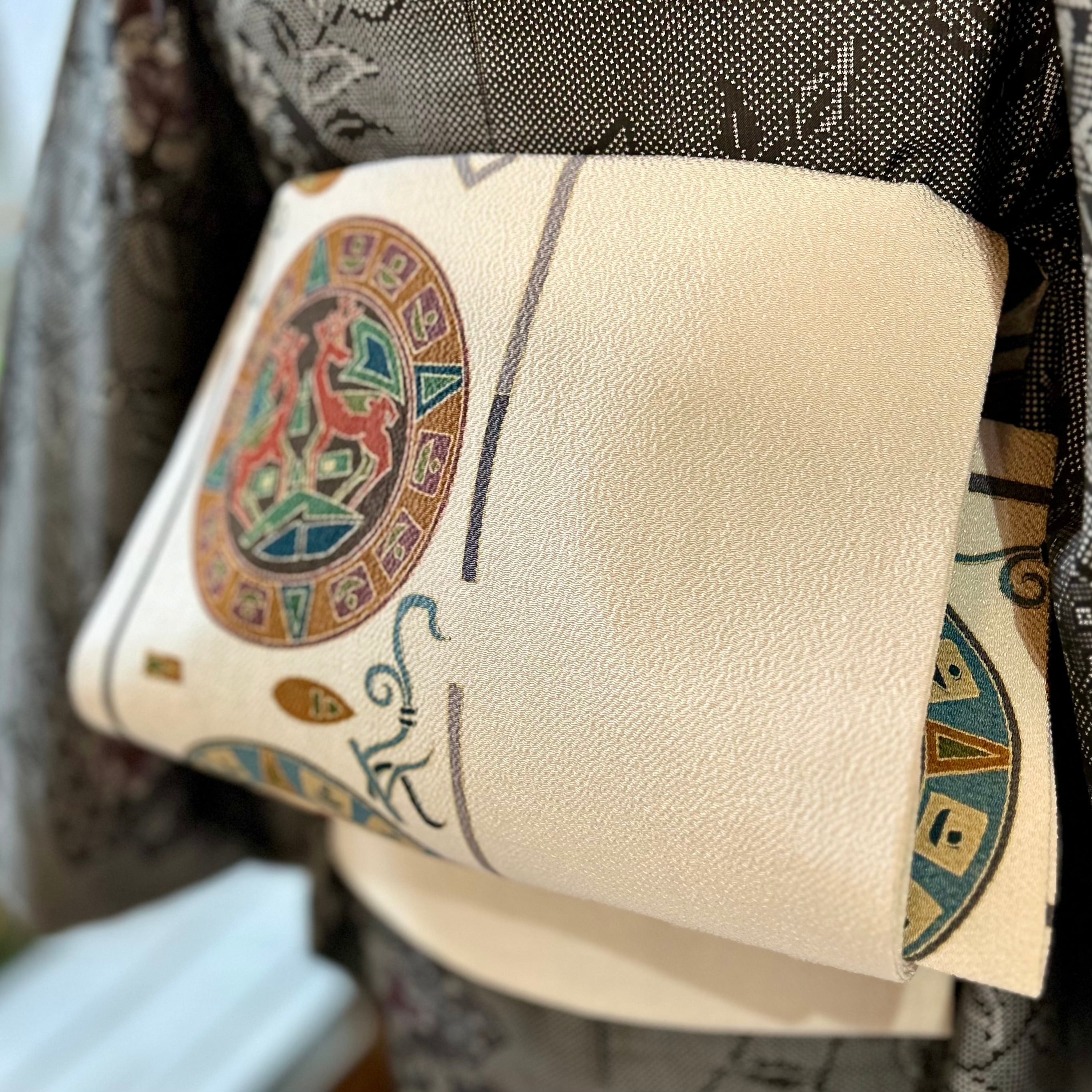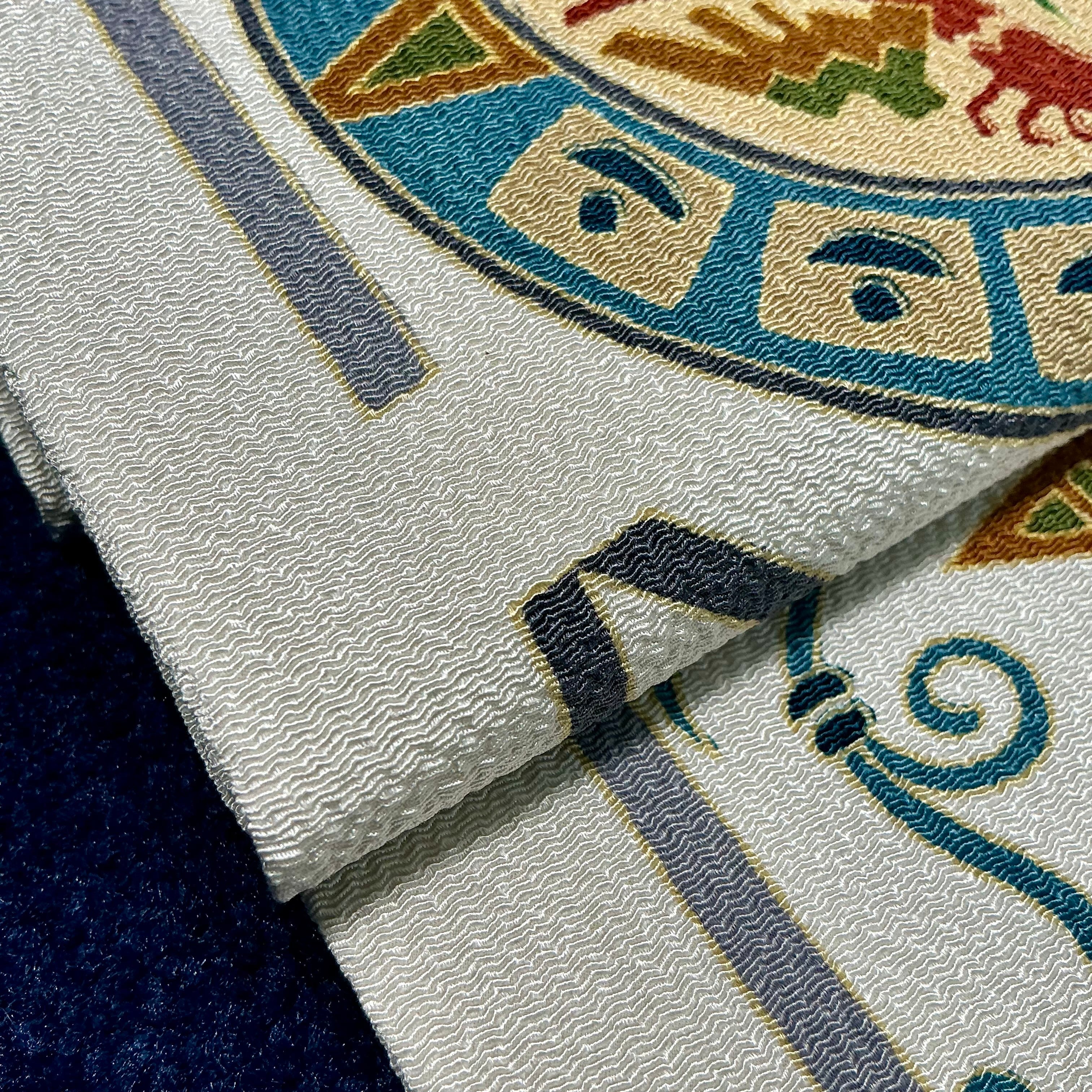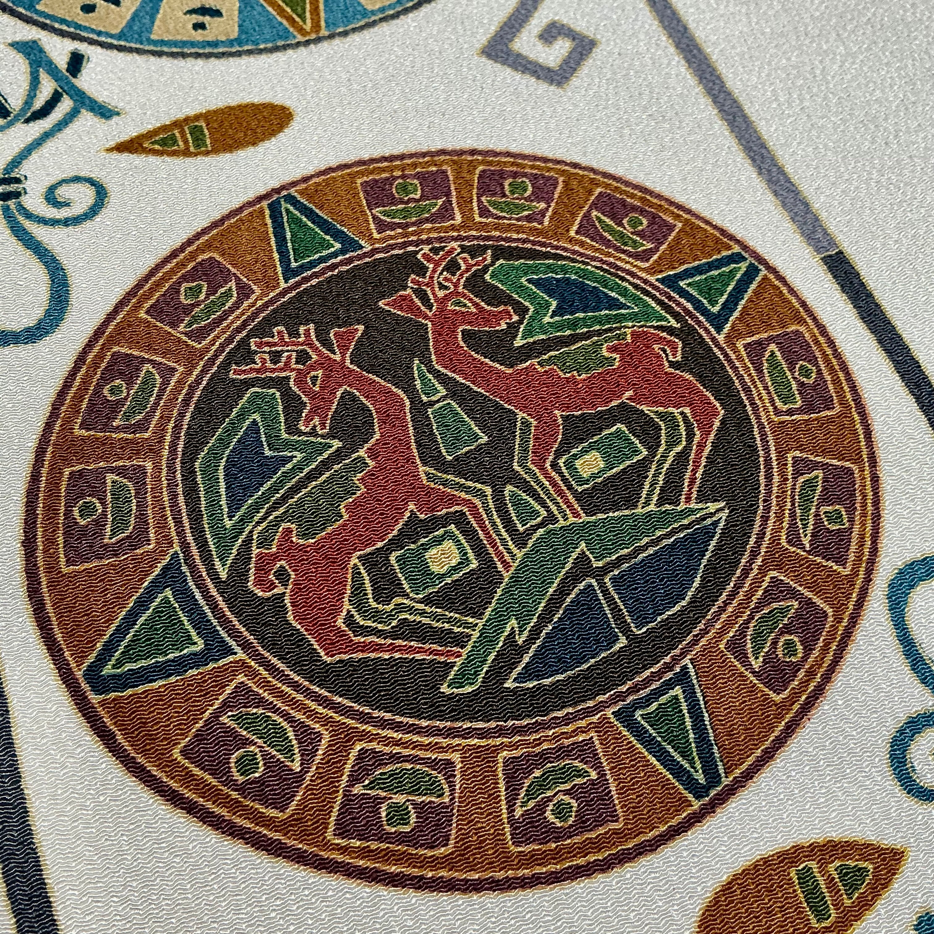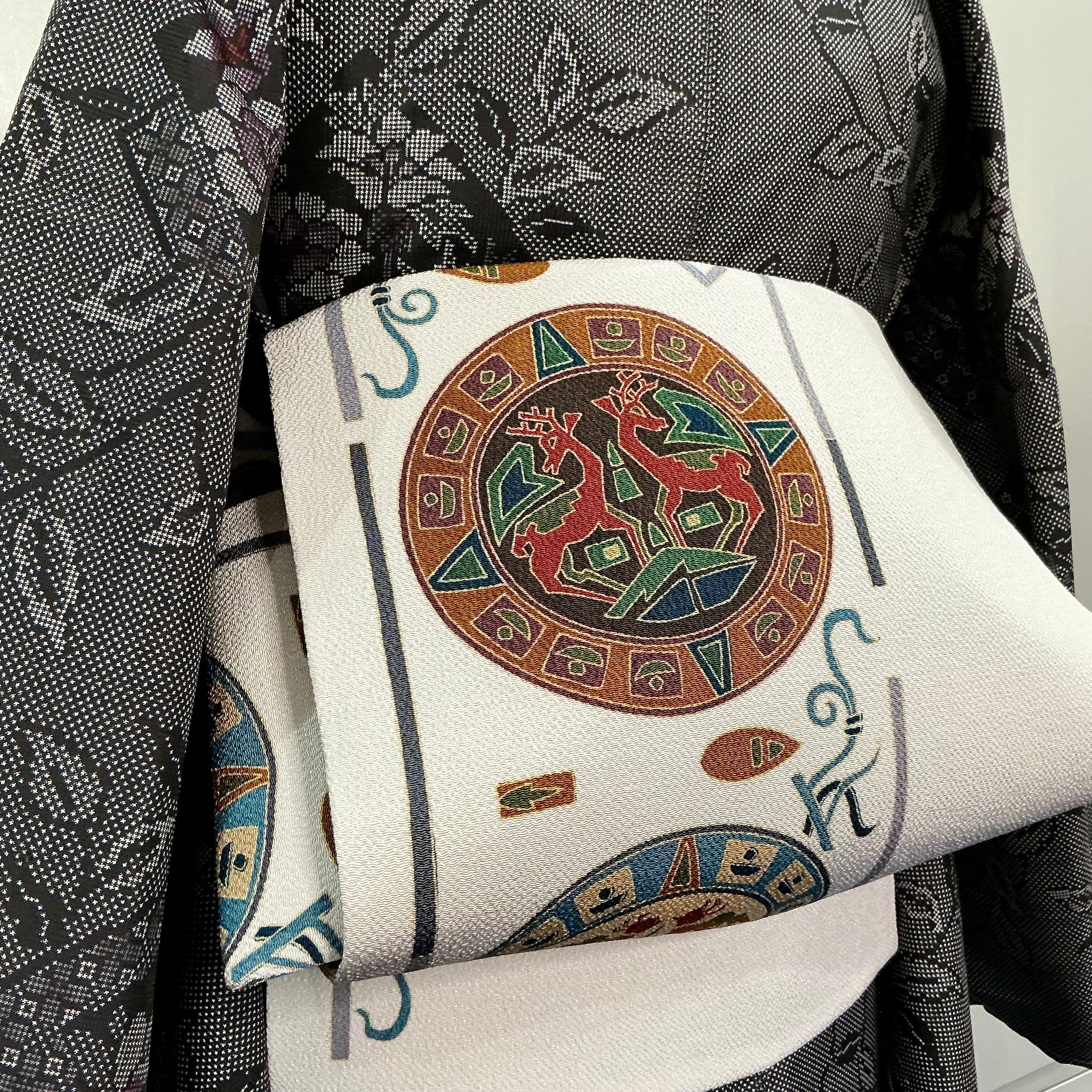 ふっくらとシボを帯びたちりめん地に、動物のモチーフ、幾何学的なデザインがオリエンタルな雰囲気も感じさせ素敵ですね✨
