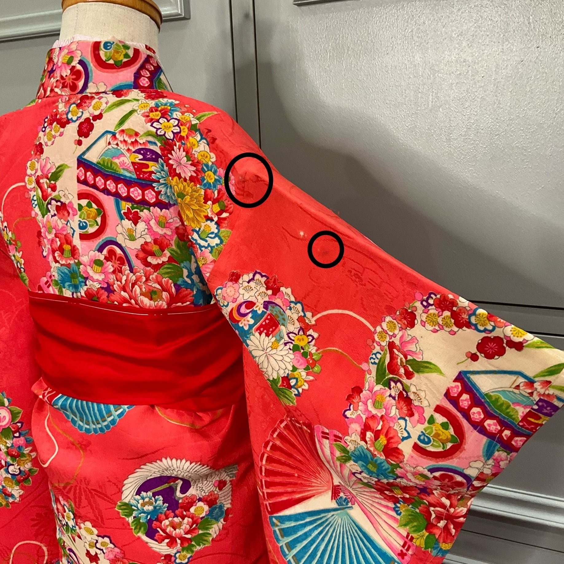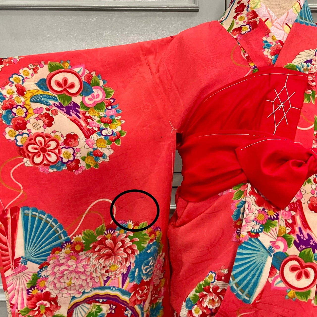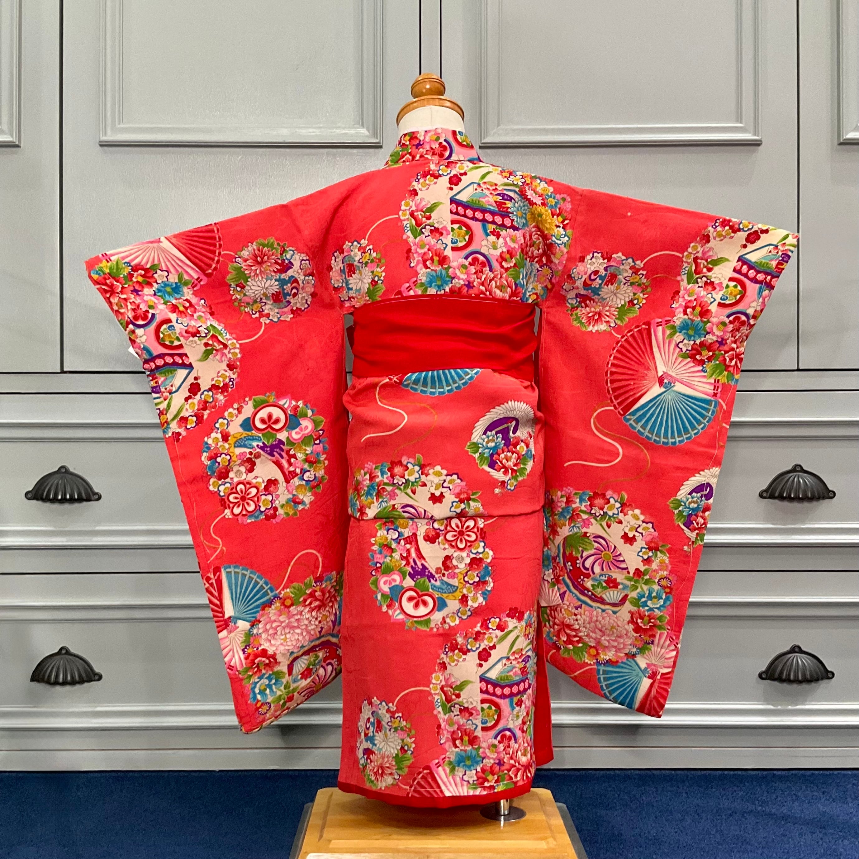 アンティーク着物らしい鮮やかなピンク地に、色とりどりの鈴や手鞠のようなモチーフ、扇子を型どった花薬玉が可愛らしいデザインの一着✨